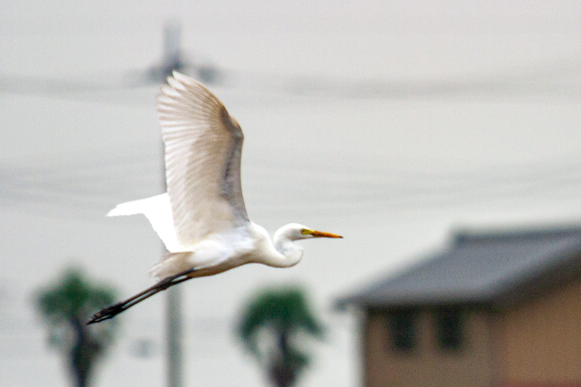 帰り際、シラサギを見つけたので、しばらくにらめっこをしていましたが、飛んでいかれてしまいました。飛んでいる鳥を撮るのは、私には無理のようですね。(^_^;)(EOS D60)