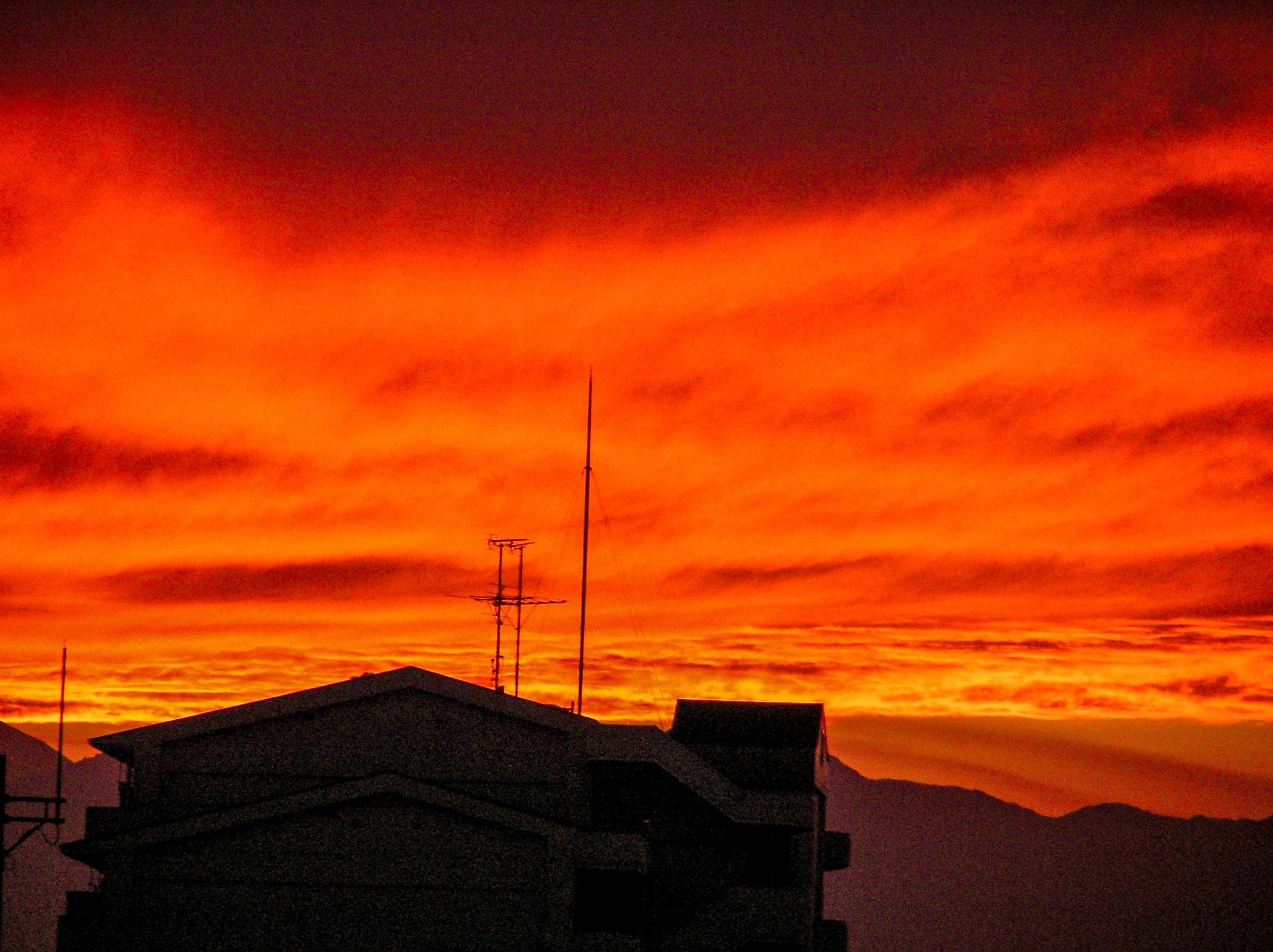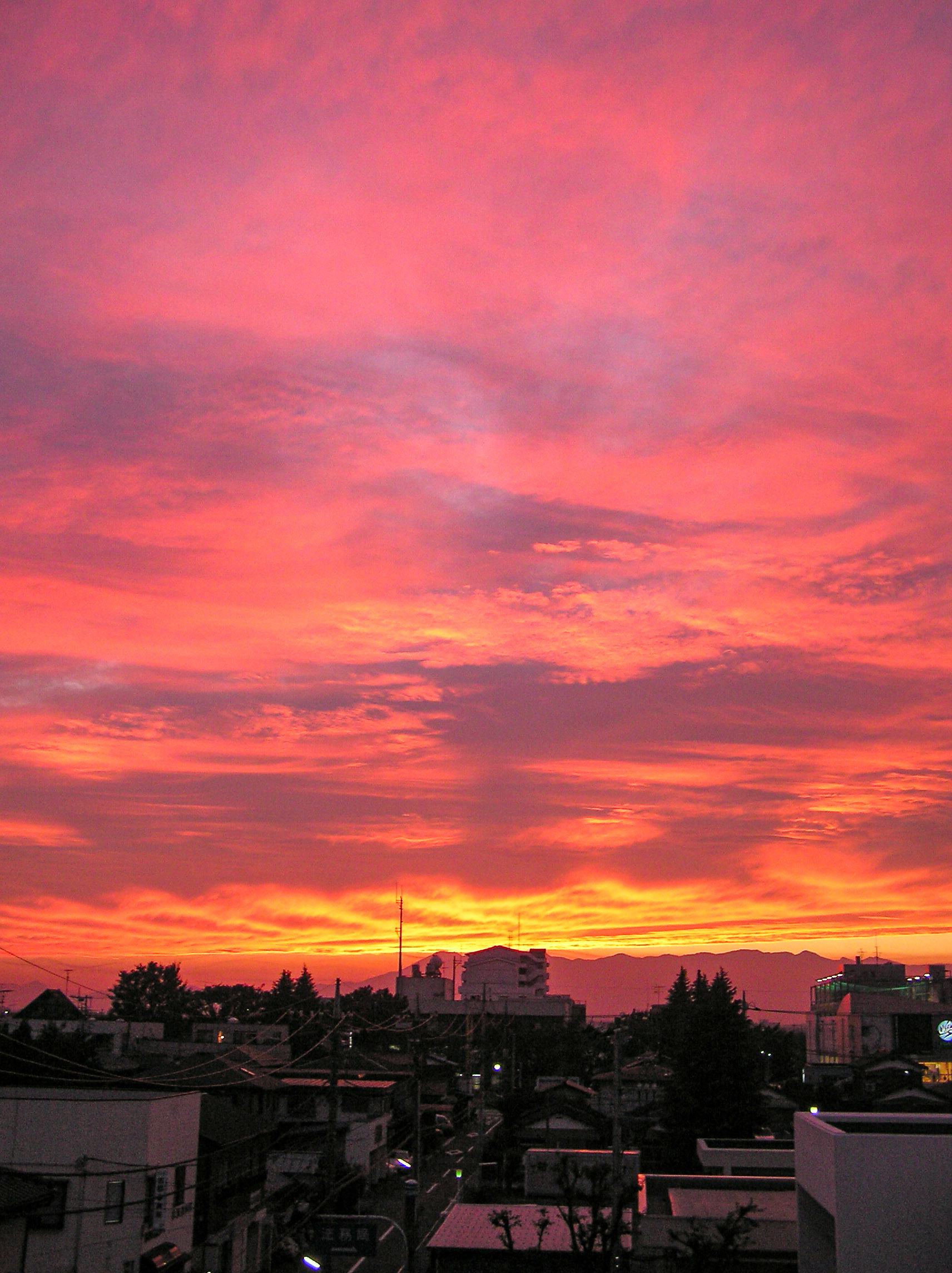 仕事の帰り、思わず夕焼けに出くわしました。何と久しぶりなんでしょう。昨日は晴天でしたが、今日はどんよりで天気予報は「ハズレ」でしたが、夕焼けがこんなに美しく見られるなんて、ラッキーでした。でも、この光景はあっという間に、日暮れとともに去っていってしまったのでした。