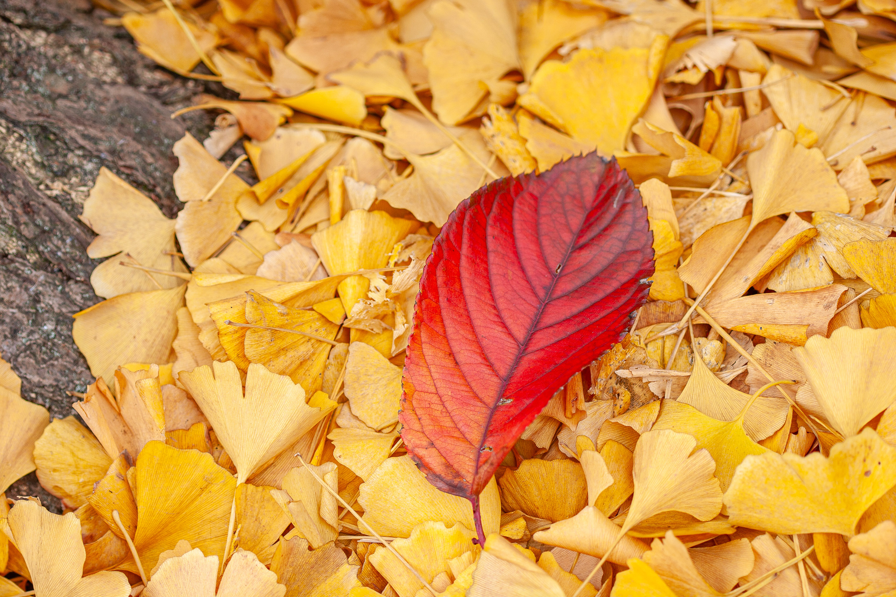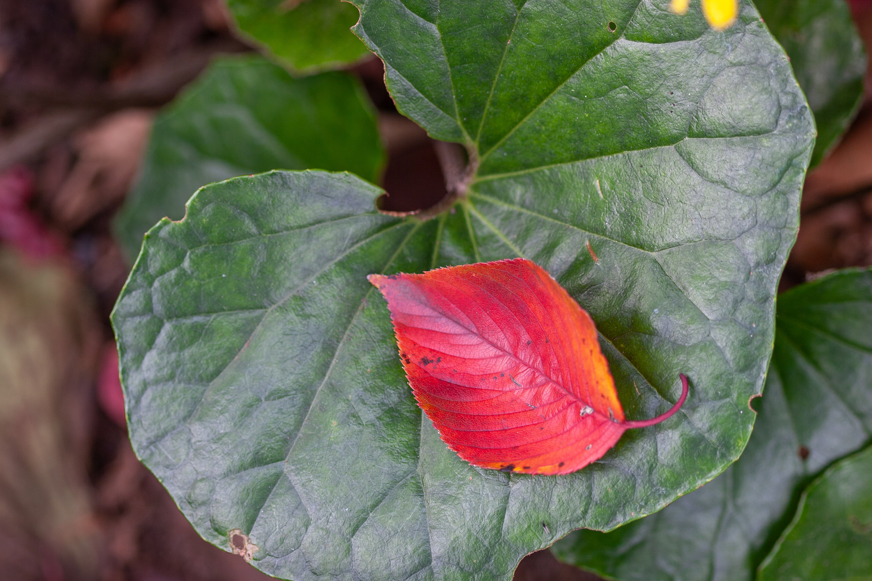 今回は、試し撮りでしたので、ヤラセで、わざと赤い葉っぱを緑や黄色の葉の上に乗せて、撮っています(^_^;)。(EOS