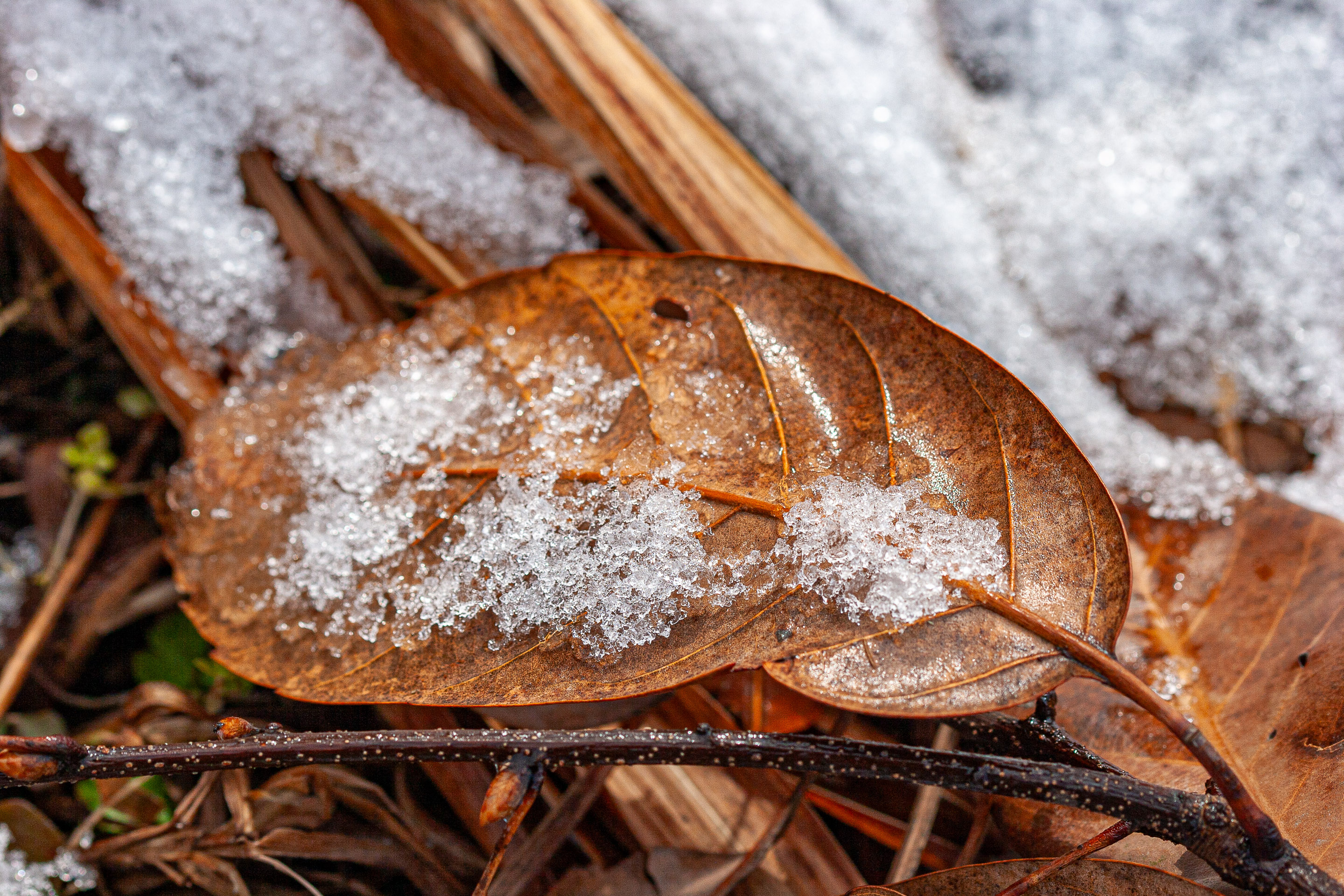 午前中と夕方に少しばかり撮影してみました。昨日の雪が枯葉や池の氷の上にザラメのように残っていました。春のきざしは見つからないかと探してみましたが、まだ、季節は冬のままです。梅の木はさすがに花をつけていましたが、寒そうな印象です。