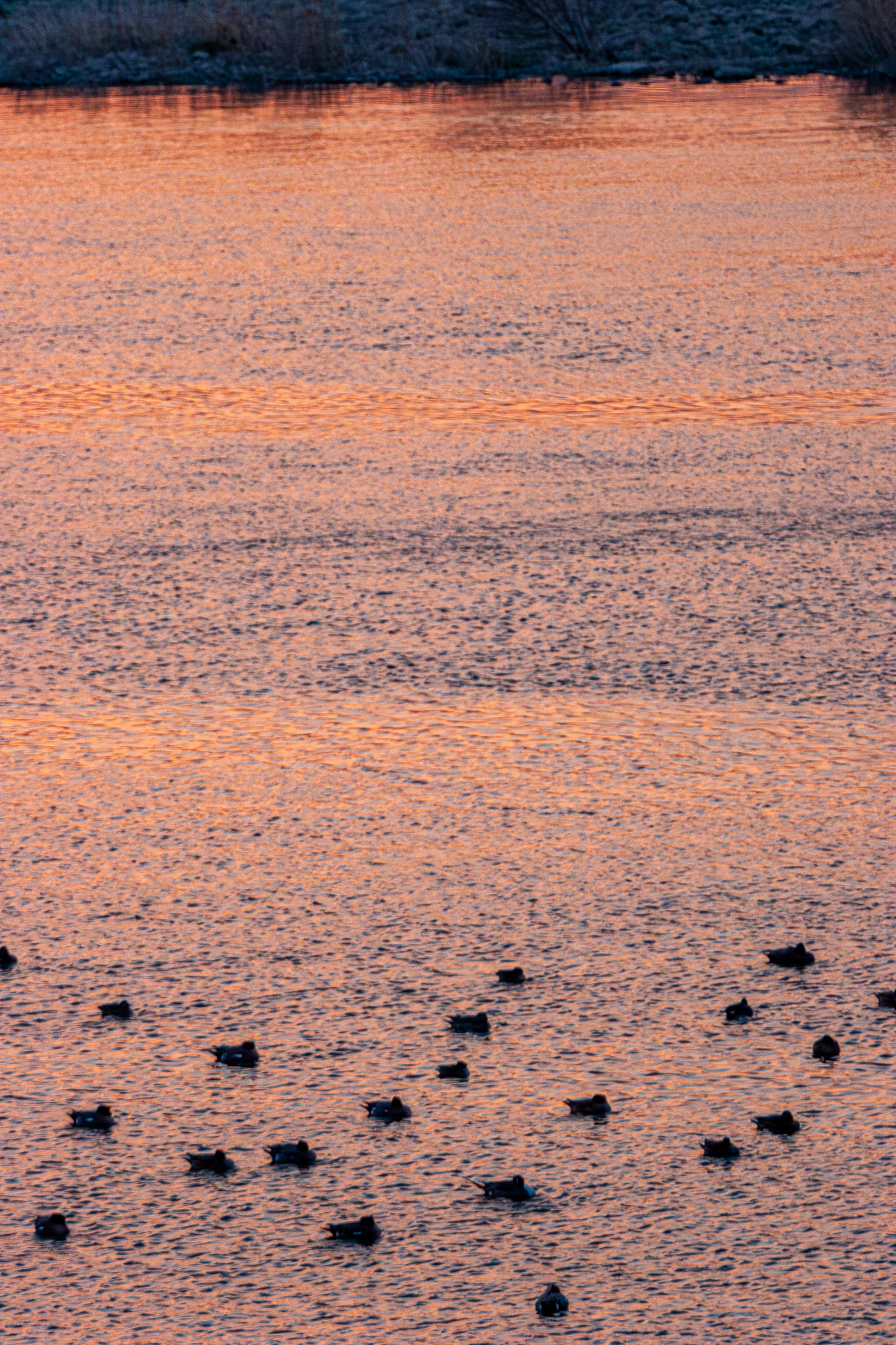 夕方、陽が沈み始めたころ、相模川に行くと水が赤く染まり、帰ってきた鴨たちをシルエットにしていたのでした。もう少し待ちましょう、春になるのを(^-^)。(EOS 20D)