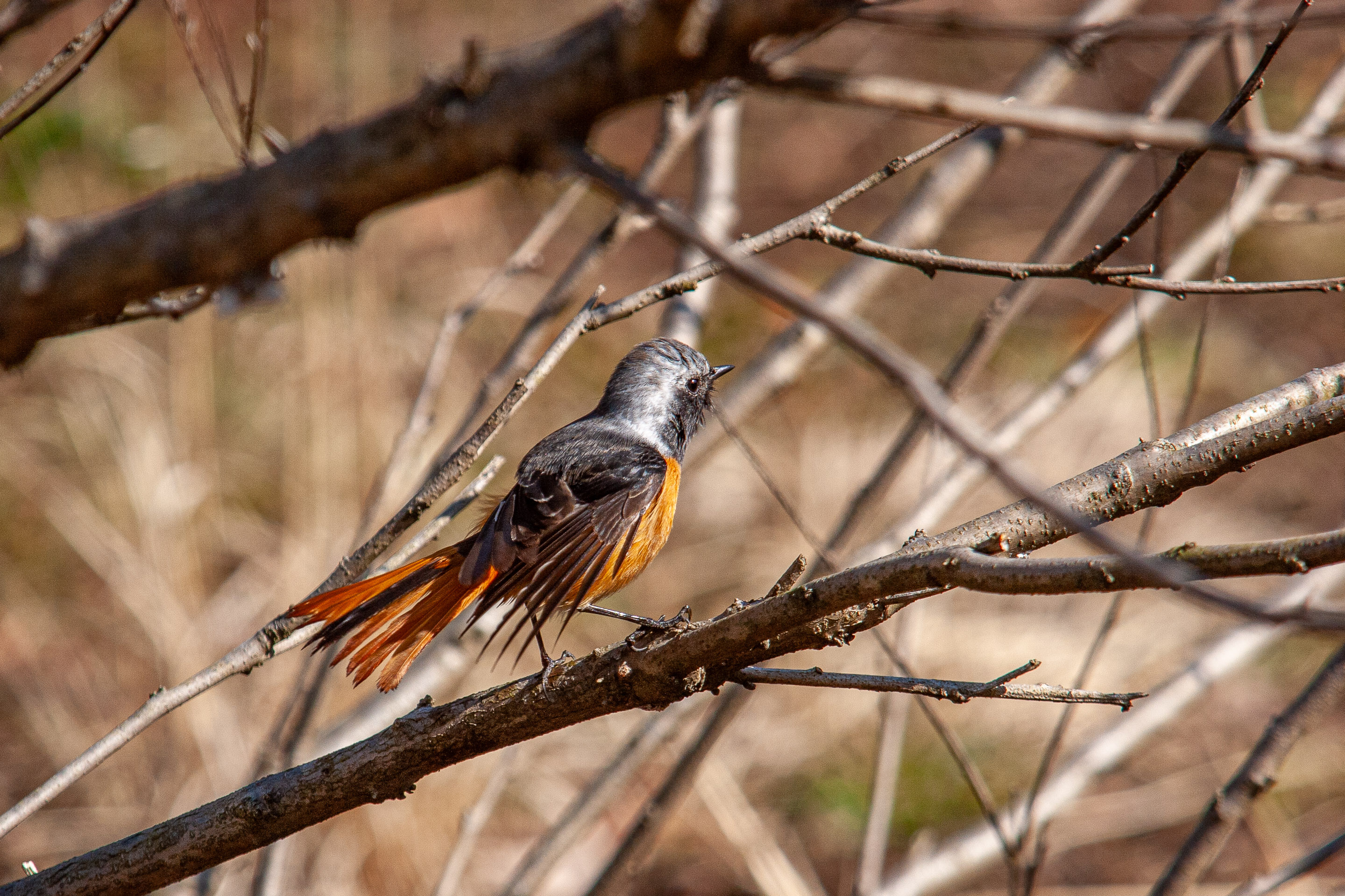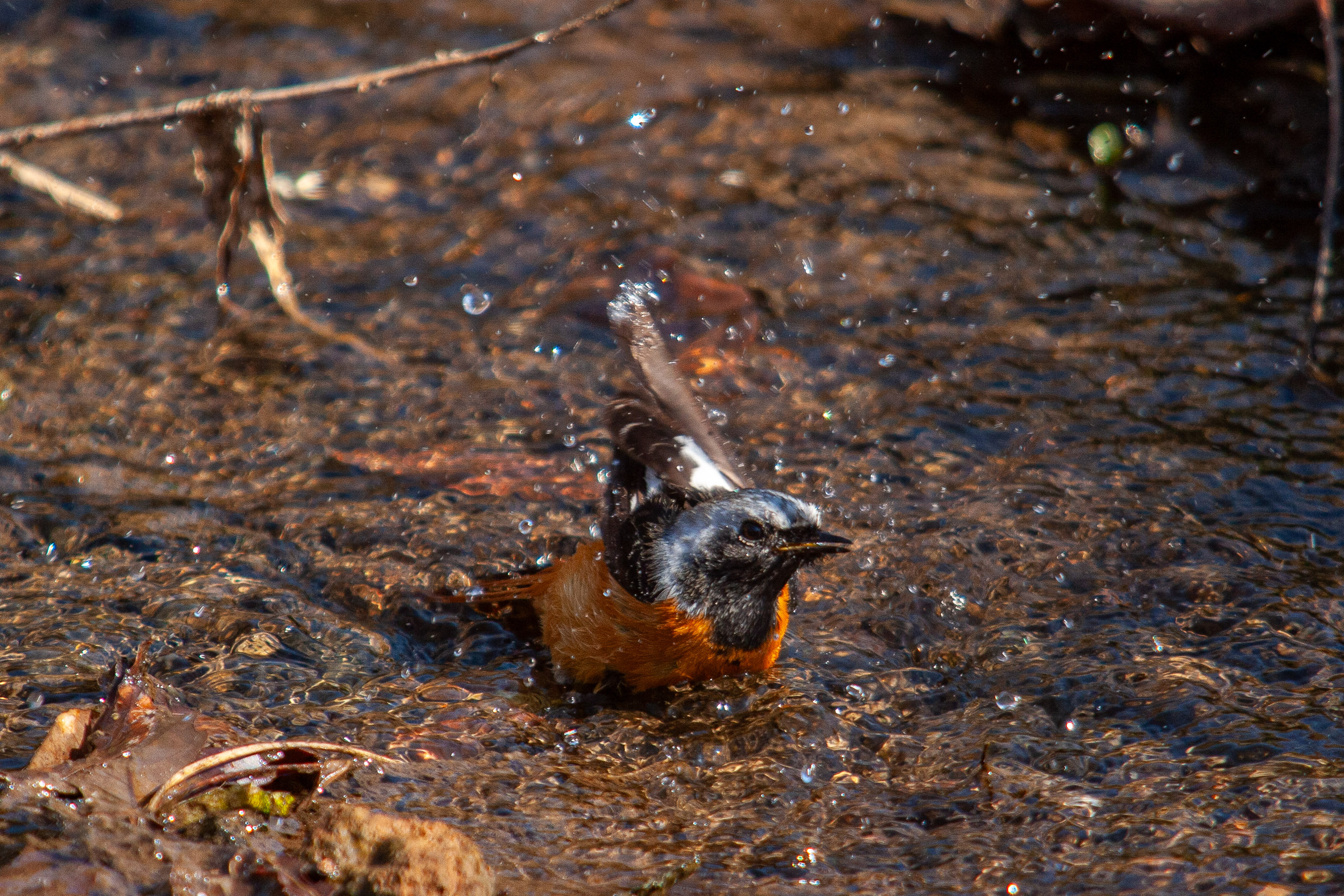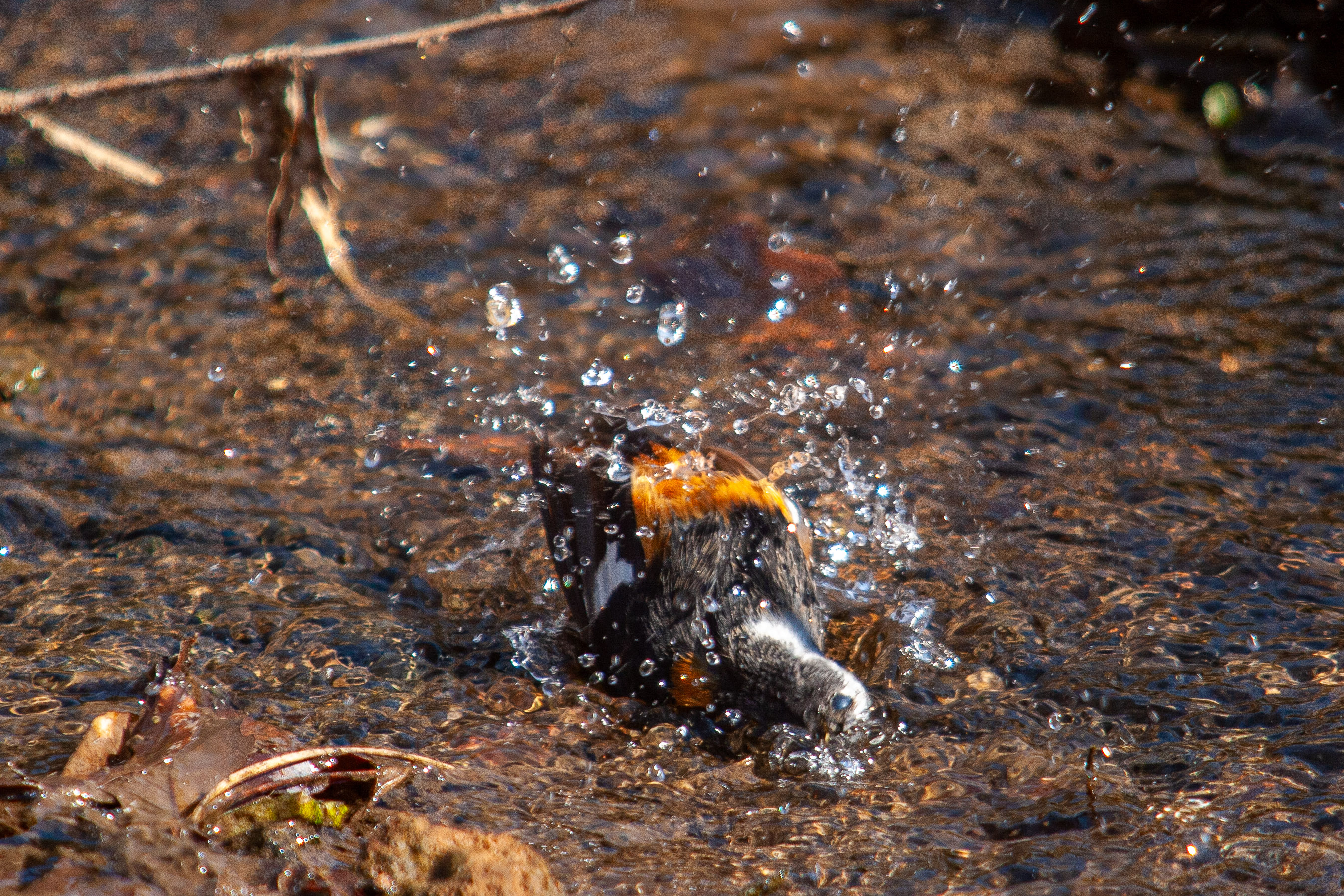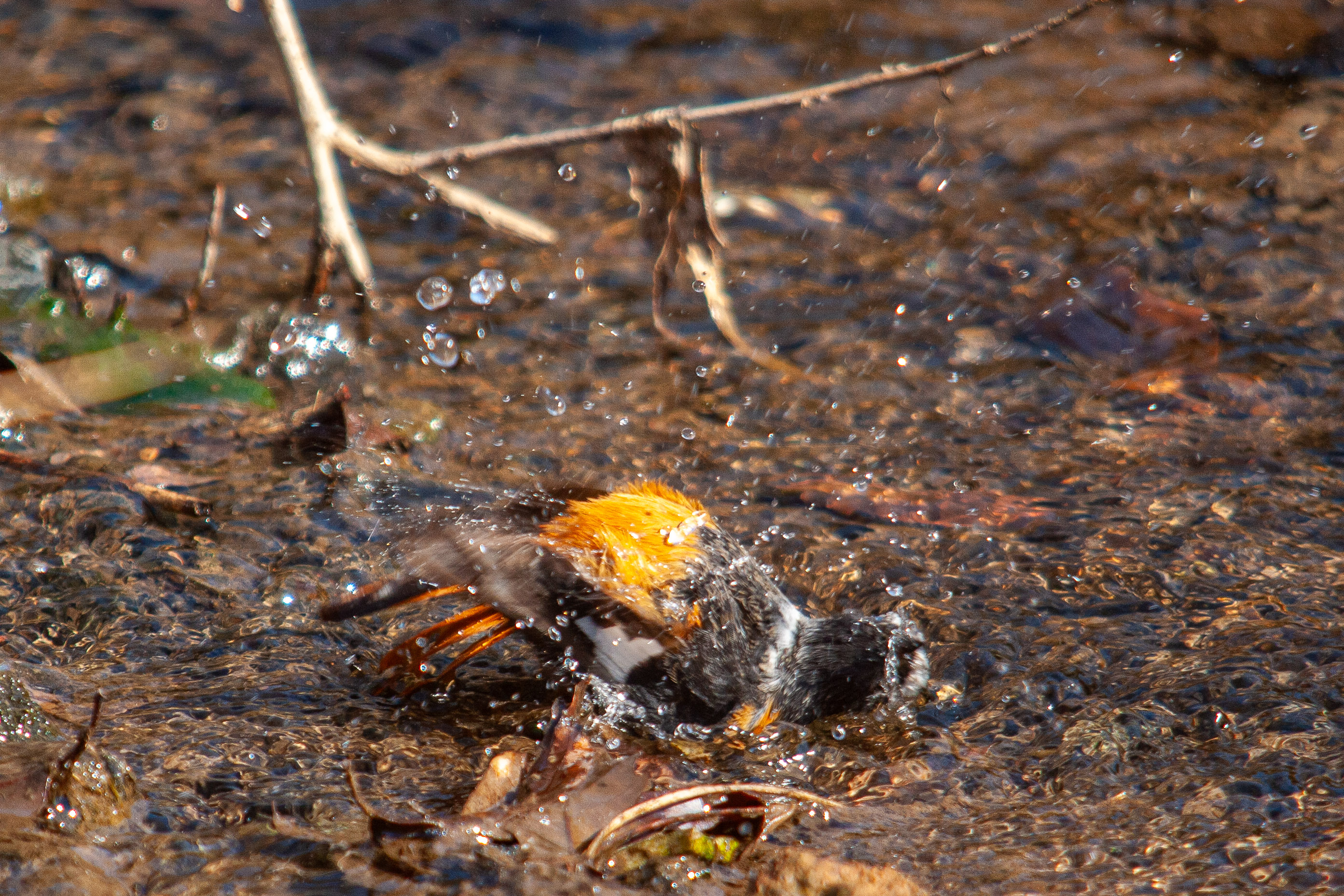 | 今朝もジョウ君です(笑)。撮影は、朝の短い時間しかなかったのですが、珍しいシーンが撮れました。食後に小川の浅瀬で水浴びを気持ち良さそうにしていたのでした。なかなかおしゃれで、水浴びをしてから枝に上がって羽を乾かす動作を2回繰り返していました。もうこれが最後で見納めでしょうか。(EOS