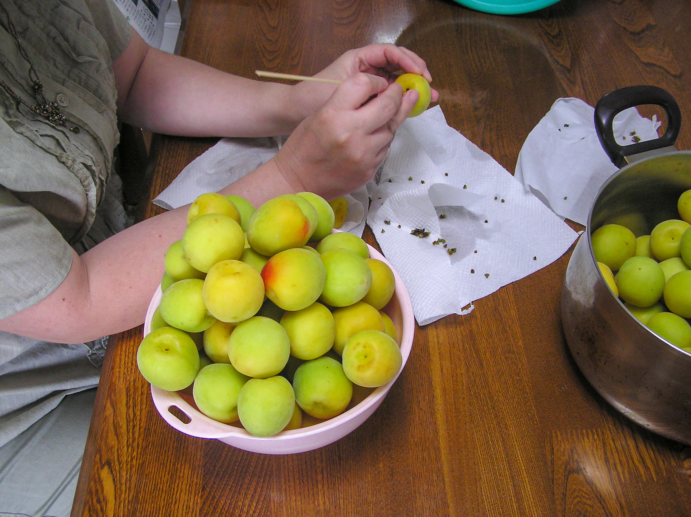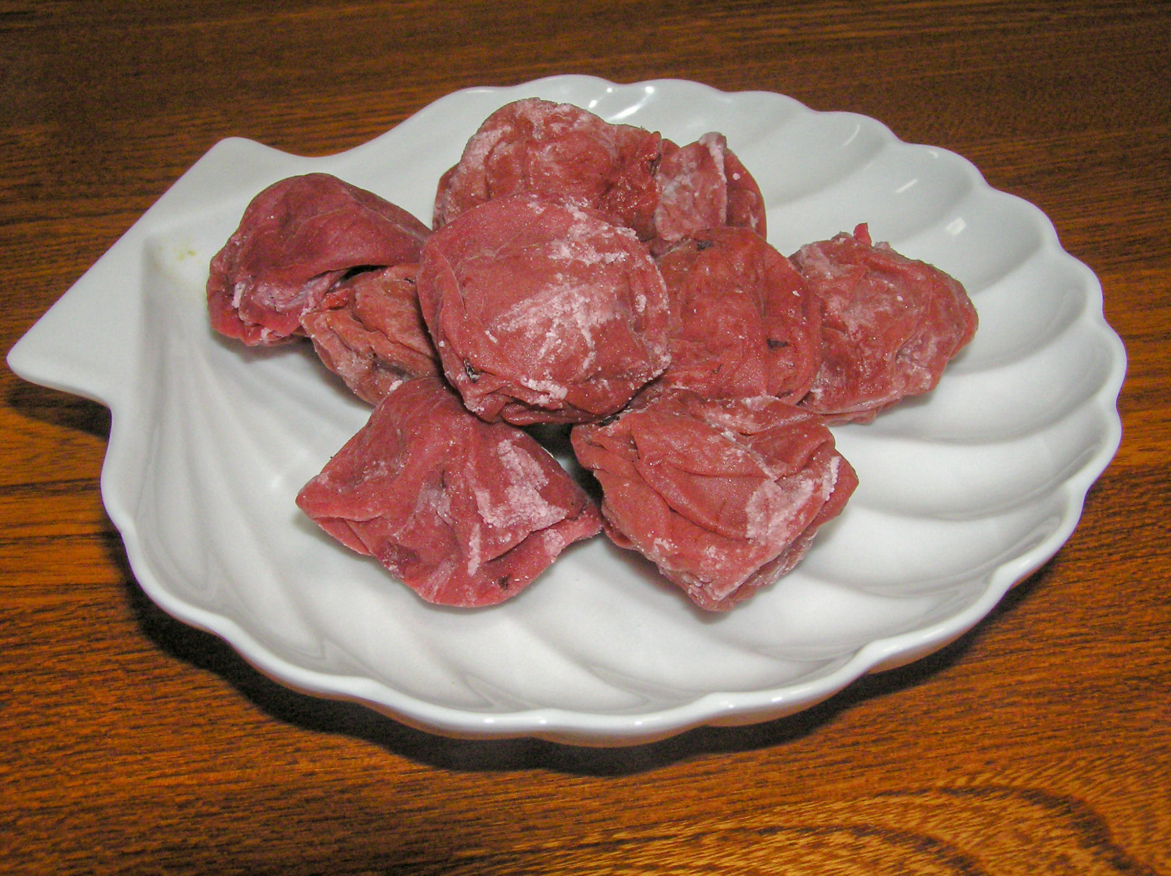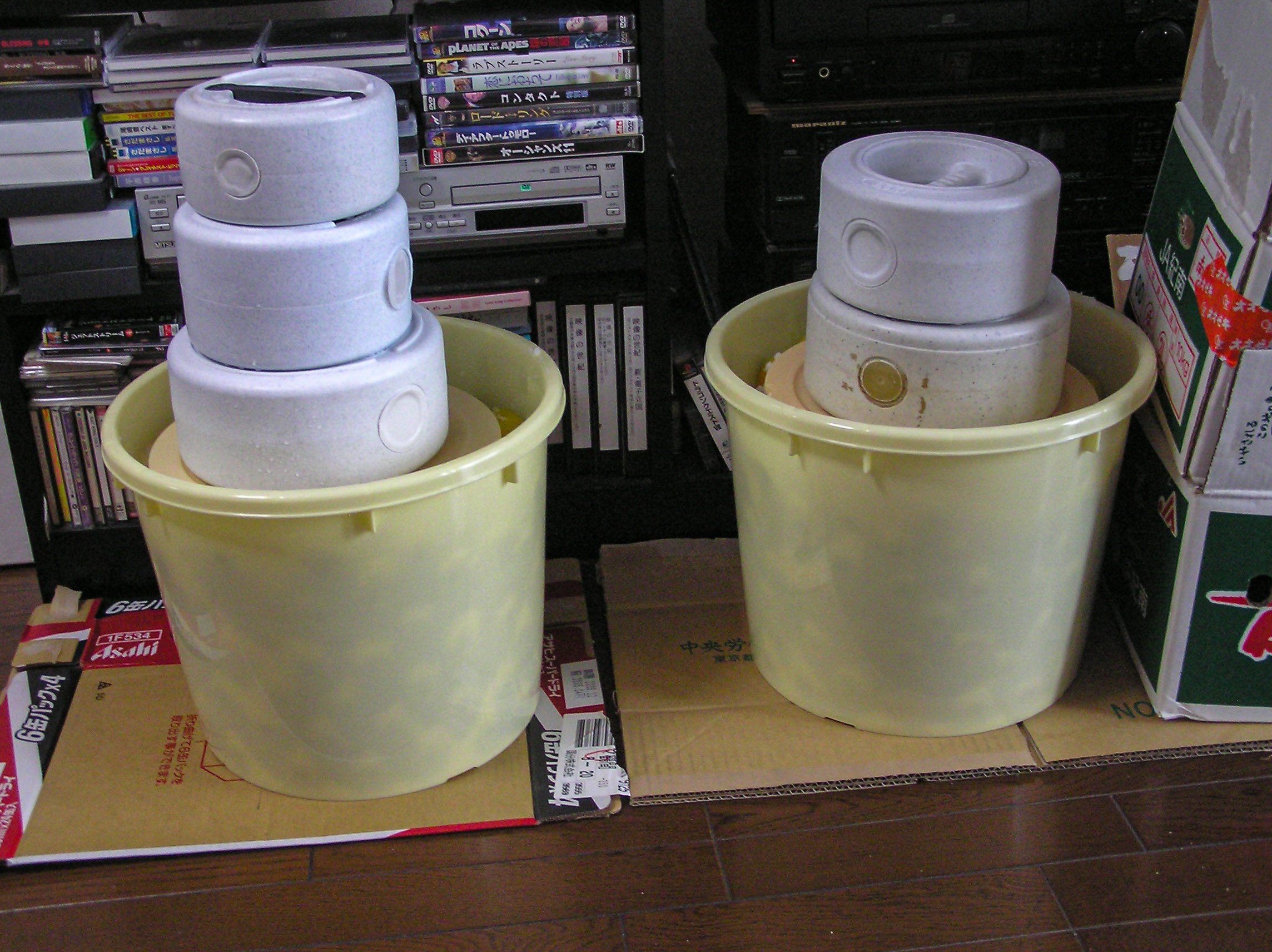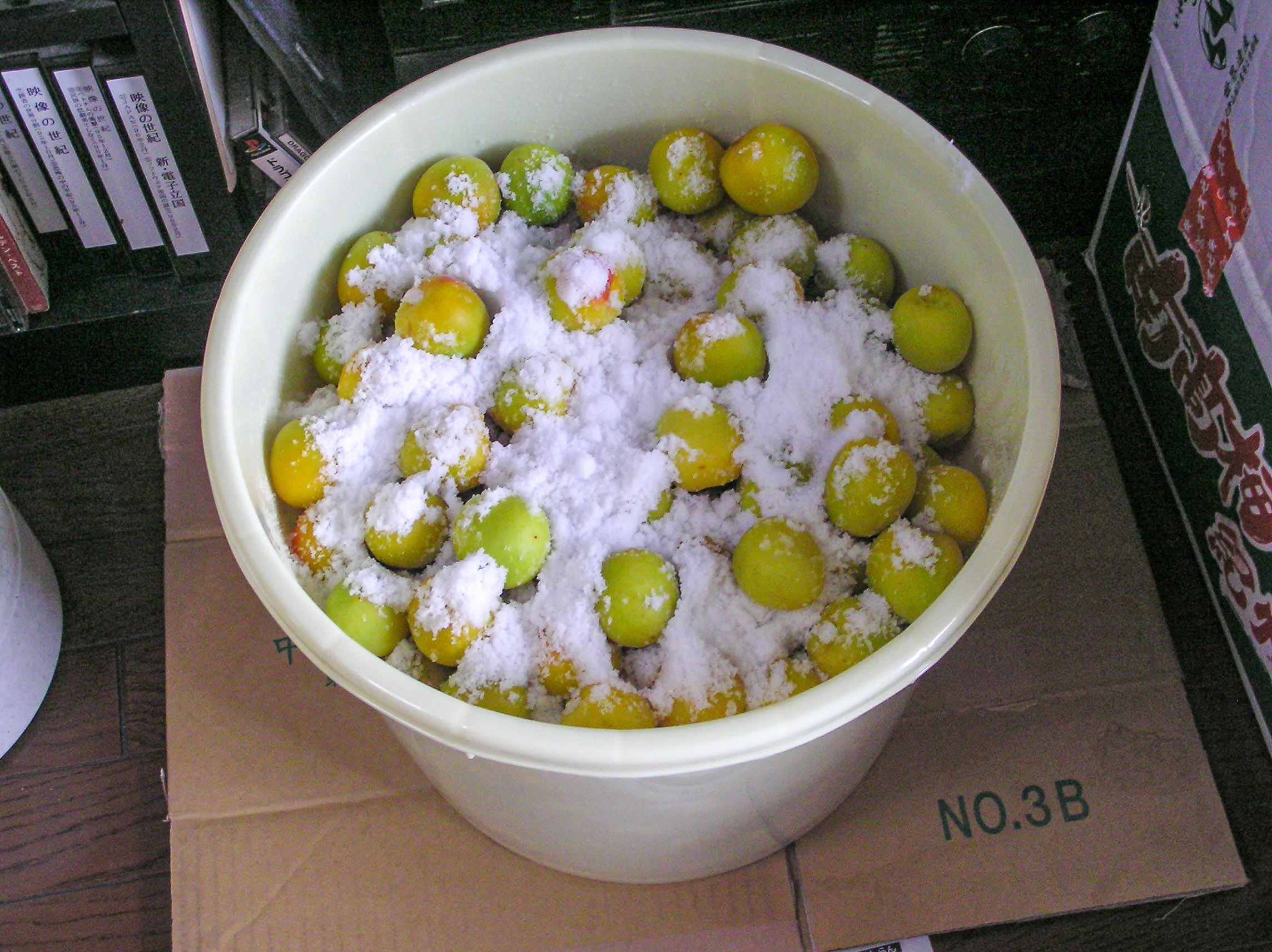 昨日買ってきておいた梅を一晩寝かせ、青かった梅が黄色っぽくなるのを待ちます。軽く水洗いをして、水気を取りながら、ヘタを竹串で取り去り、容器へ35度の焼酎を霧吹きでかけながら、そして、塩をまぶしながら収めていきます。梅と同量の重石を乗せて、今日の作業は終了です。数日後、水が上がってくるのを待ちます。最終的には8月上旬に出来上がる予定です(^-^)。(C-750UZ) |