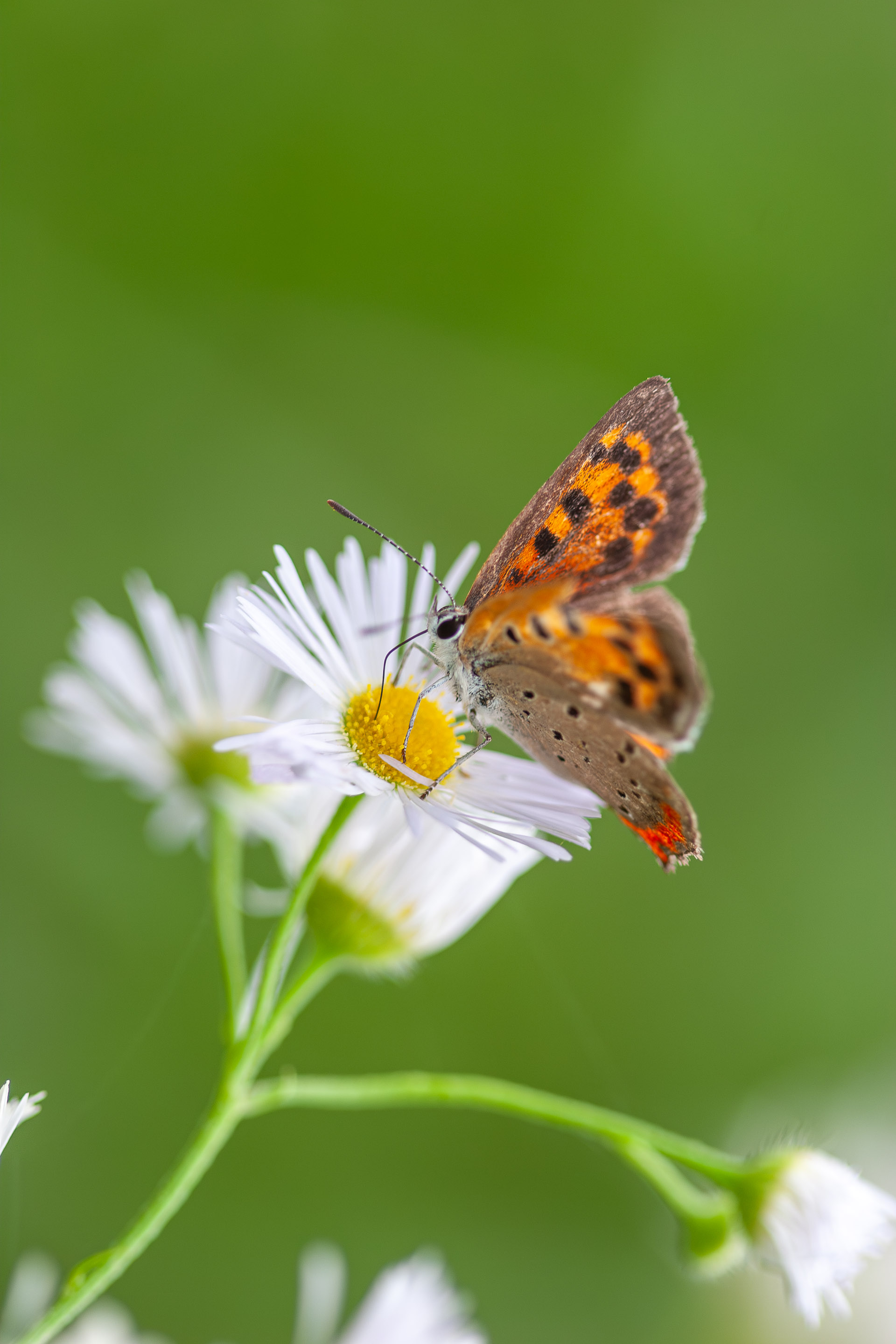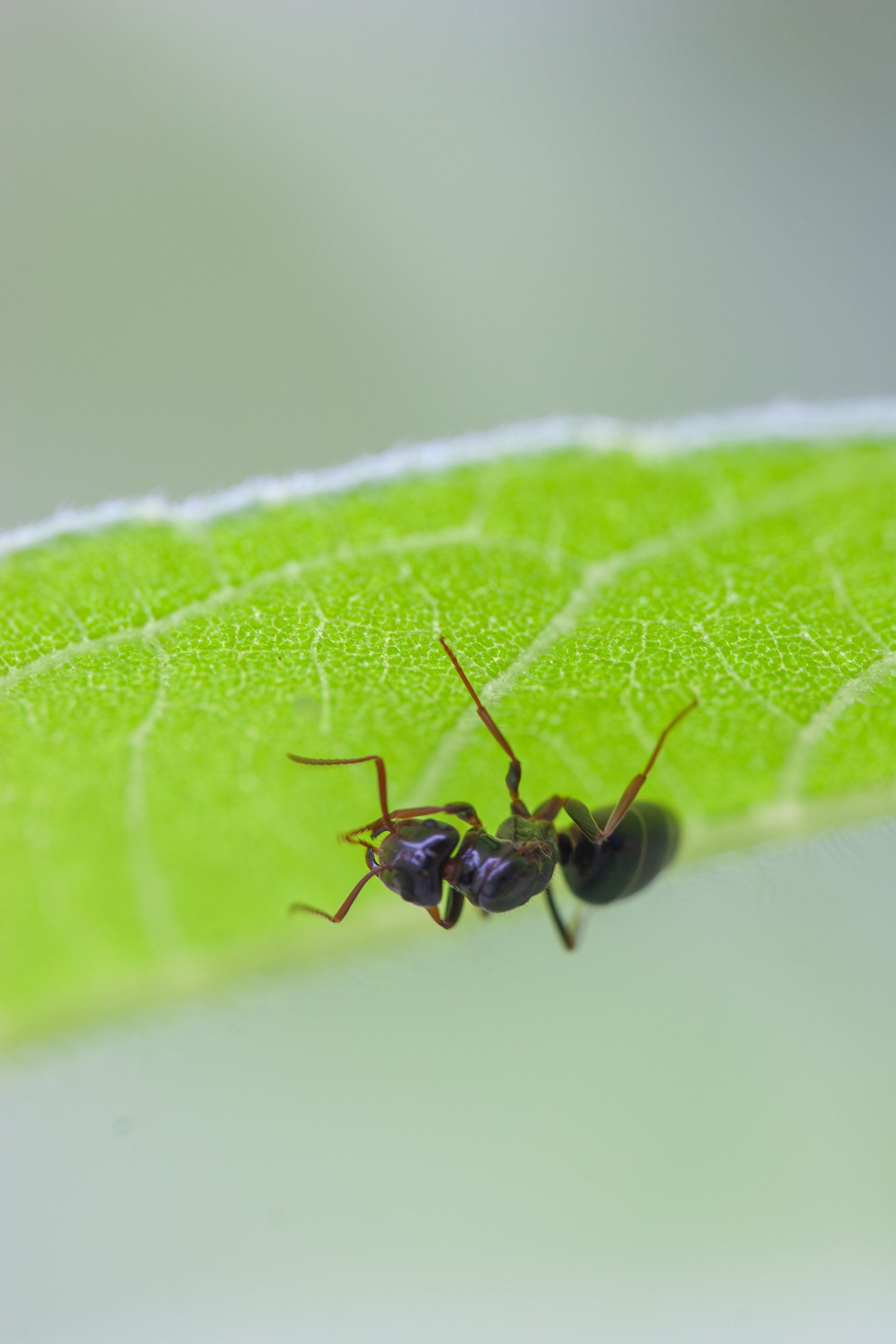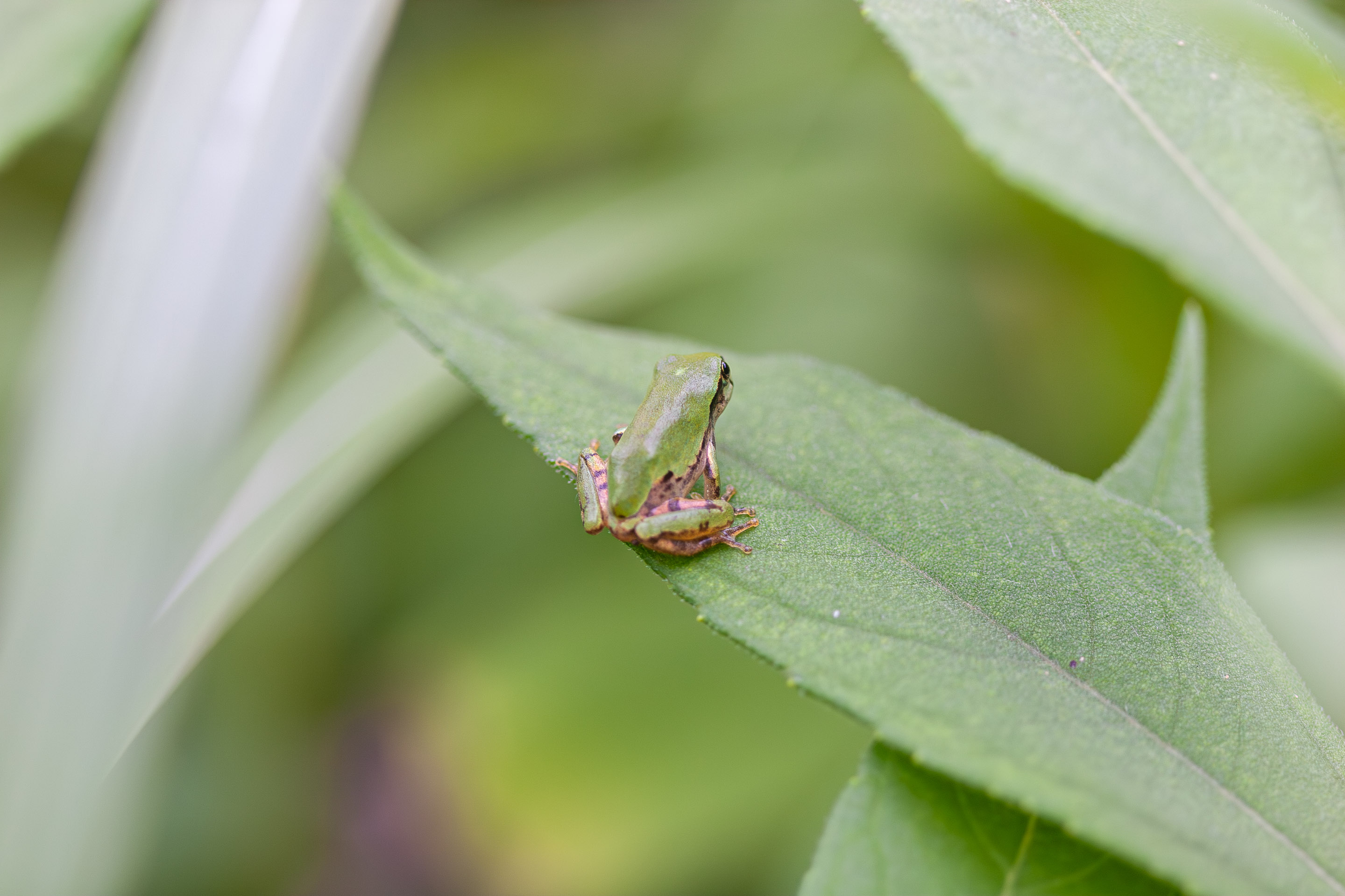 そんな中で生き物を探していました。ひとりぽっちのアリが葉の裏で雨の来るのがわかっているように避難しています。アマガエルは雨を浴びたいのでしょうか、あちこちの葉っぱの上に待機しています。ベニシジミはせっせと蜜を吸ってどこかへ姿をくらましてしまいました。
