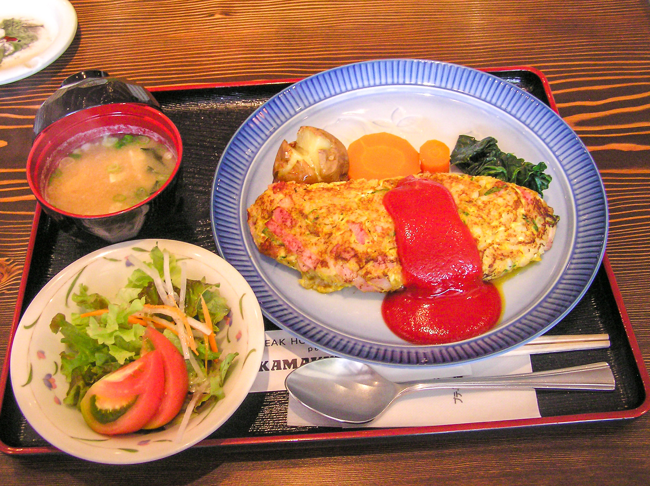 オムライス鎌倉山風は、初めてのシロモノ。ハムと野菜とライスを混ぜて焦げ目をつけたオムレツと言おうか、固そうに見えますが、中は柔らかくおいしかったですよ。
