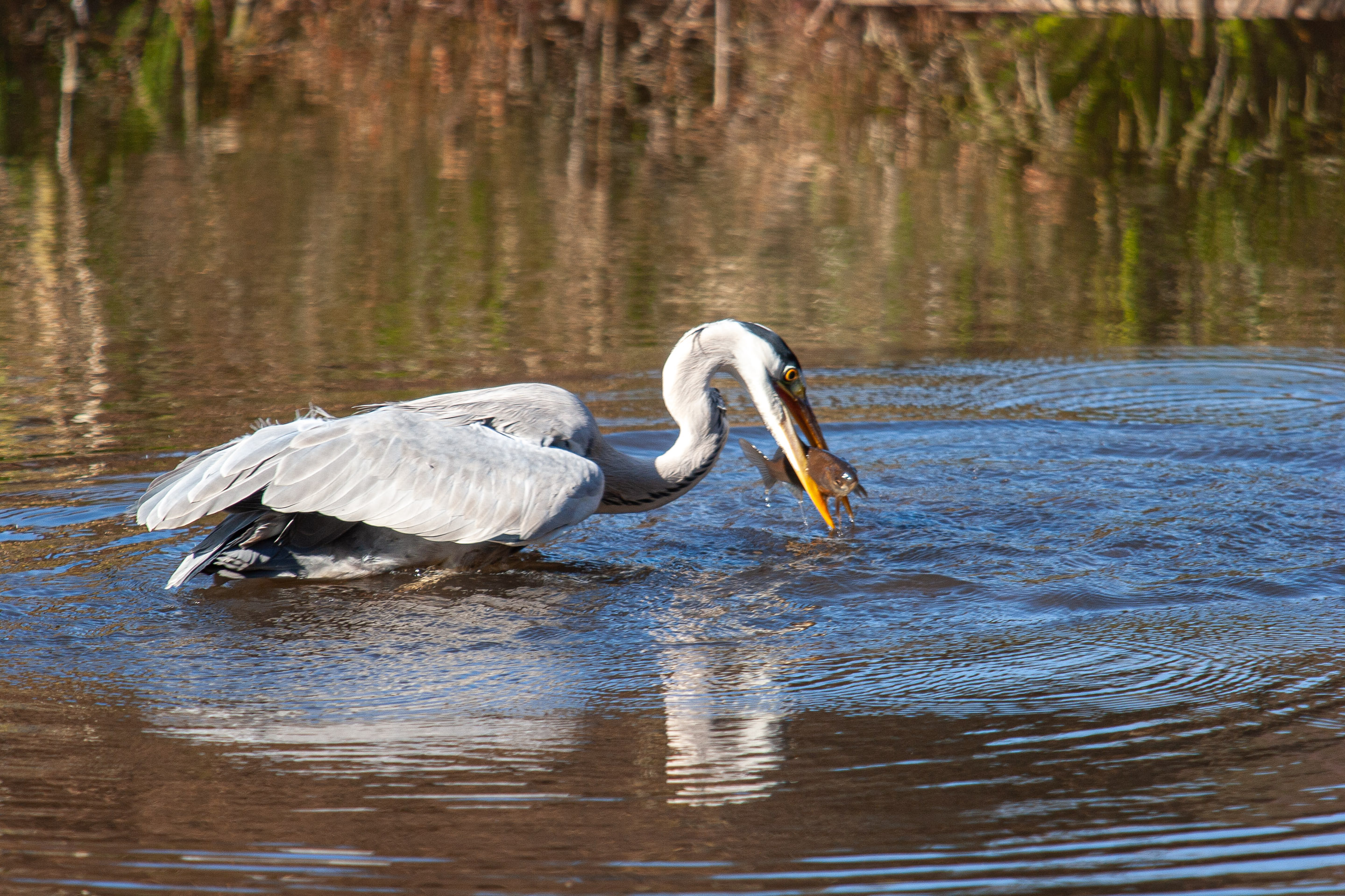 朝、ちょっと時間があったので、大和市の泉の森でアオサギを撮ってみました。大きくてゆったりした動きですが、獲物を素早く捕らえるのはさすがですね。フナでしょうか、かなり大きい魚を見ている間に三尾はものにしていました。(EOS 20D)