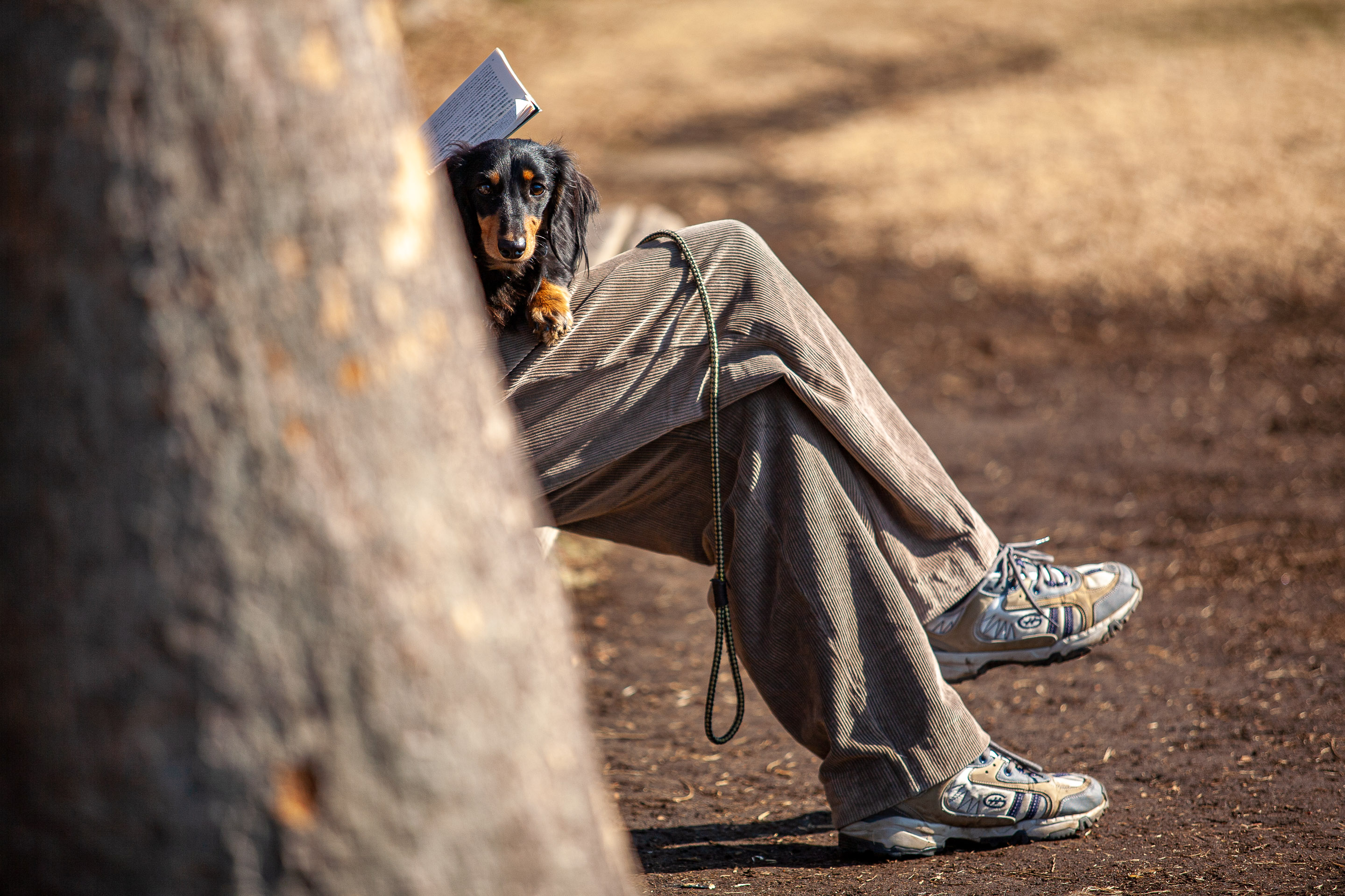 公園のベンチで本を読むご主人、ワンコはじっと私を見つめていました |