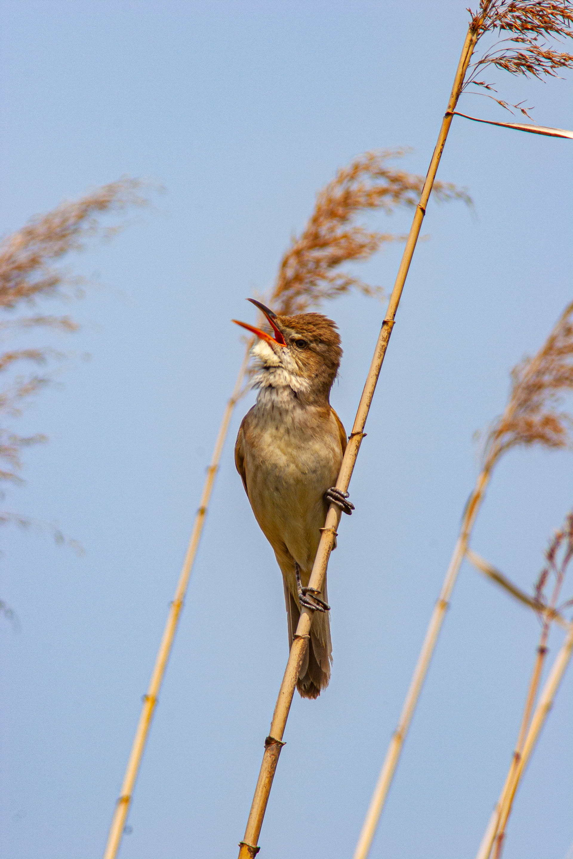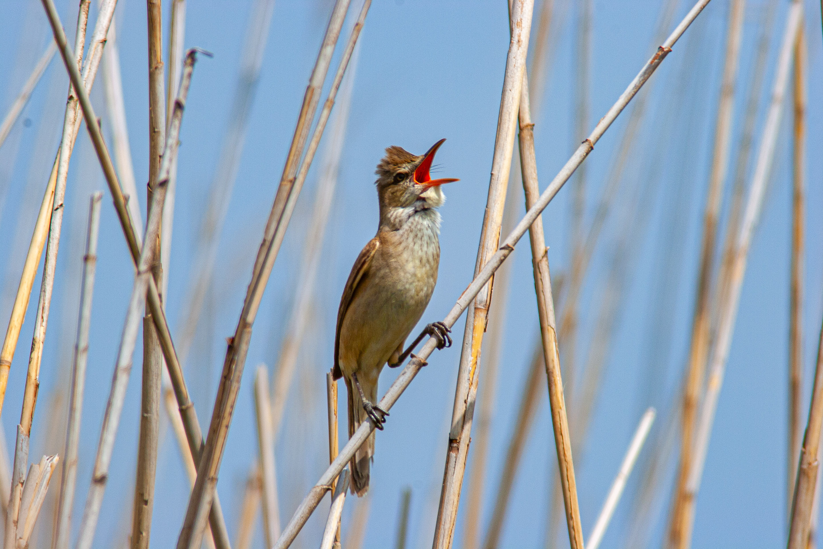 そのうち目を凝らして鳴いている方向をじっと見つめていると葦の合い間に鳥を見つけることができました。これがオオヨシキリでした。メスを求めているのでしょうか、縄張りがあるのでしょうか、やたら声がでかいです。そして、口を大きく開けて鳴きます。あまり美しいとは言えない鳥ですが、力強い生命力を感じることができました。