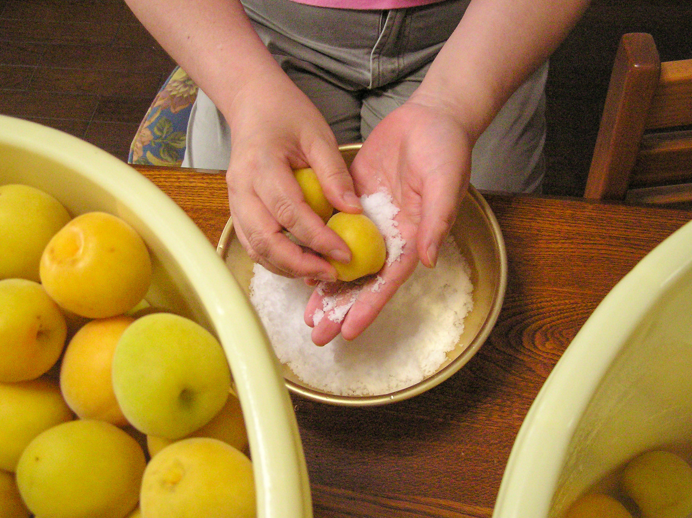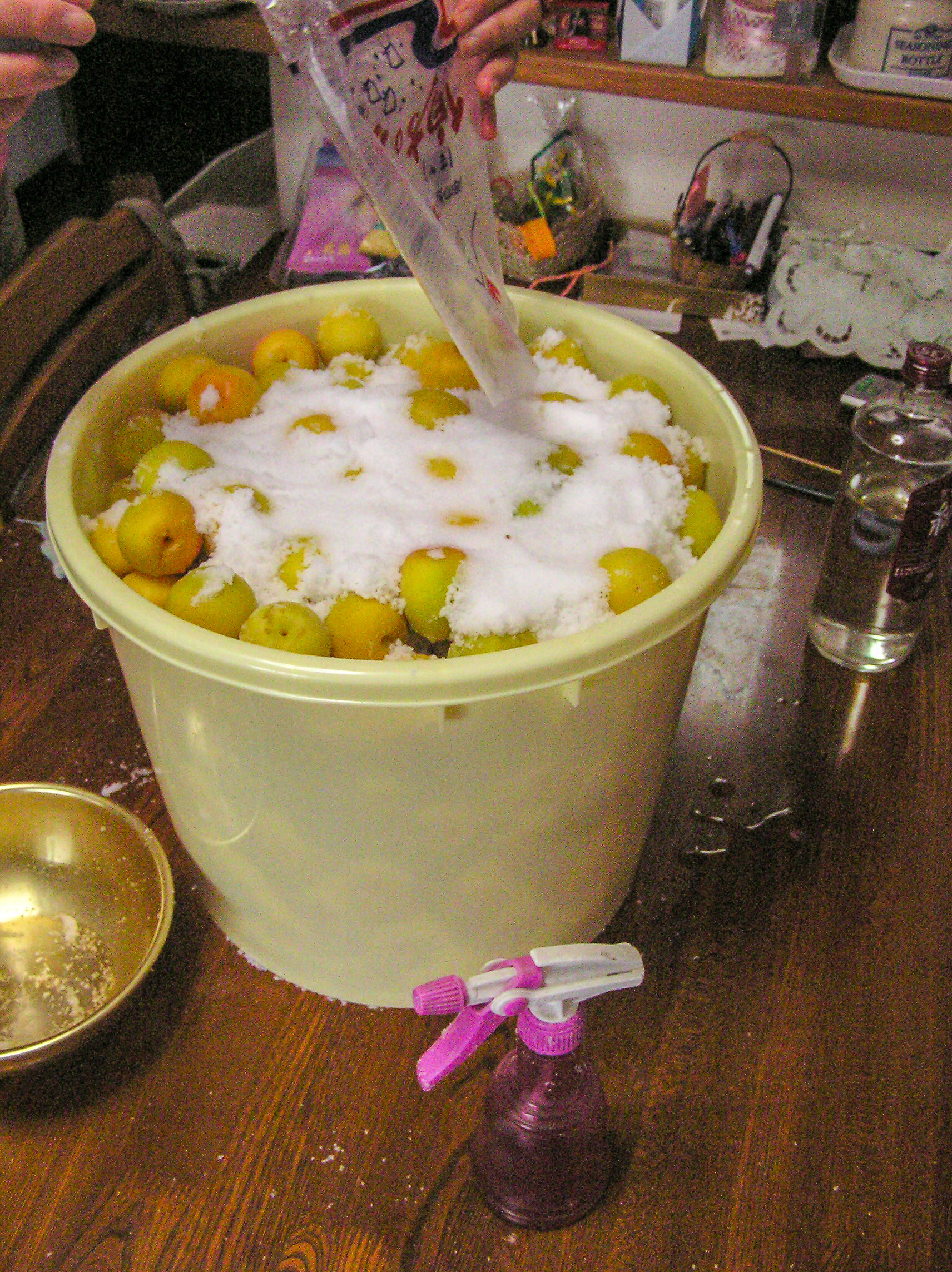 水気を拭き取りつつ、竹串で梅のヘタを1個1個とるのです。これがちょっとした手間なんですが、美しく仕上げる大事な作業です。それから35度の焼酎を霧吹きに入れ、容器や梅に吹きかけながら、塩を擦り込むようにして漬け樽に入れていきます。20%分(12キロの梅に2.4キロ)の伯方の塩を梅と交互に混ぜていきます。塩分濃い目が我が家の梅干しです。塩分控えめとか、他のものを混ぜるなど邪道なことはしません。昔ながらのすっぱい、しょっぱい梅干しを目指します(^o^)。