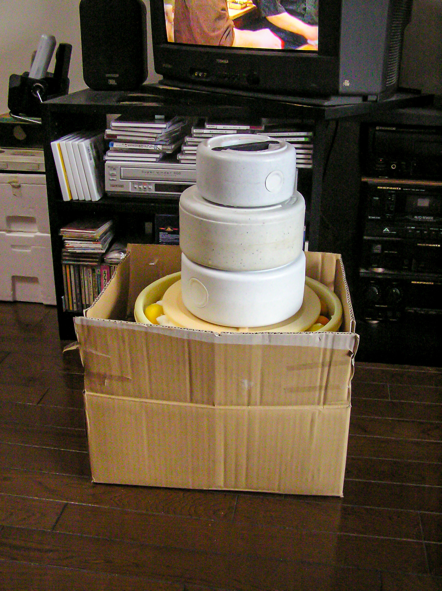 20リットルのポリ樽にちょうどうまく納まりました。これに同じ重さお重石(組み合わせで13.5キロになってしまった)を乗せ、次は水があがってくるのを待つだけ。その後、赤シソを梅と交互に挟み込んでいくことになります。