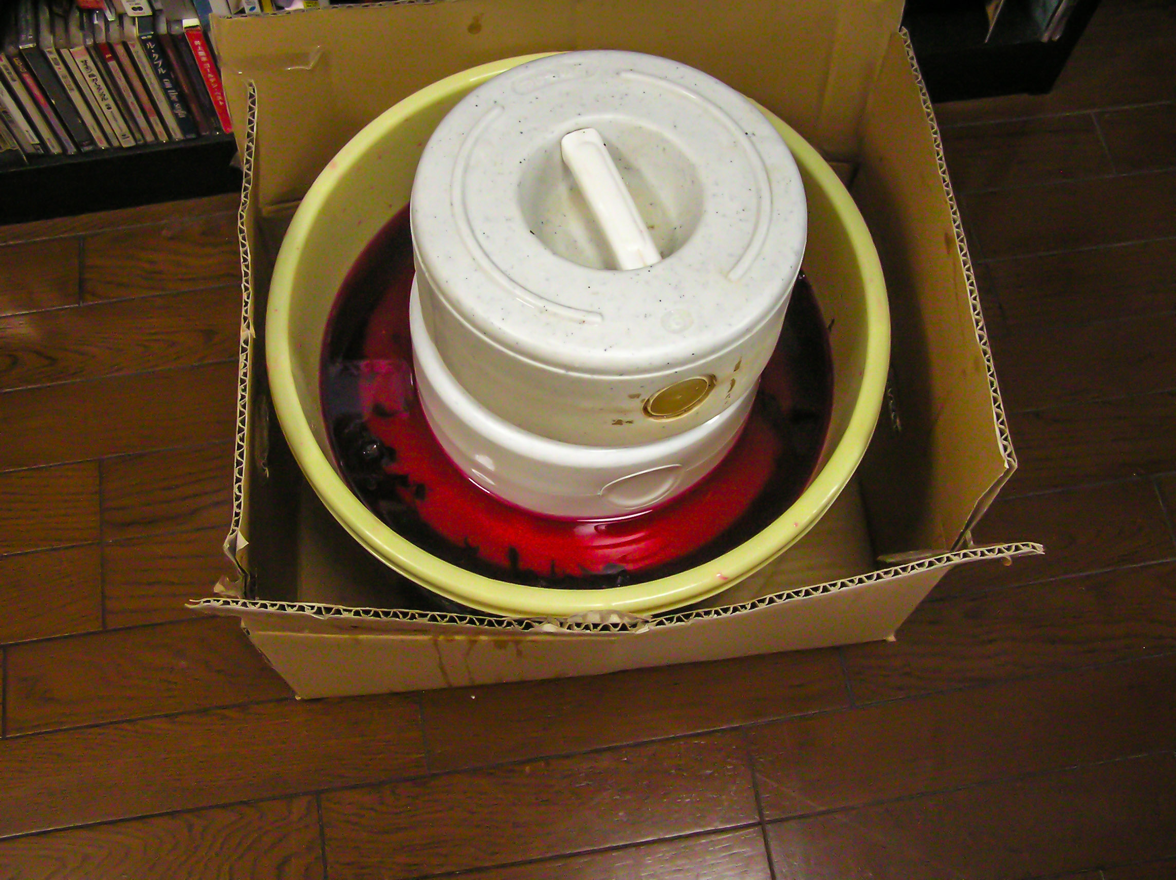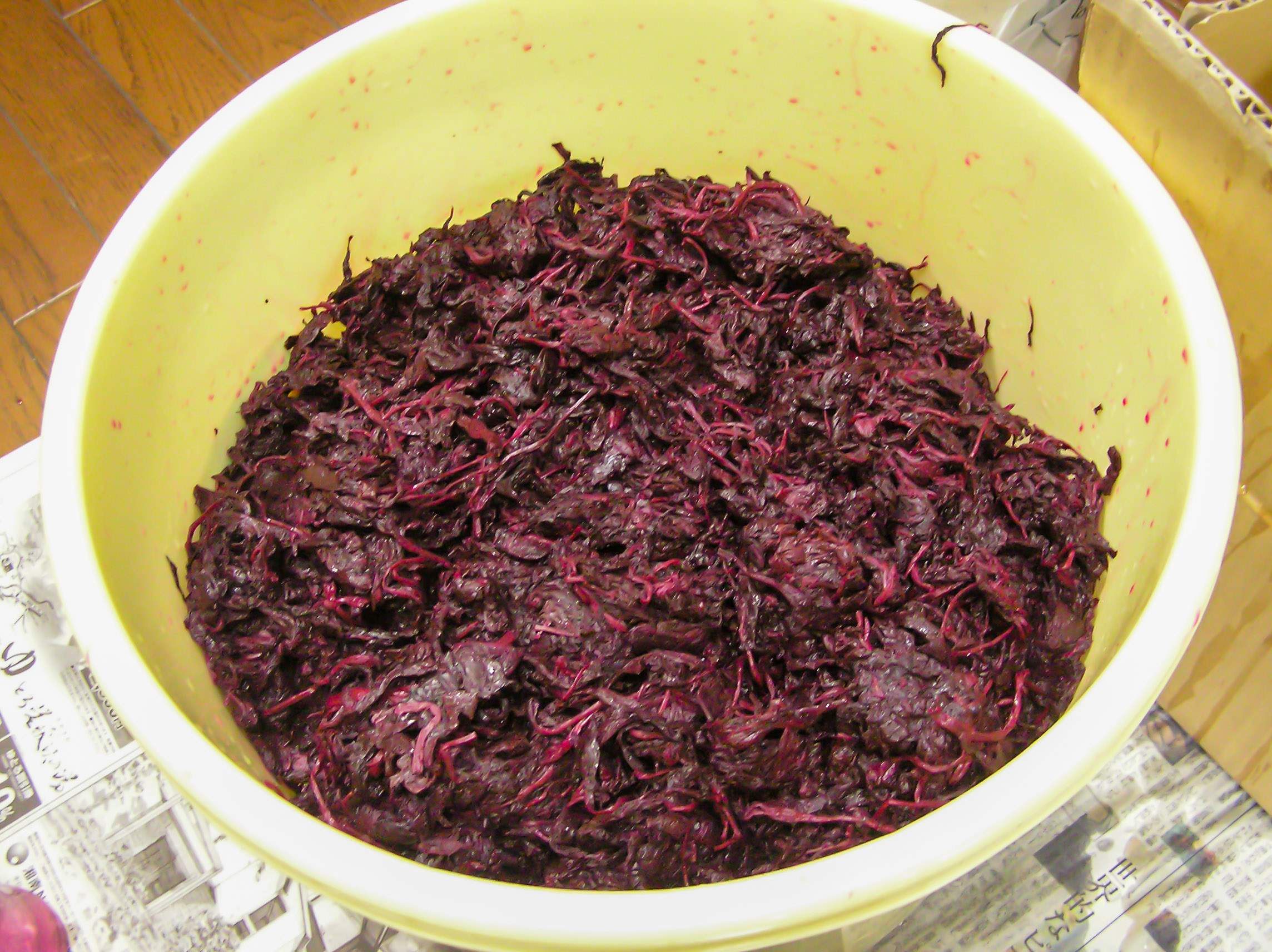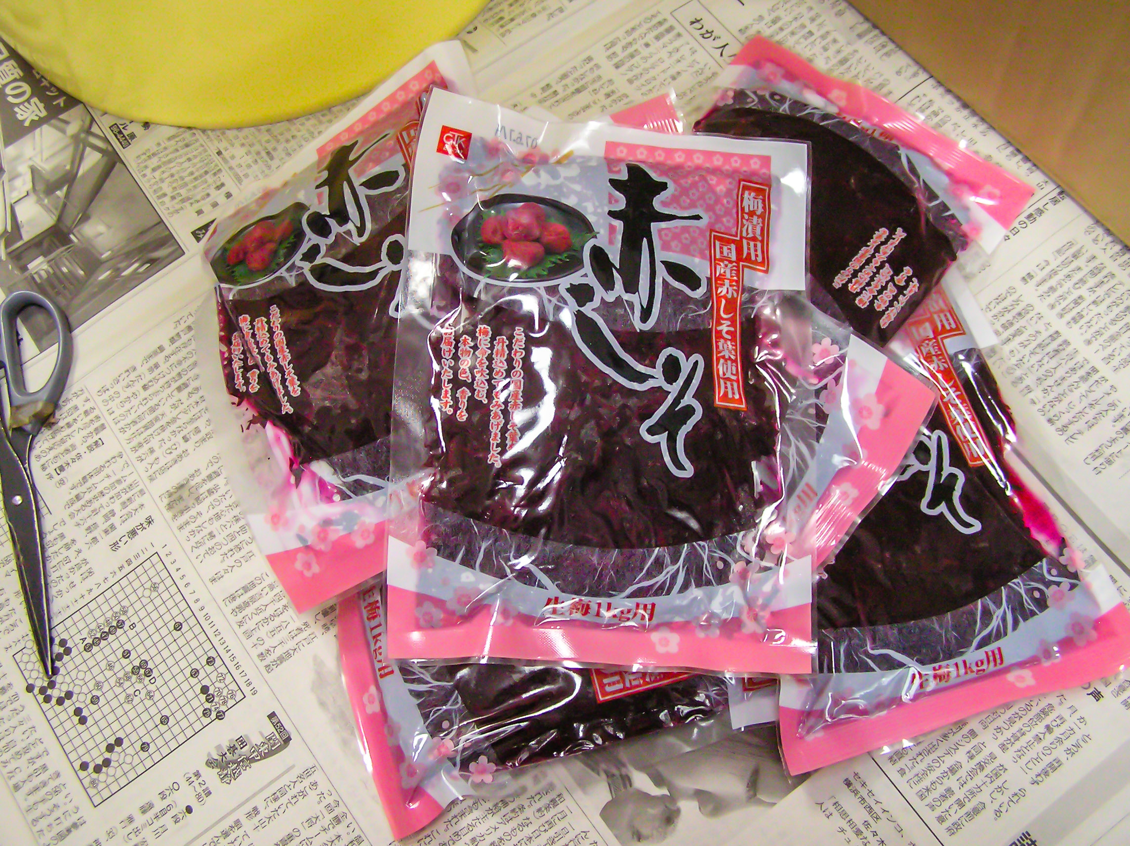 先週の土曜日に梅を漬けて、すでに水が上がり安定したのが水曜日ごろ、今日は1週間目、赤じそを投入する日でした。最初10袋ほど購入しましたが、5袋買い足し、全15袋で完璧に赤に染めるべく準備したのでした(^.^)。