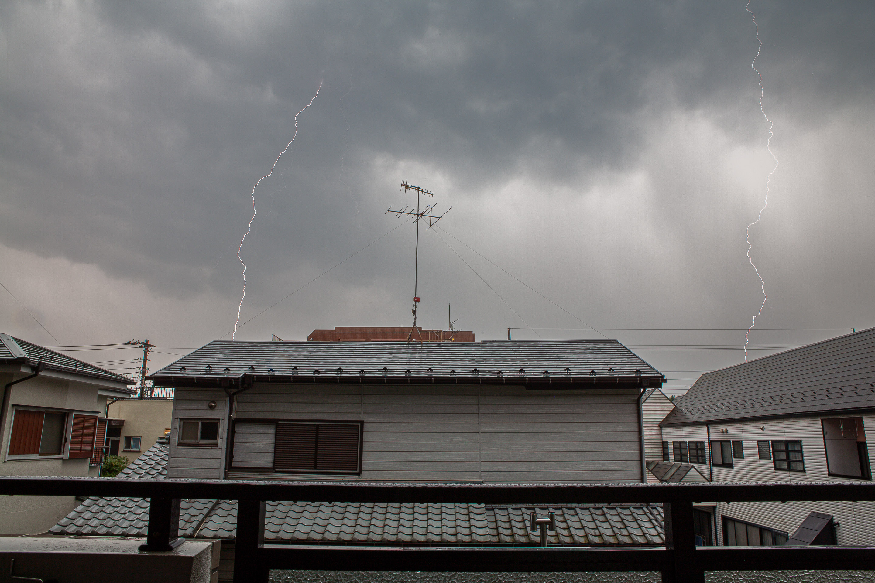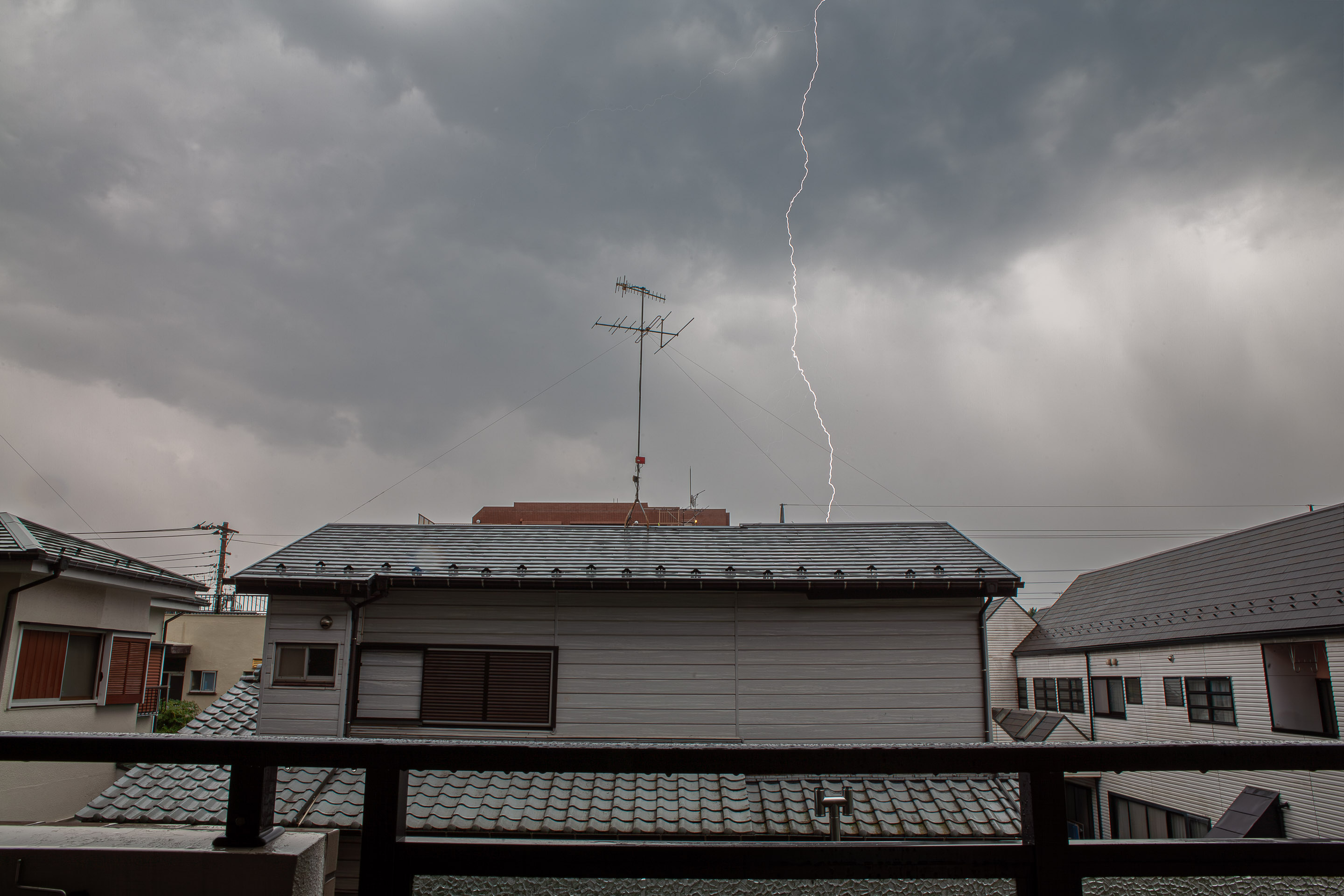 雷雨が来るとは天気予報で言っていましたが、午後3時過ぎ、そのとおりになりましたね。ベランダの向こうの空で派手にピカピカドンドンやっていましたので、写真が撮れそうだと思い、カメラを用意しました。