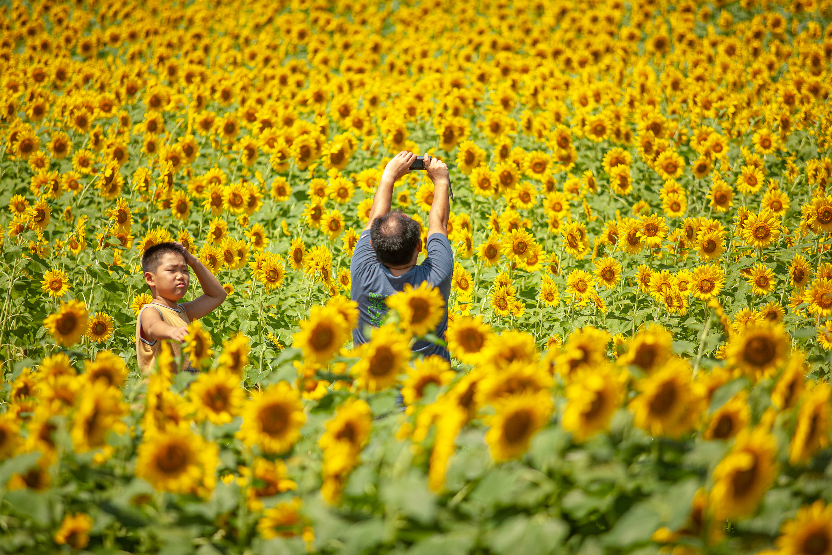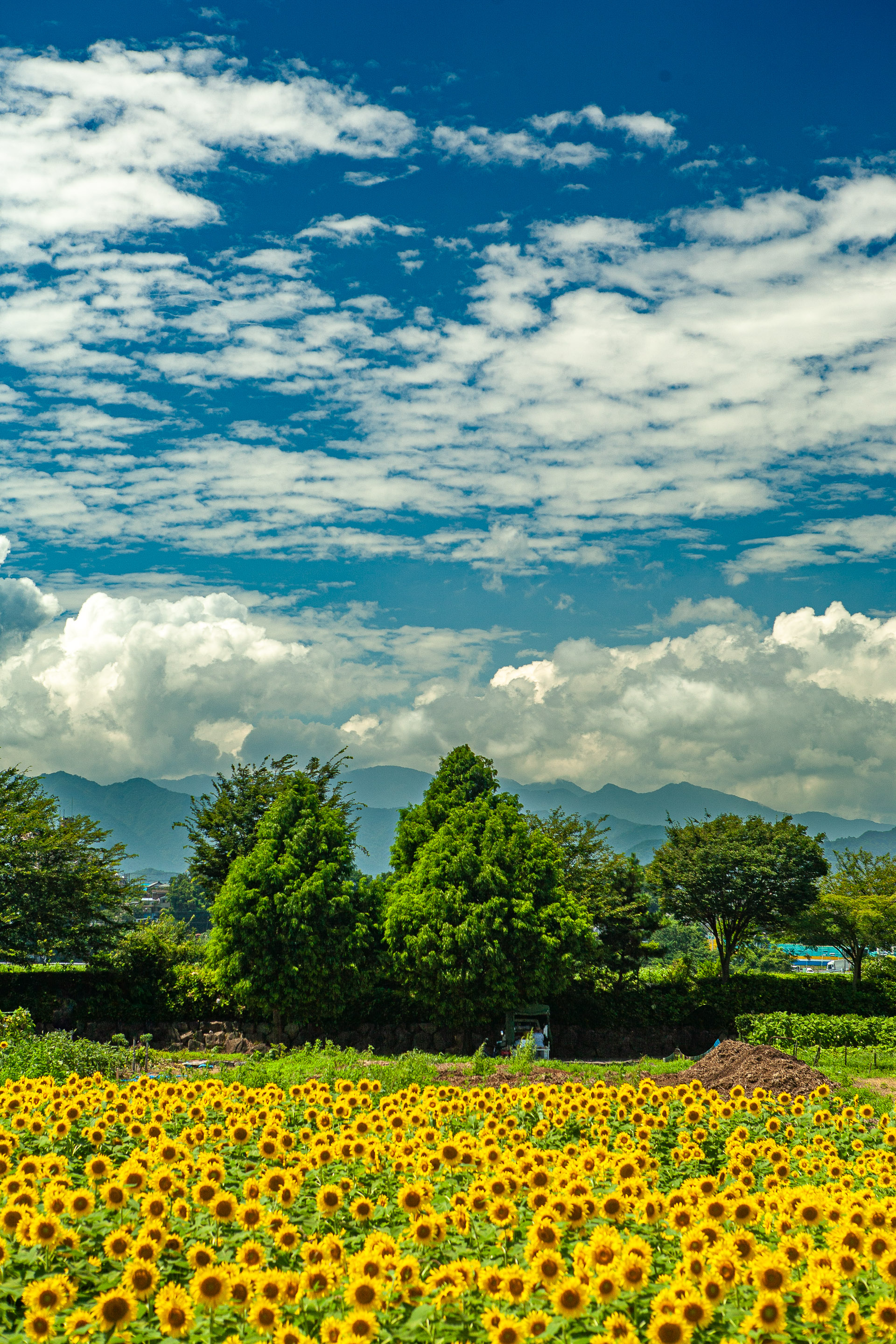 座間市のひまわりも最後の新田宿(相模川沿い)が最盛期を迎えています。遠くの山は丹沢 連峰です。