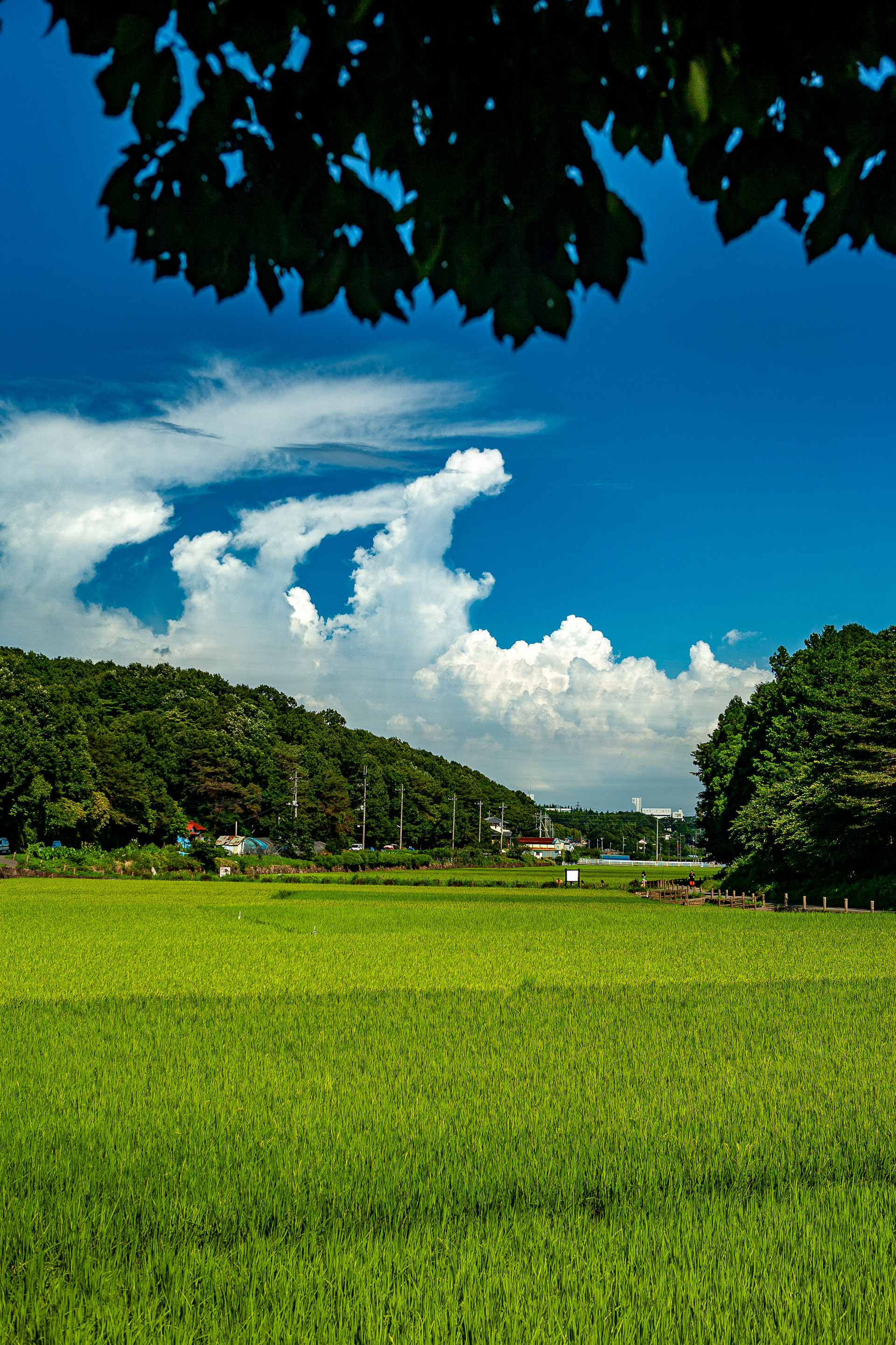 そして、入道雲を追いかけているうちに、横浜市青葉区の寺家(じけ)ふるさと村まで来てしまいました。田んぼの稲もすくすくと育ち、周辺の森の緑、透きとおった空、そして、にょきにょきと立ち上る入道雲・・・感動します。「久々の夏に会った」気がしました。(EOS