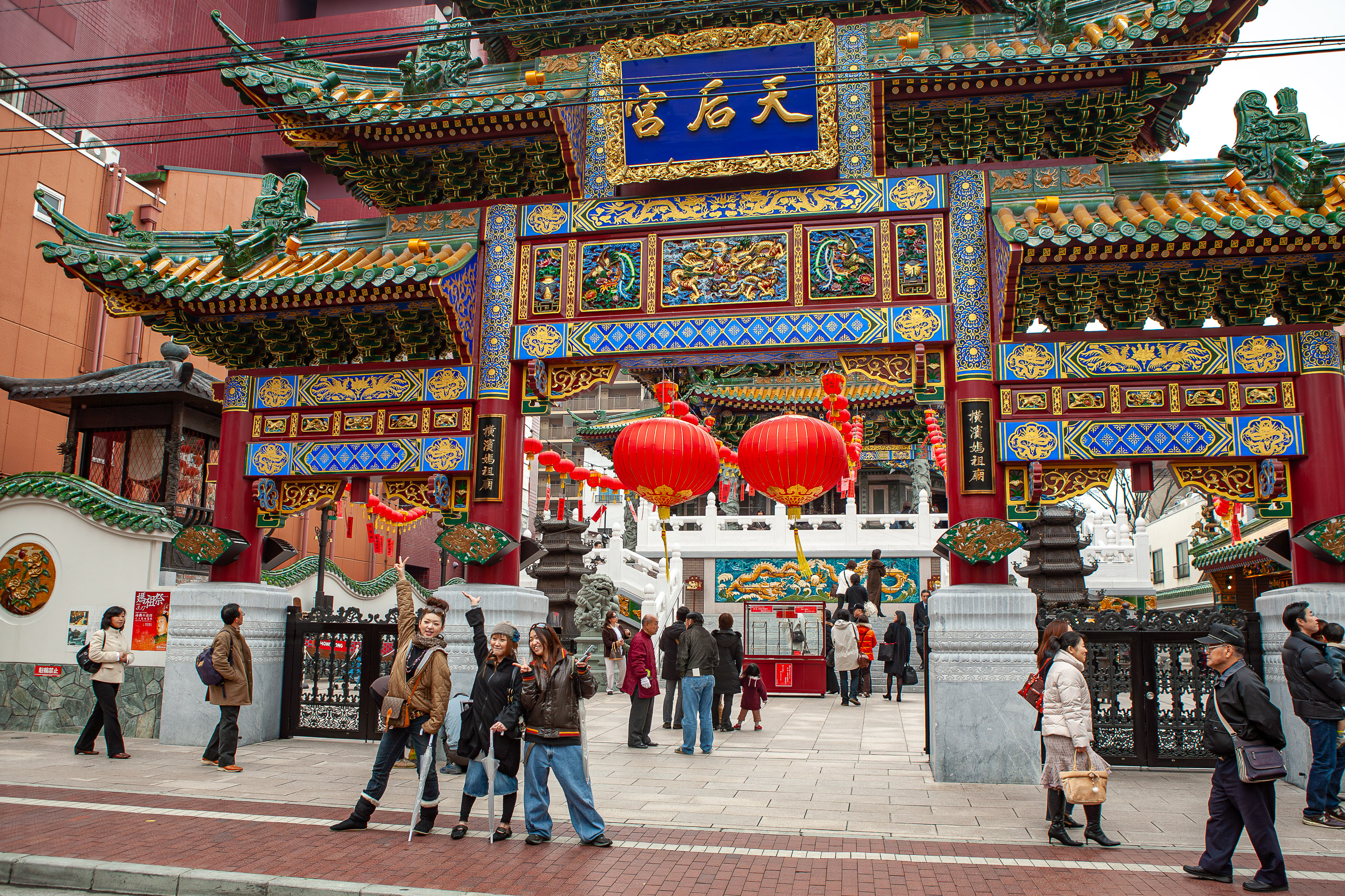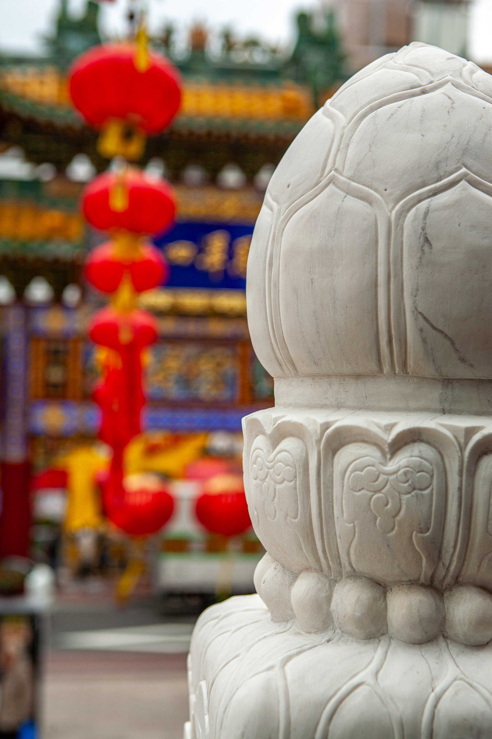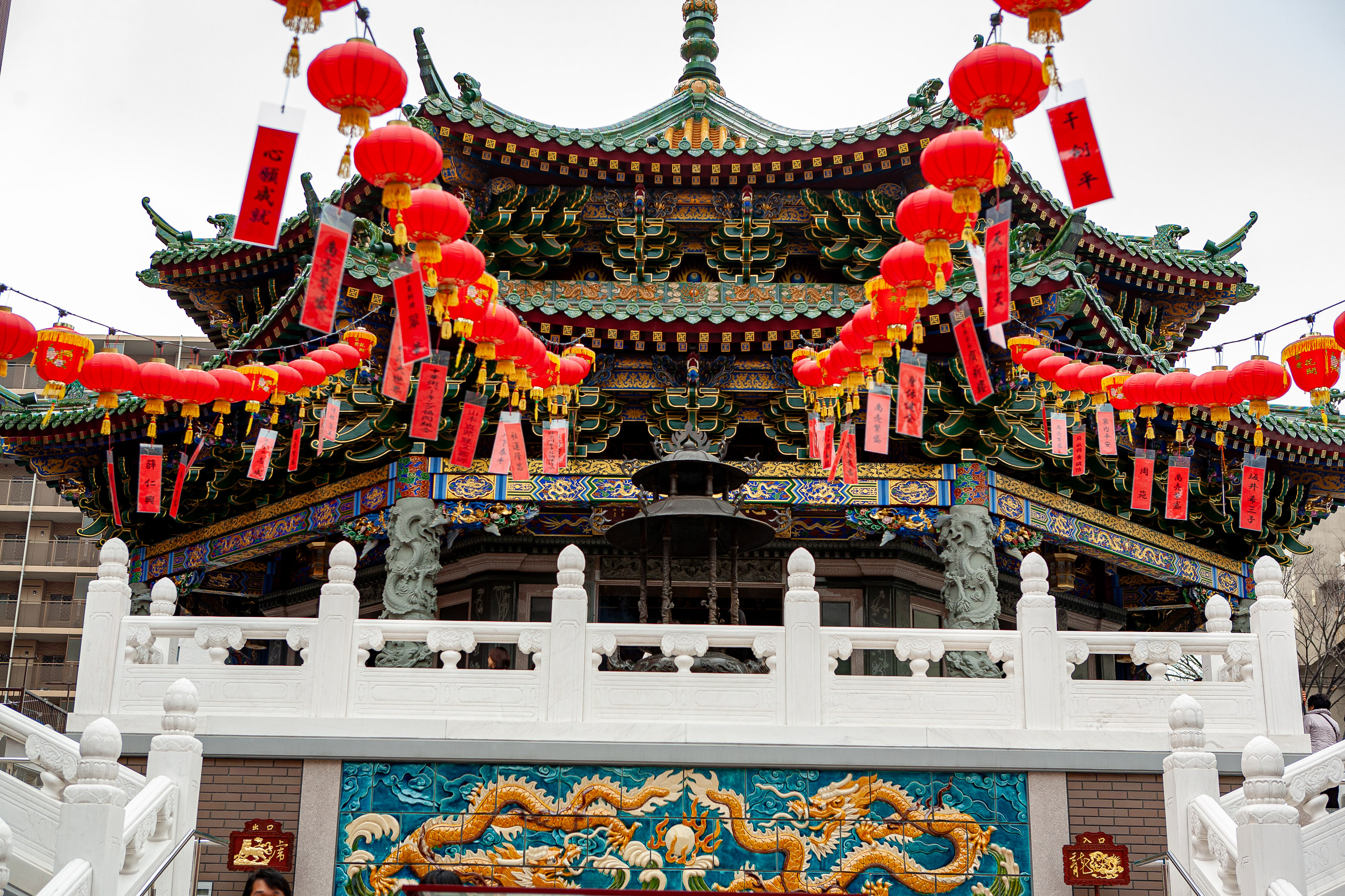 明日は旧正月の元日「春節」です。廟はすでに慶祝用の赤いちょうちんで彩られ、明日を頂点に中華街が華やぎます。(EOS 5D)