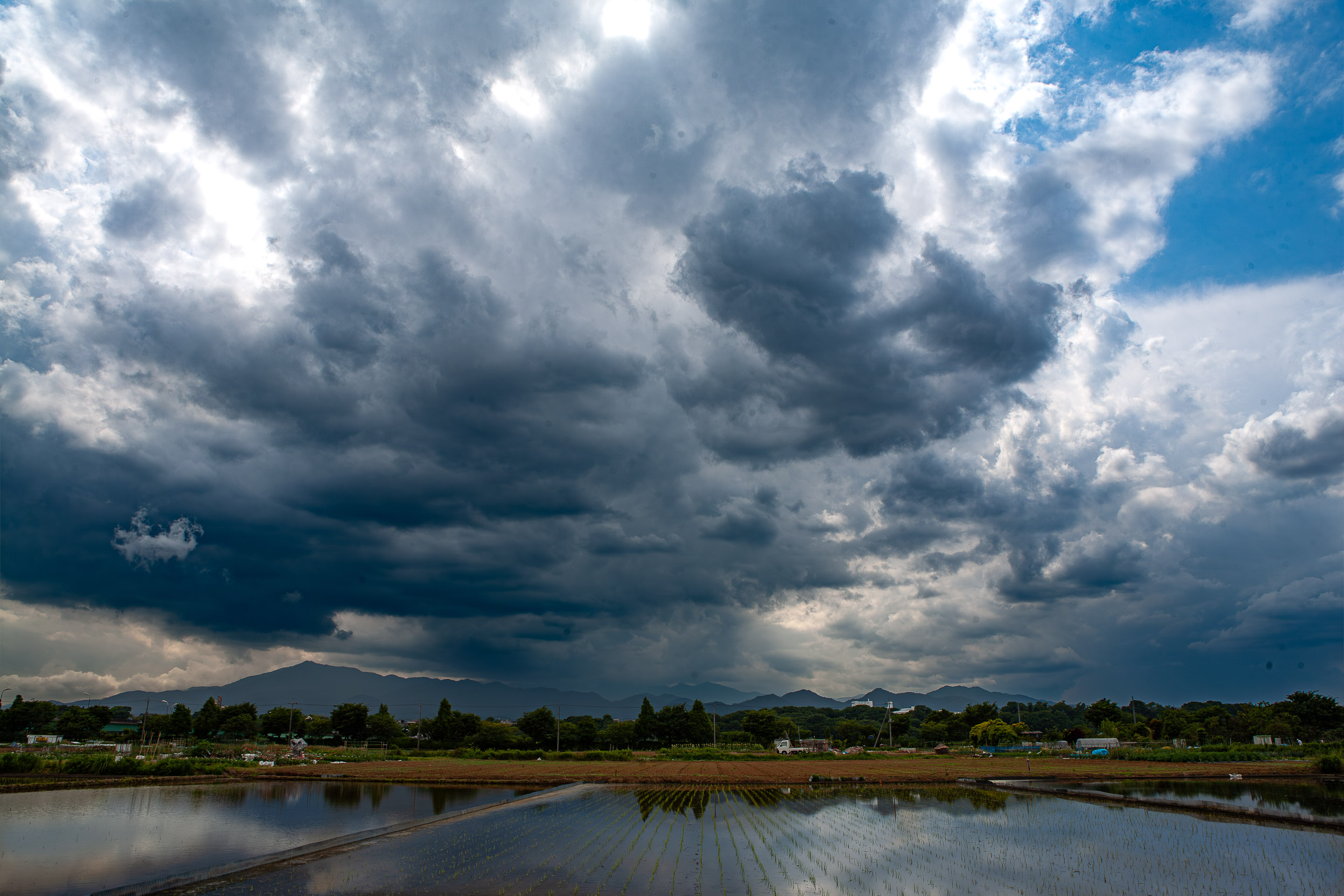 いつ雨が降ってもおかしくない天気の今日でしたが、ついに午後四時過ぎだったでしょうか、雷を伴う激しい雨が降り出しました。そのちょっと前まで座間市の新田宿周辺で田んぼと畑を撮っていました。