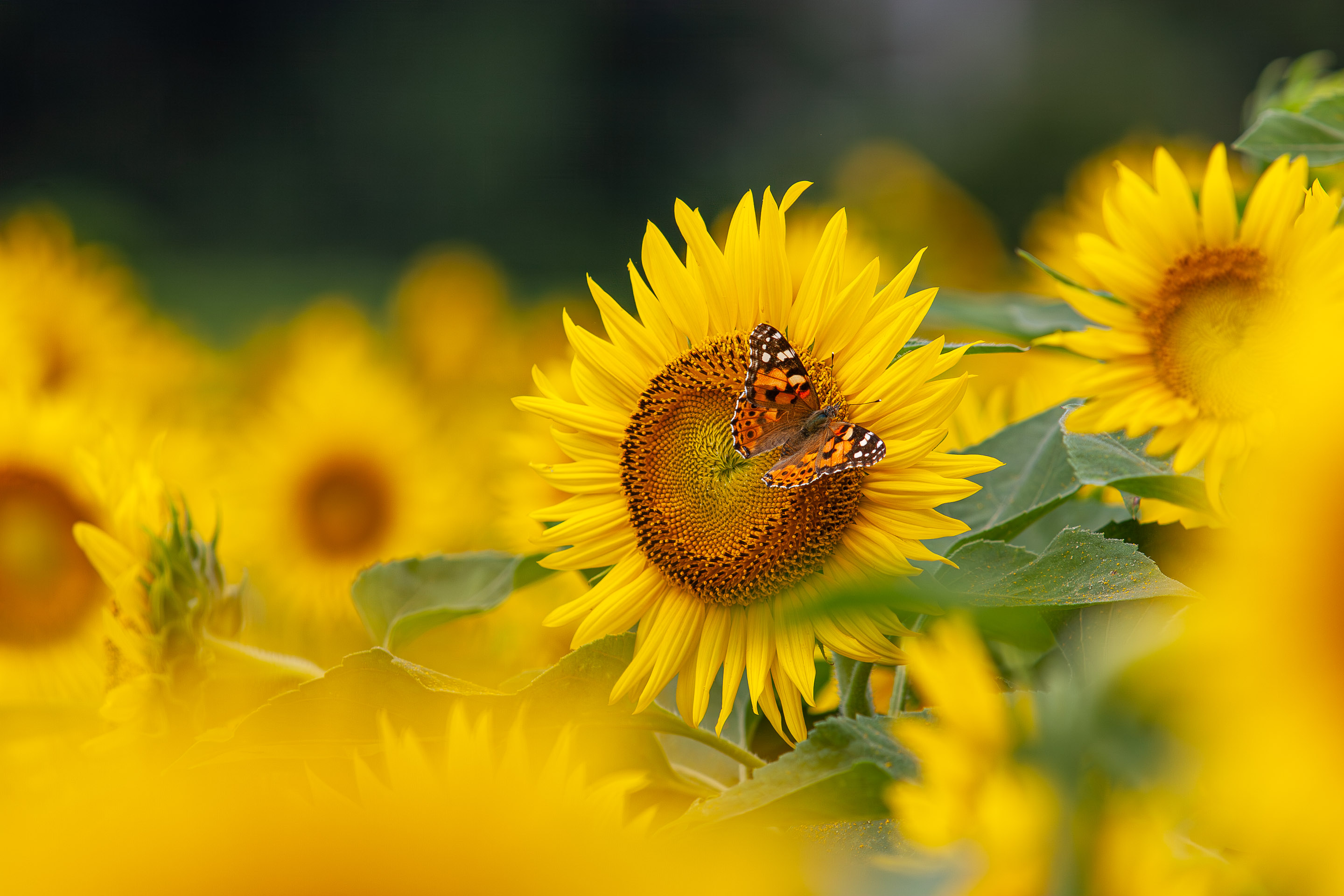 ひまわりも花だけ撮っているとつまらなく感じてくるので、昆虫たちを入れて撮りたくなります。ミツバチがうるさいほどに飛び交っていますので、何とか飛行中のハチをいっしょに撮ろうと思うのですが、チャンスはいくらでもあるのですが、なかなかピンが来ません。チョウもときどきやってくるのですが、遠かったりします。ハスの次は、ひまわり畑にしばらく通って、納得いくものを撮りましょう(^o^)。
