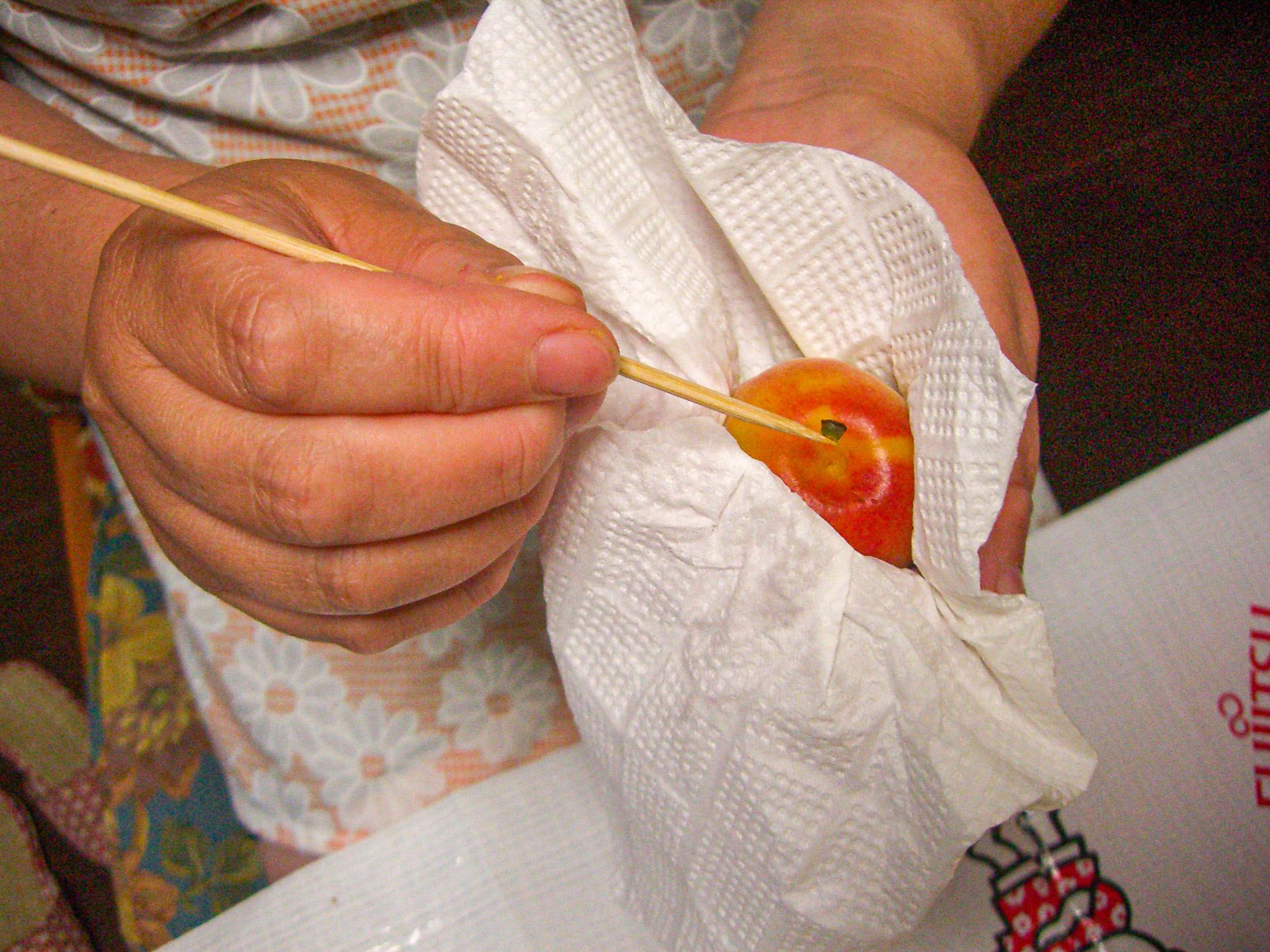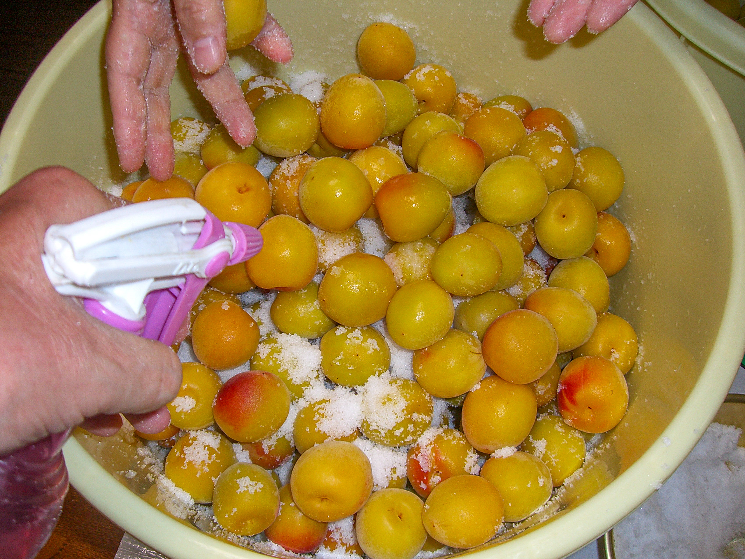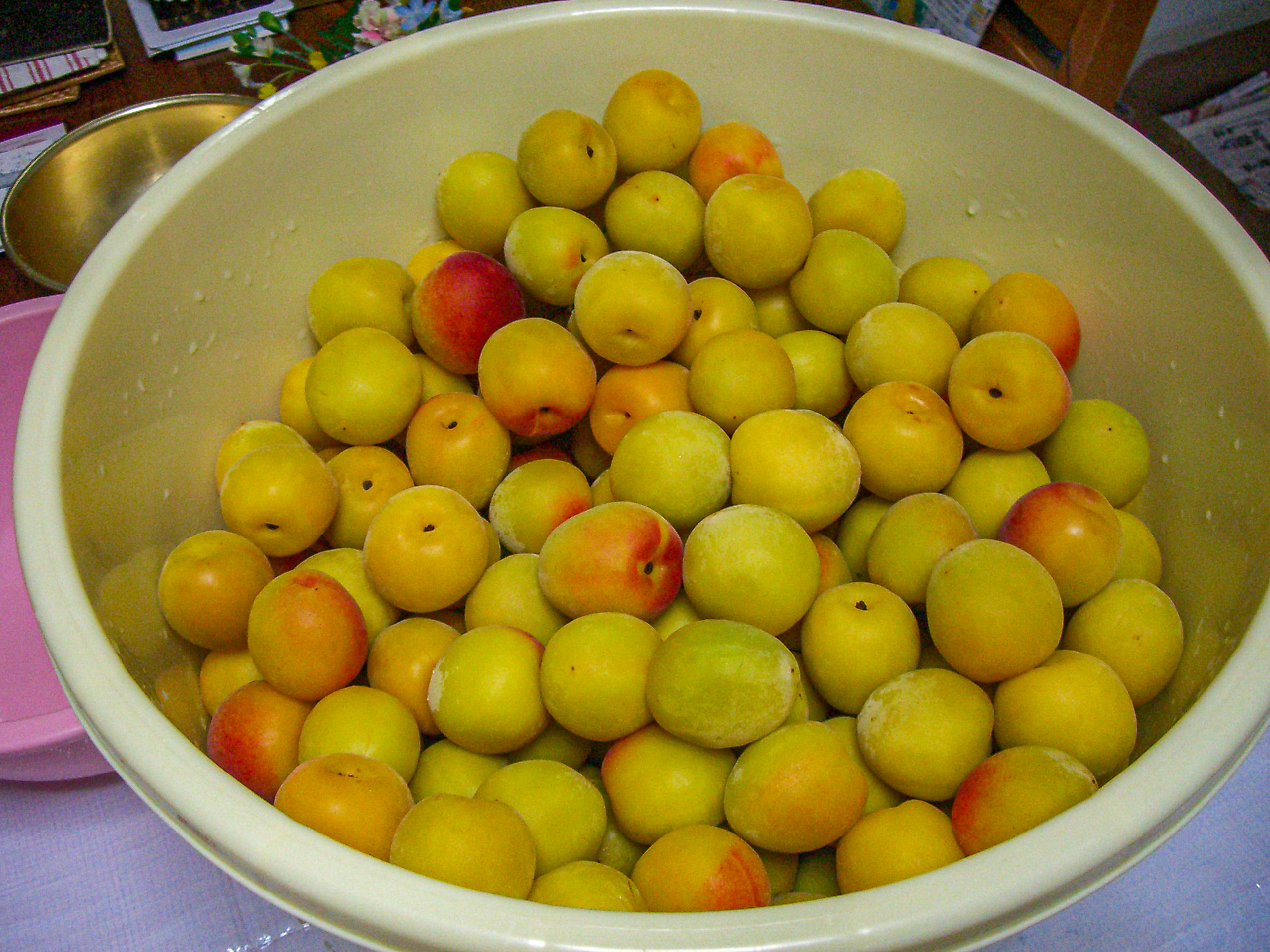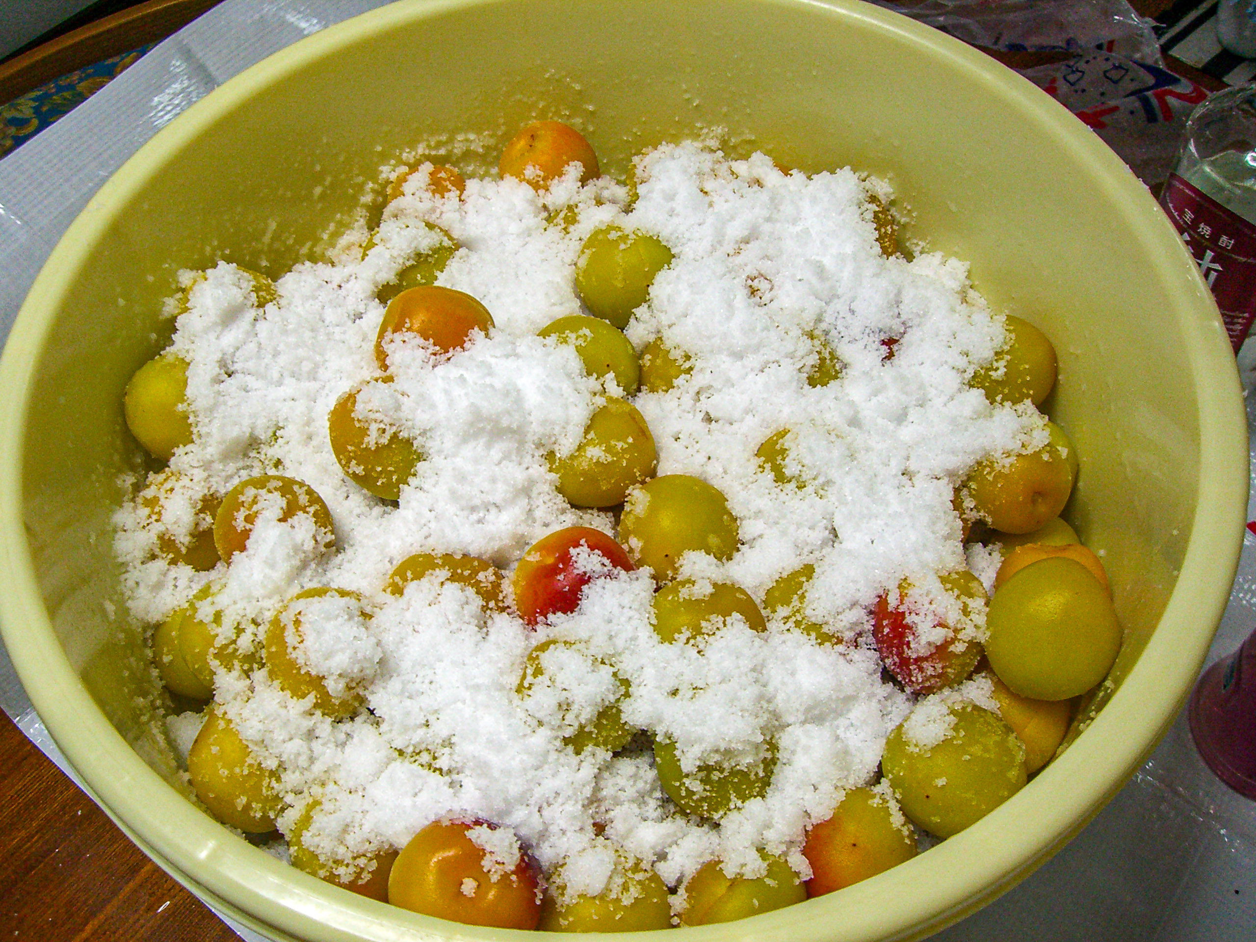 最後は、梅干しです。最近は、お盆前のこの時期がベスト梅干し日和と思っています(^o^)。三日三晩、ときどき割り箸で梅を返しながら、干し続けます。(PS-G7,EX-S500) |
