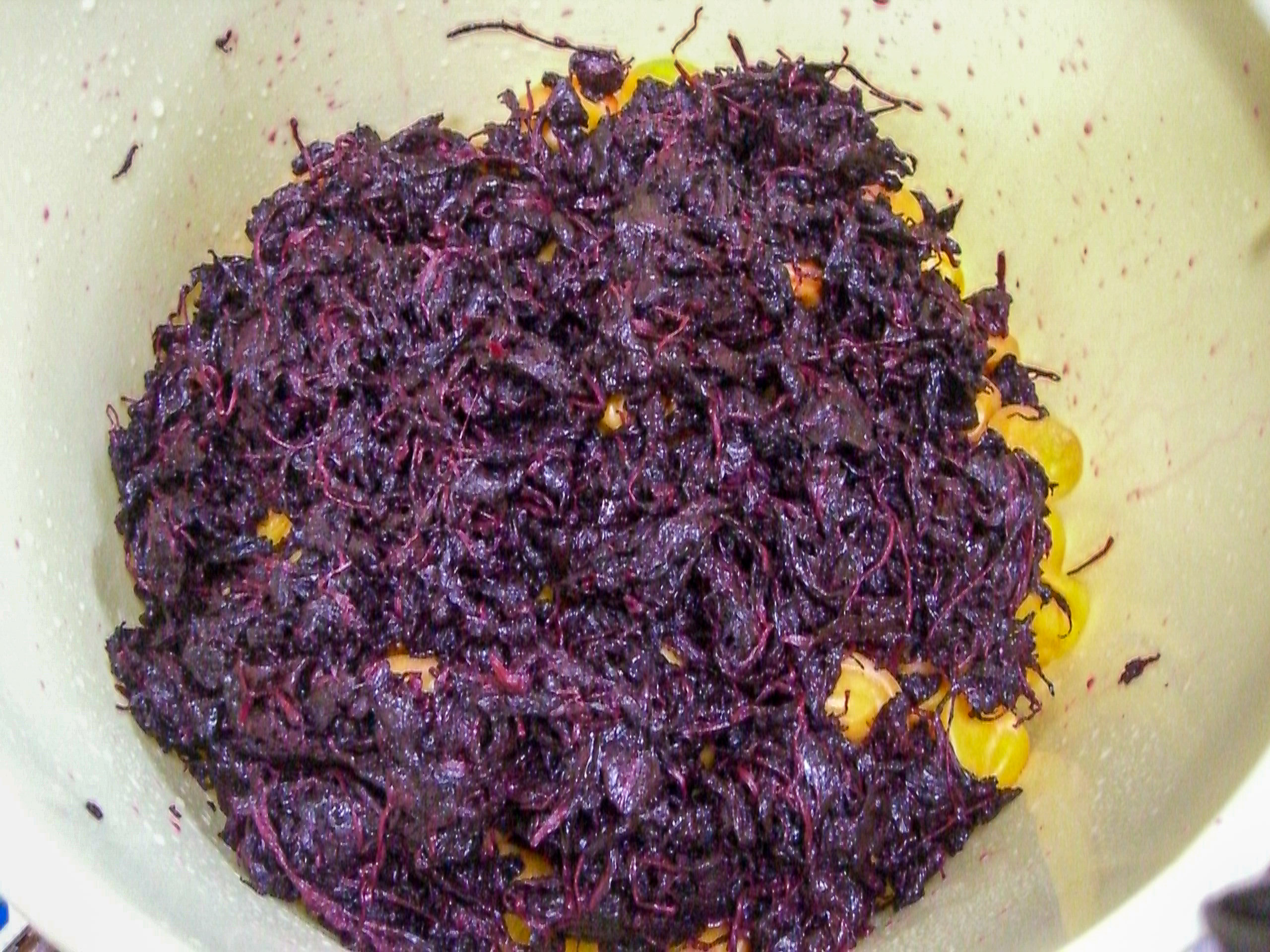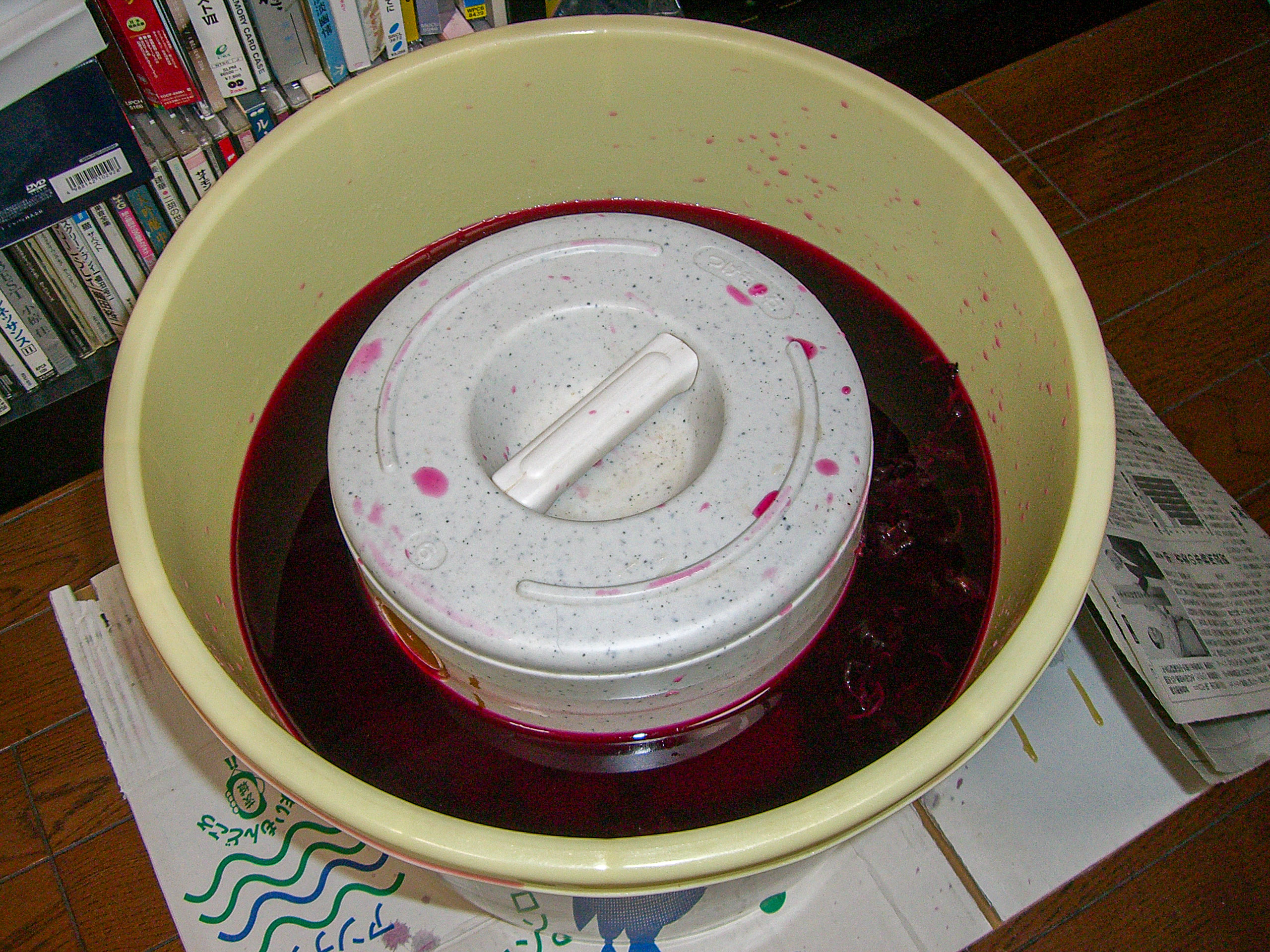 途中、10日ぐらいしたら、別の樽に移し替えて漬け込みます。上にあった梅が今度は下になりますね。こうすると赤ジソによる発色が偏らず、均一になります。
