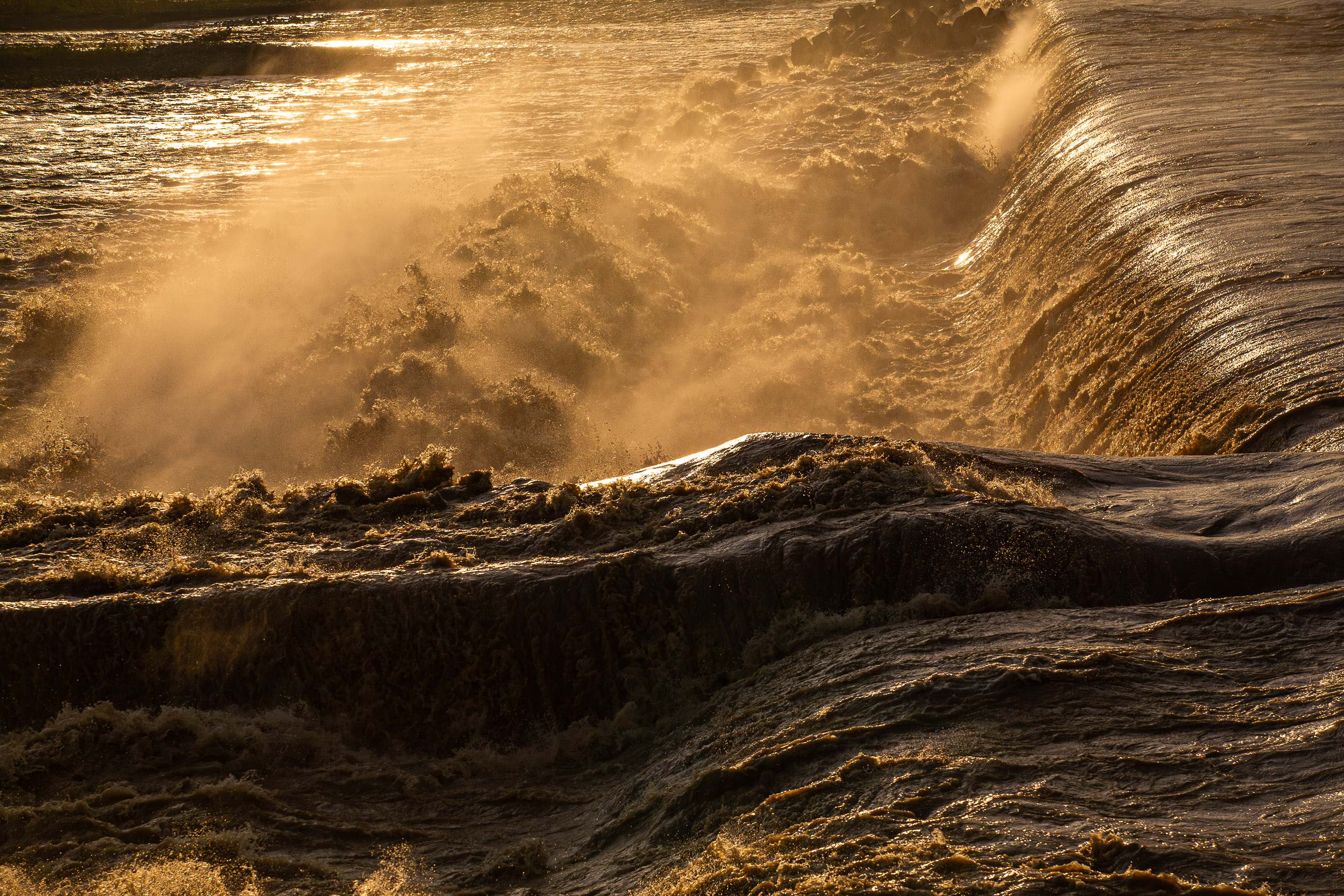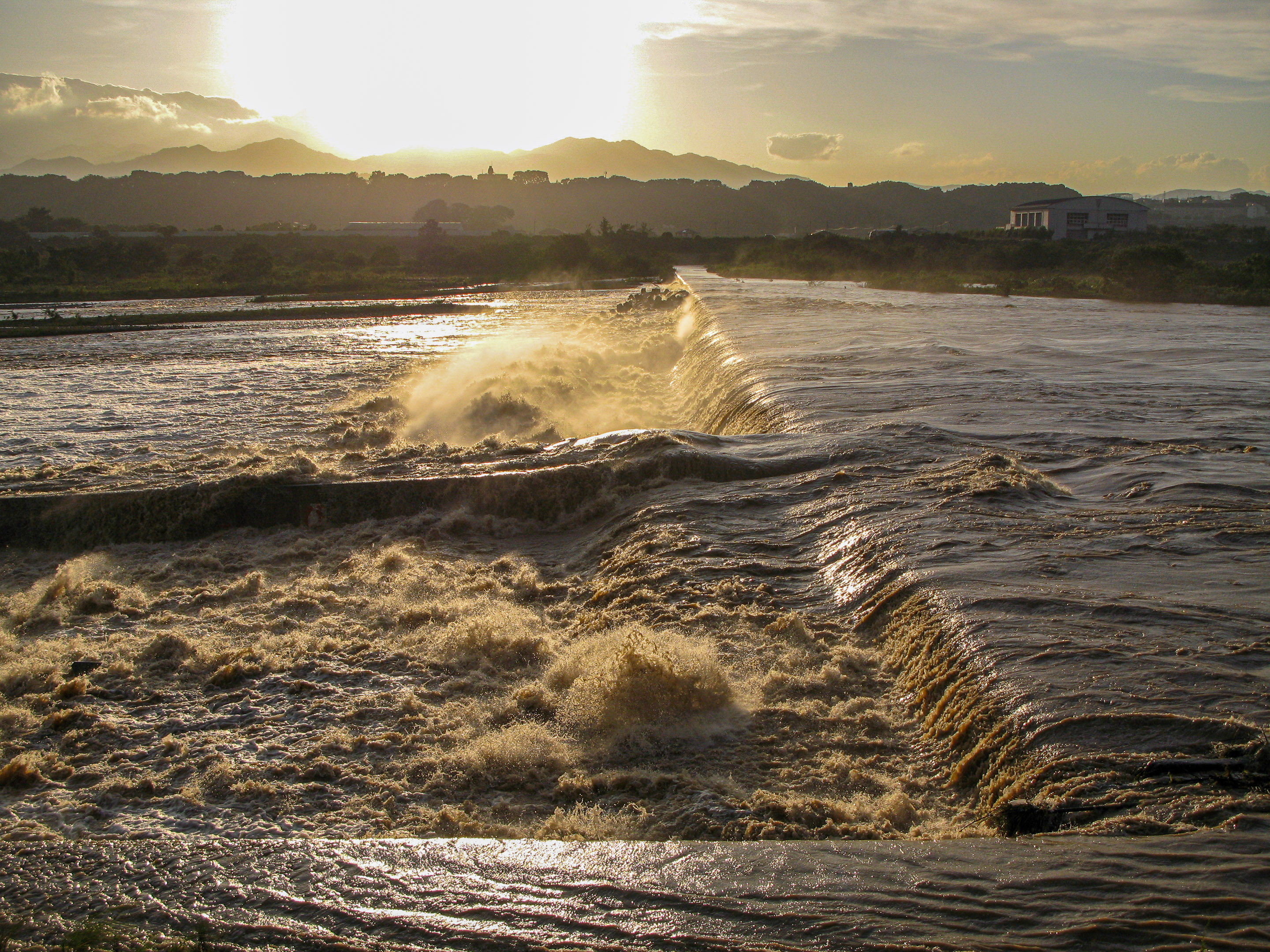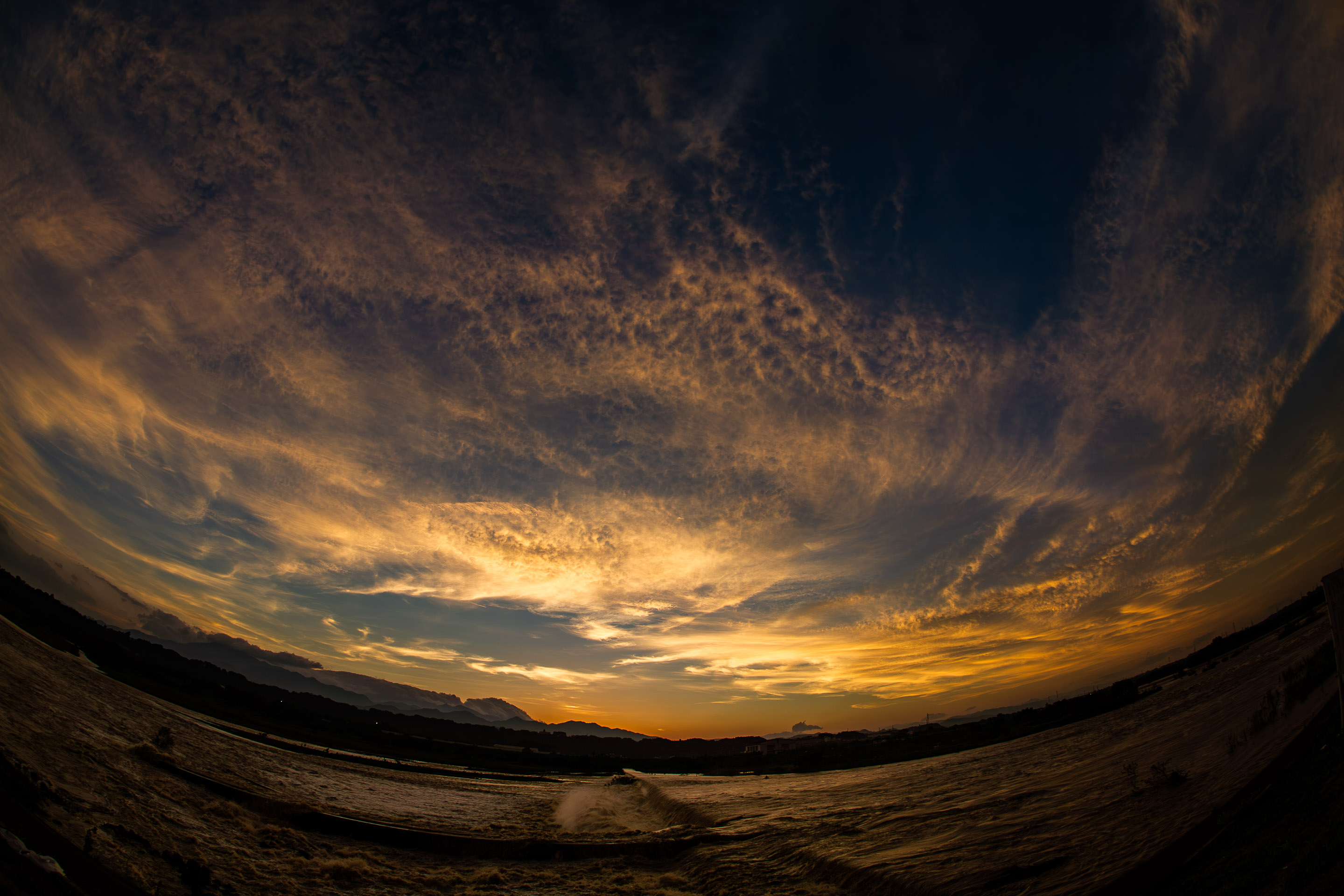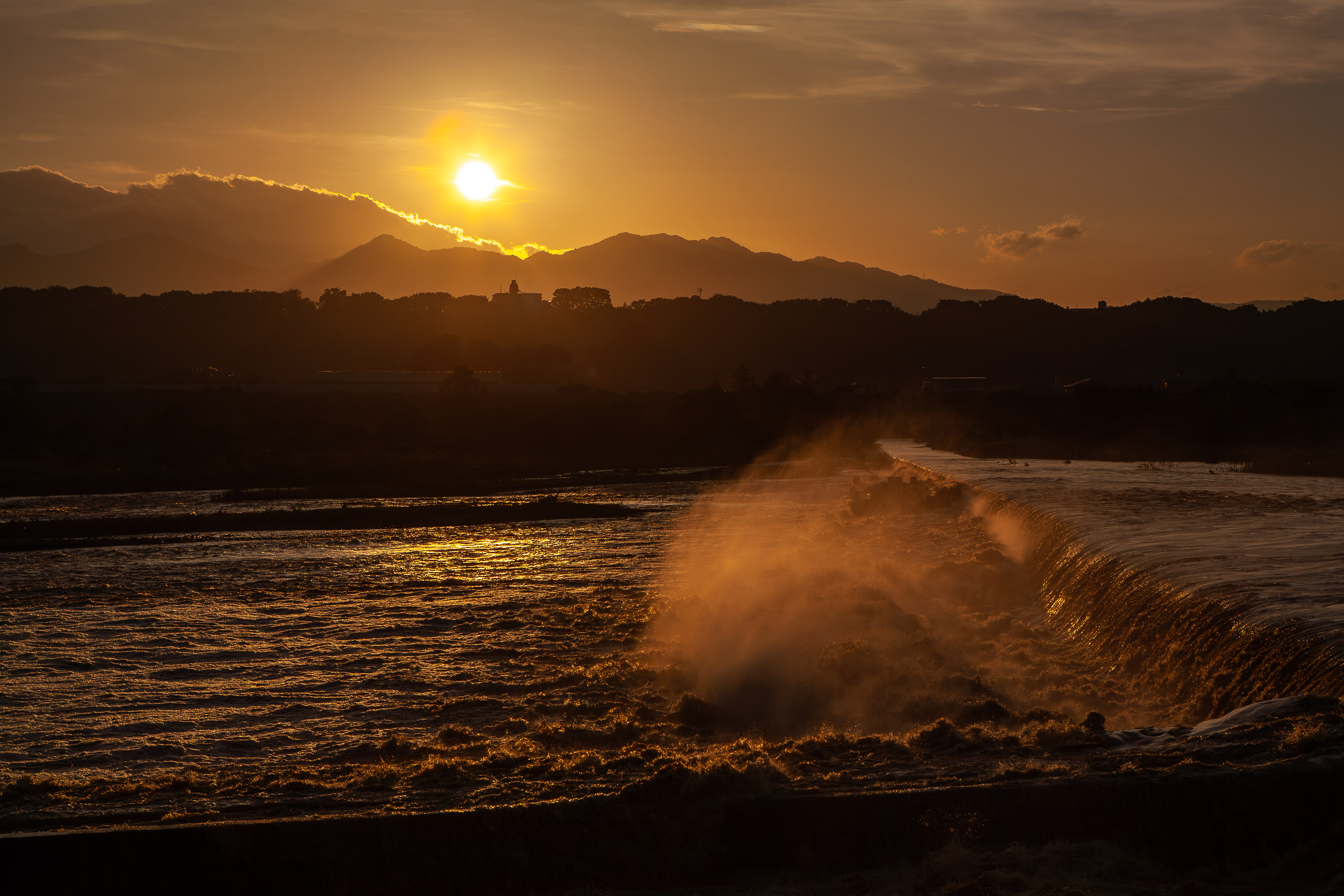 ちょっと夕陽を撮るつもりでいたのが、川の迫力であっけにとられているうちに、またたく間に陽が傾いてきました。今日は、夕陽のアップより夕焼けの様子を捉えるため、15mmの魚眼も持ってきました。思ったほどの夕焼けにはなりませんでしたが、陽が山に隠れてから赤く染まってくれました。しかし、夕焼けのバックにしたとき、荒々しい川より穏やかにゆったり流れる川の方がやはりほっとできますね。今回は特別な状況でした。また、機会をみて来てみましょう。(EOS