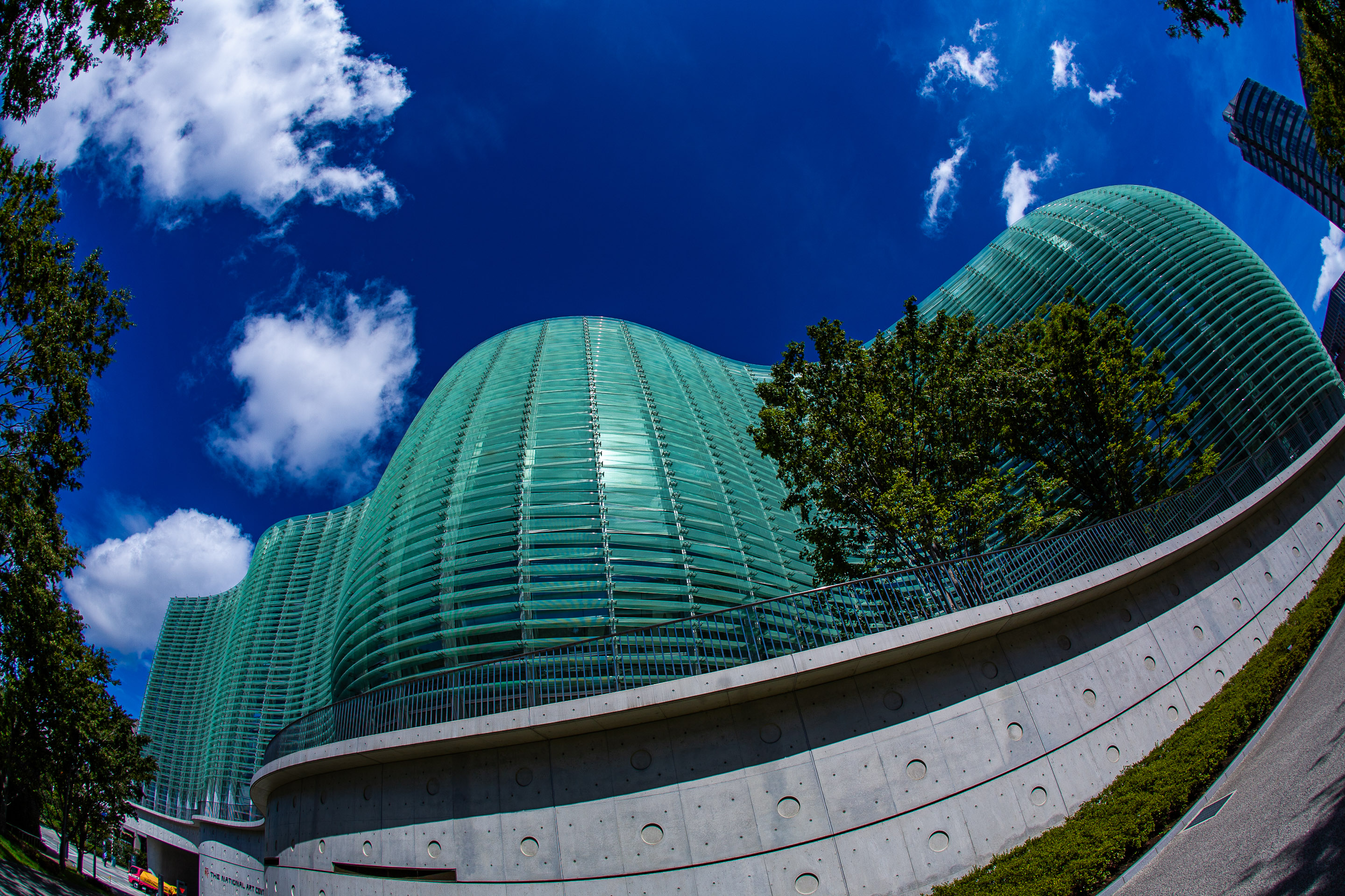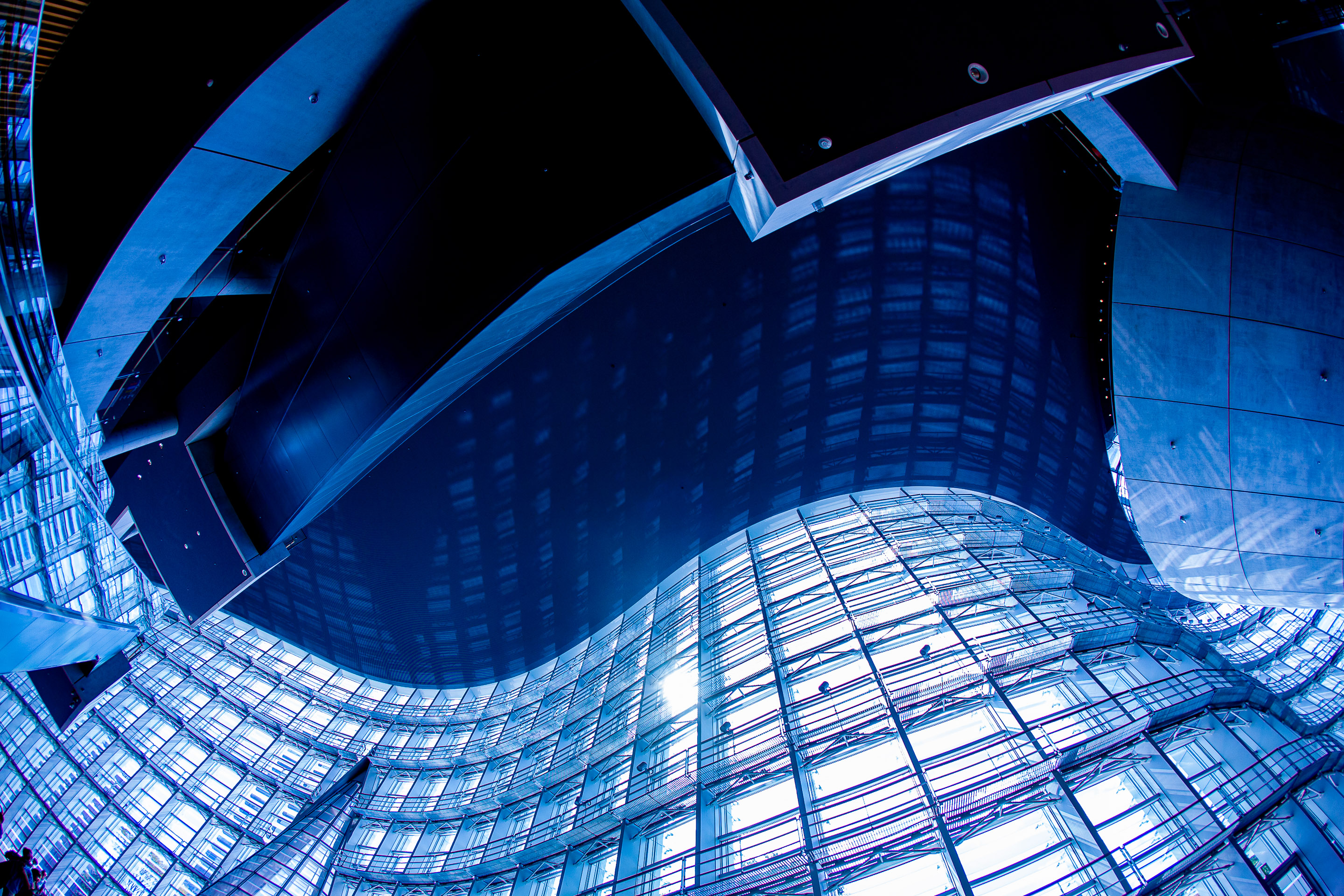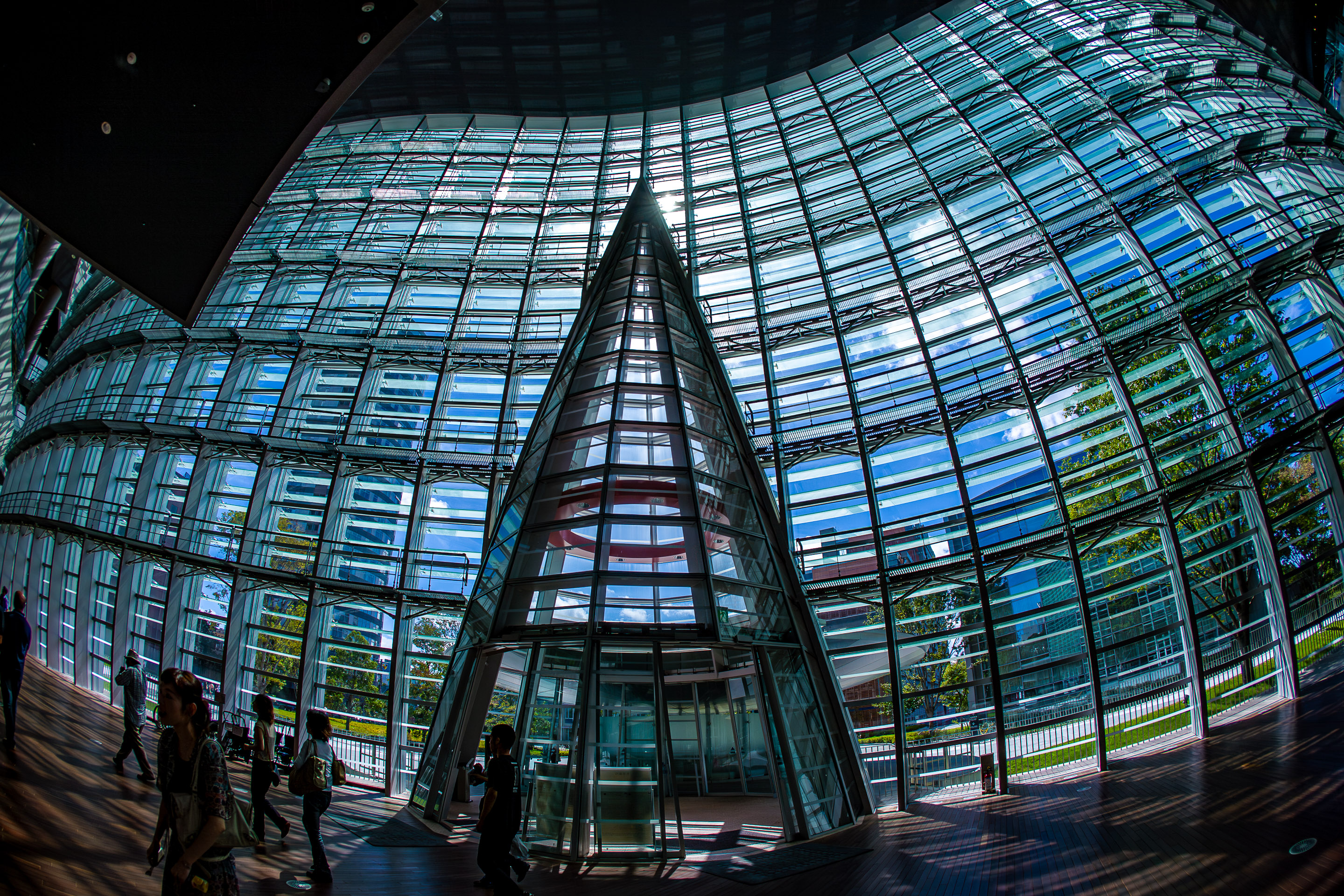 目的は「国立新美術館」(新東京美術館)です。地下鉄千代田線の乃木坂駅から美術館が直結していますね。外観を眺める前に中に入ってしまいました。さすが奇才・黒川紀章の設計だけあり、ユニークです。やはり政治家には向きませんね(笑)。エントランスホールというのでしょうか、それの前面を覆う「ガラスカーテンウォール」が大きく波打った独特のスタイルをしており、建物に強烈なインパクトを与えるものになっています。