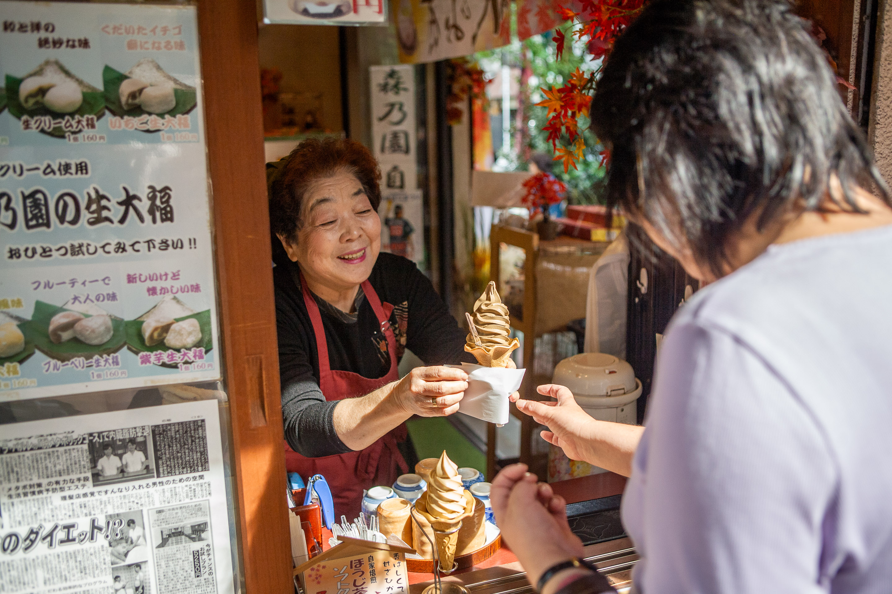 通りに入っていくと、ほうじ茶のお店があり、愛想のいいおばさんがいました
