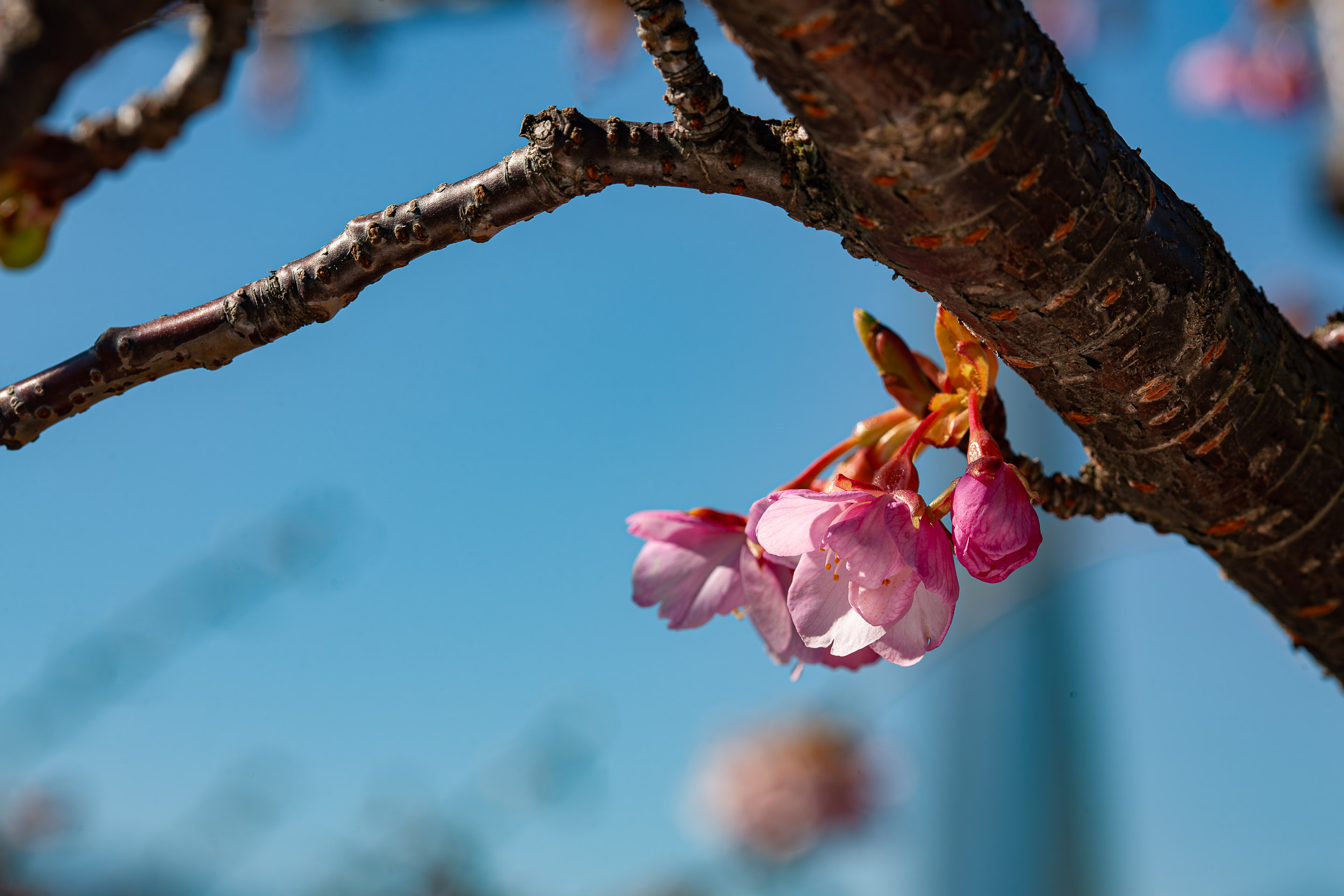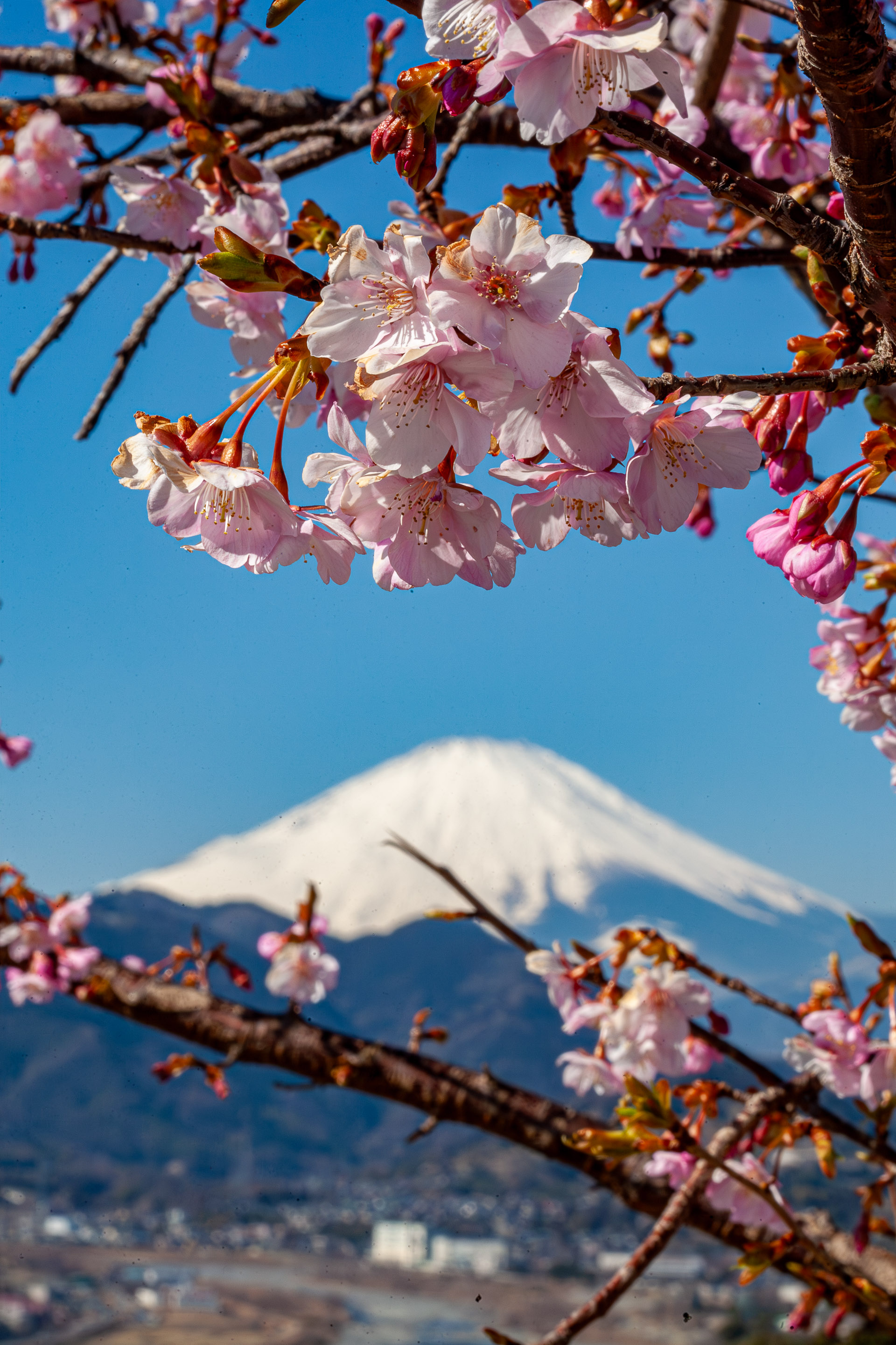 河津桜も本家の伊豆河津町以外でも結構あちこちで見られるようになりました。ここ神奈川県松田町でも、河津桜が斜面にたくさん植えられています。まだ、ほとんど咲いていないとわかっていたのですが、お天気がよかったので、様子を見に行きました。やはり、ちらほら、という感じでほとんどの木は蕾ばかりです。その中でいくつか花を咲かせているのがありましたので、少しばかり下見感覚で撮ってきました。まだ、当然、メジロも来ていません。富士山が間近できれいでしたので、無理矢理収めてみました(^^ゞ。