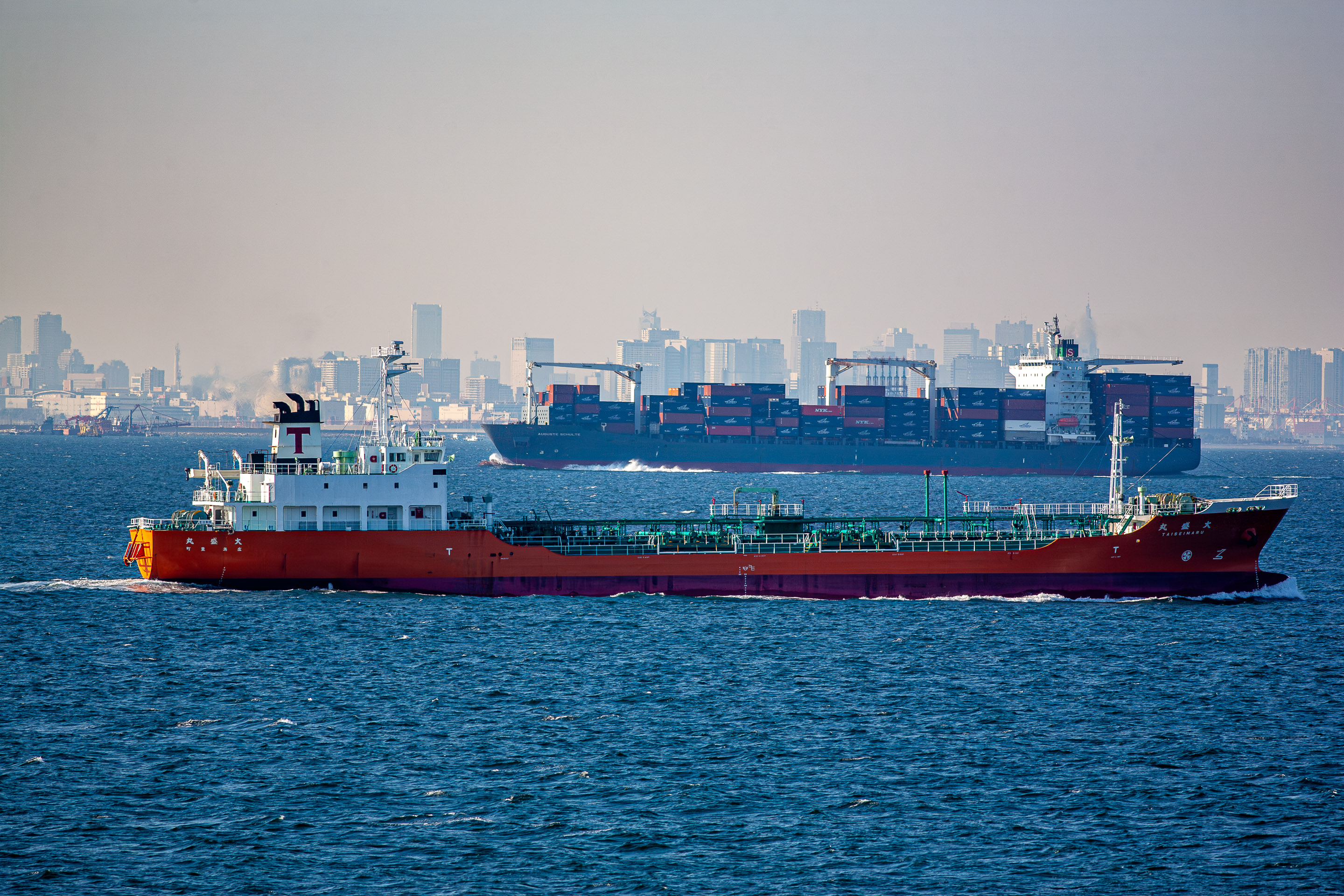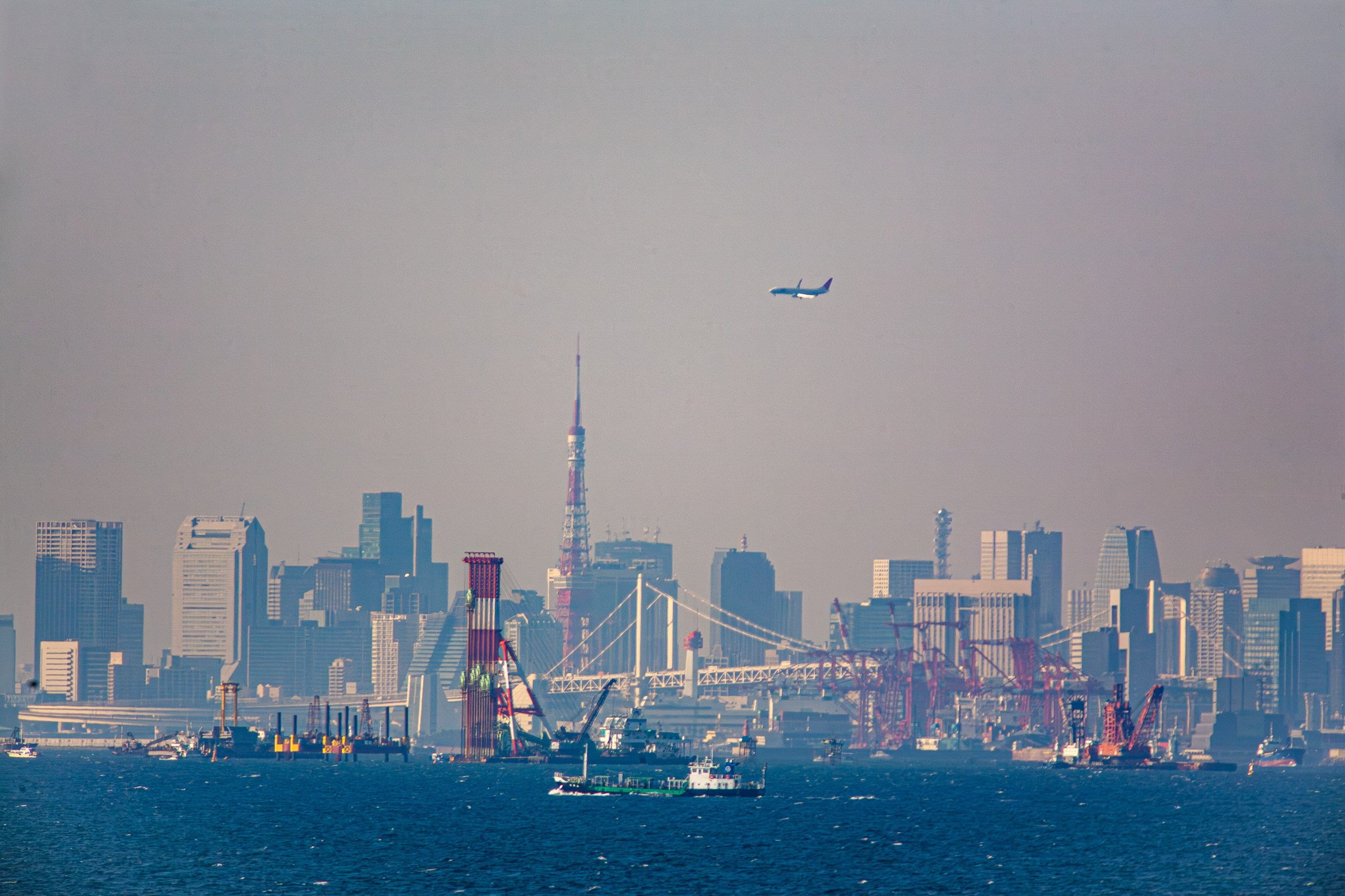 東京方面のビルを背景に行きかう船 貨物船や作業船がひっきりなし |