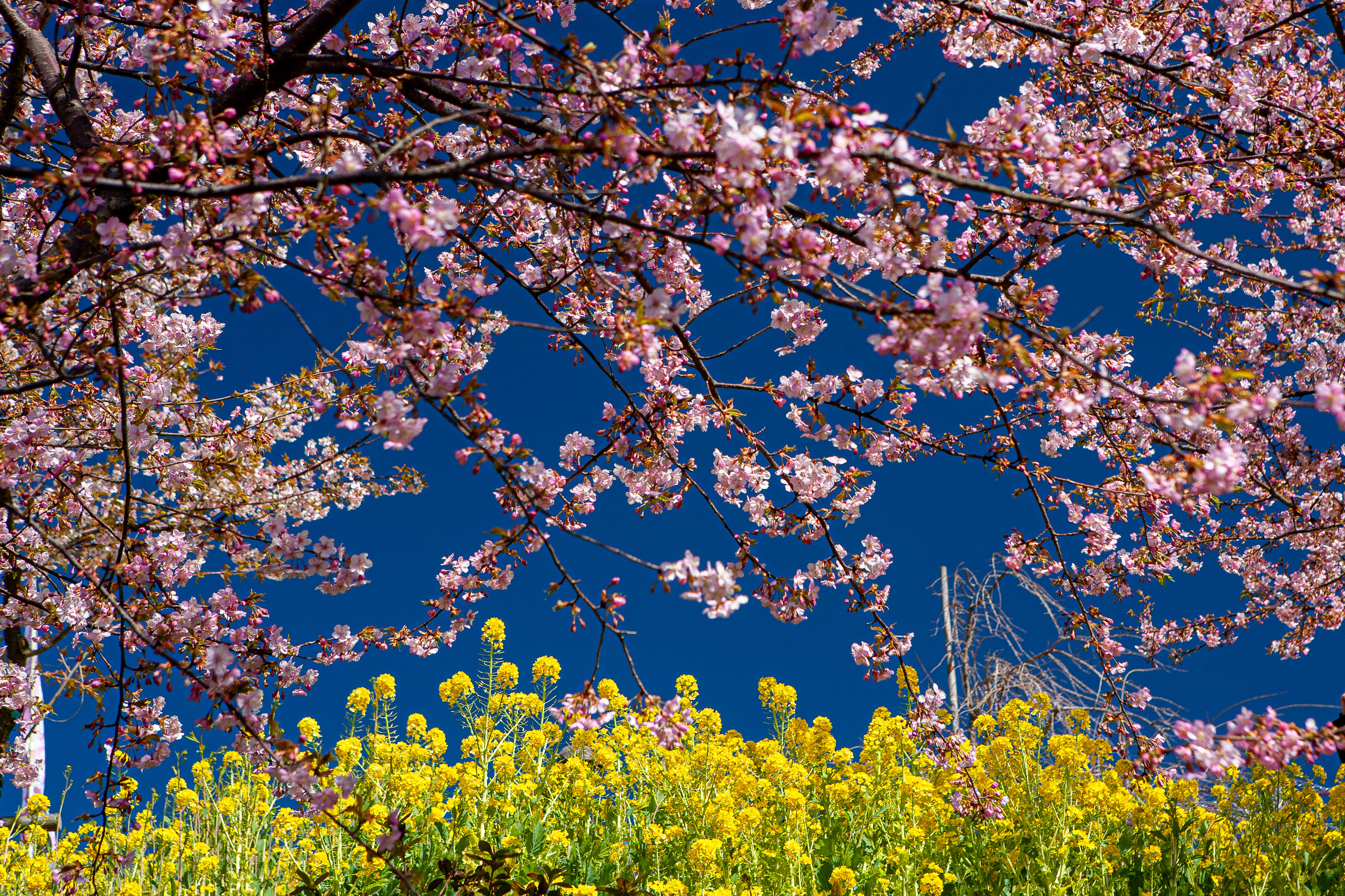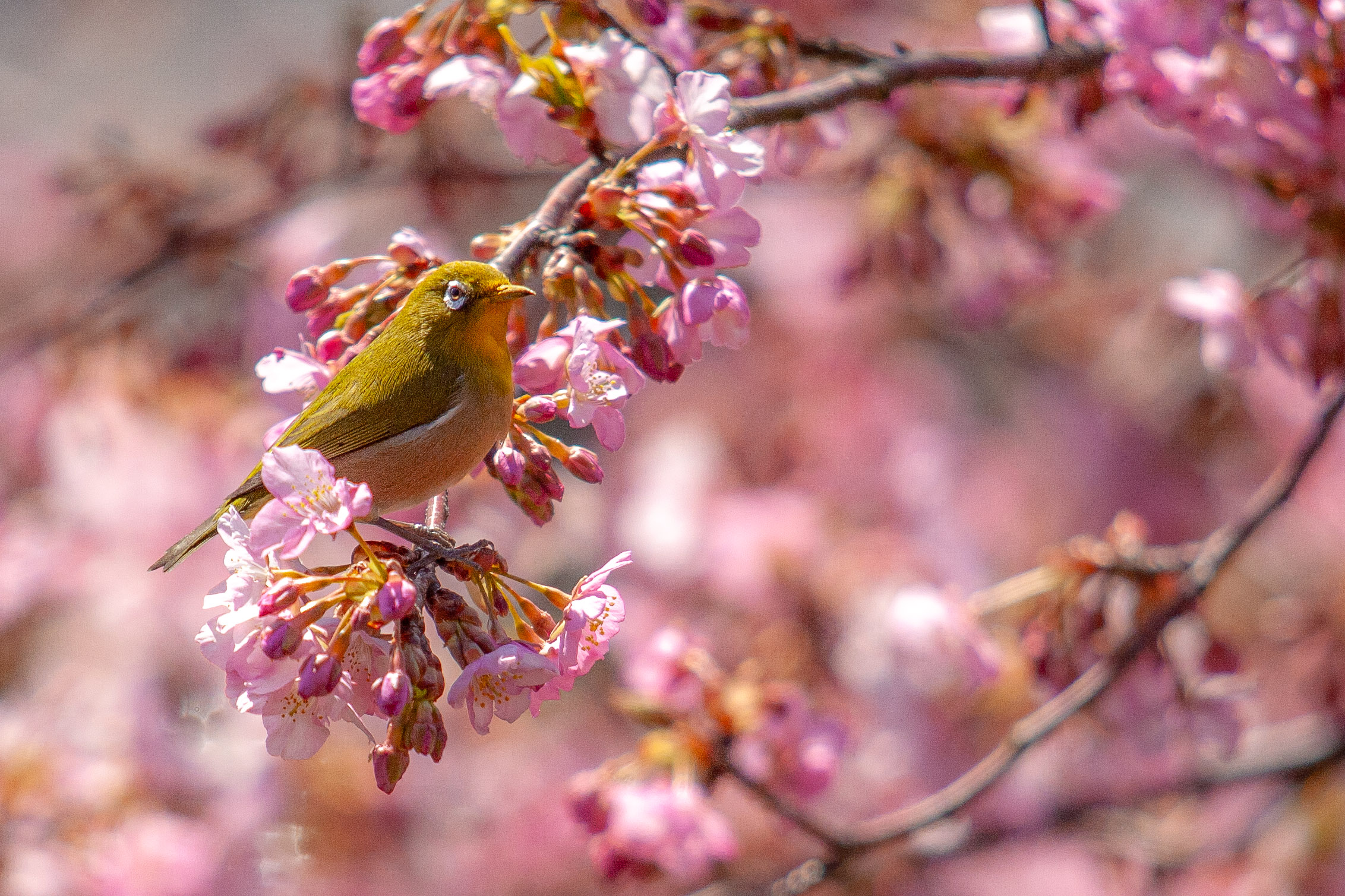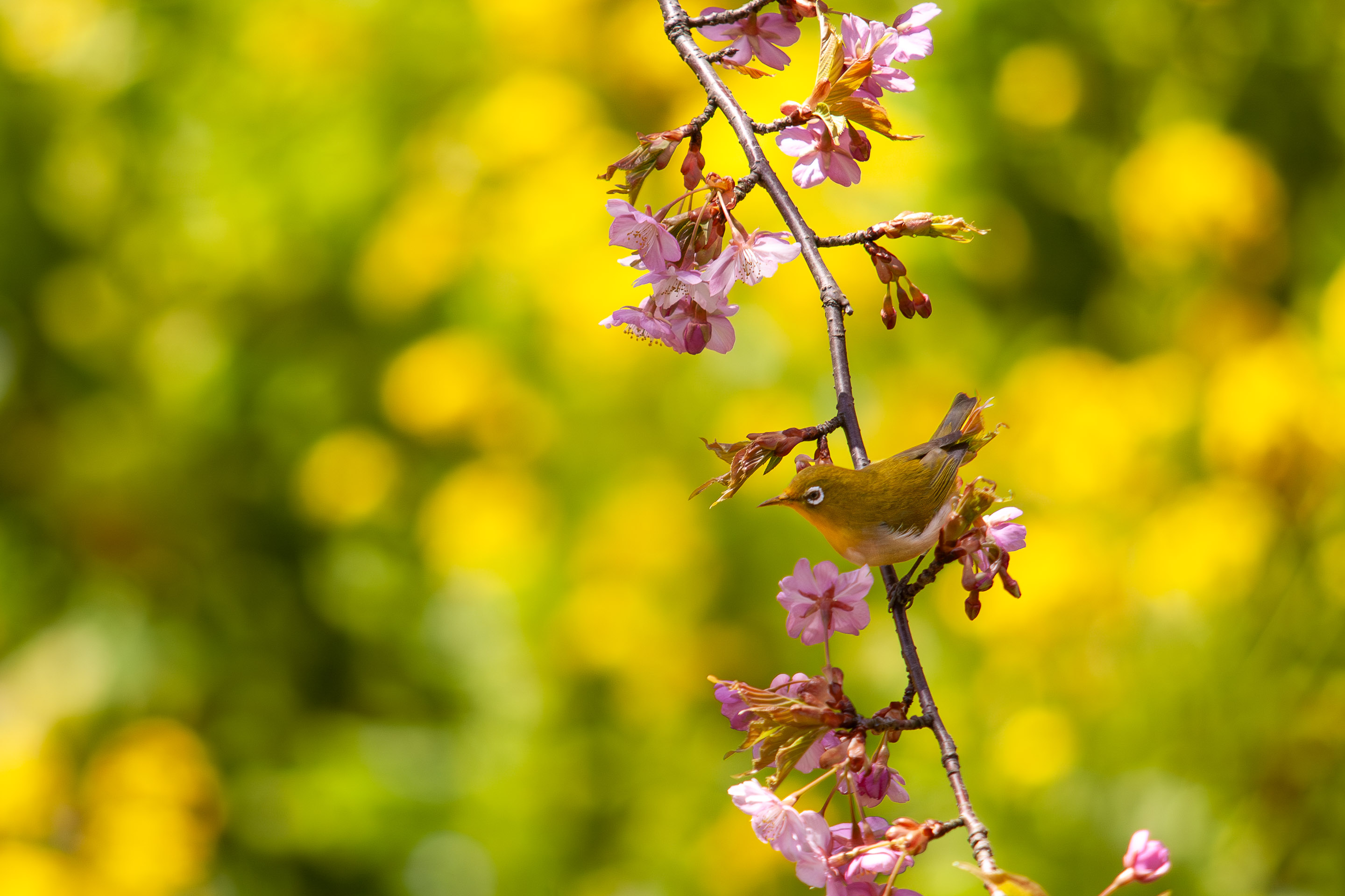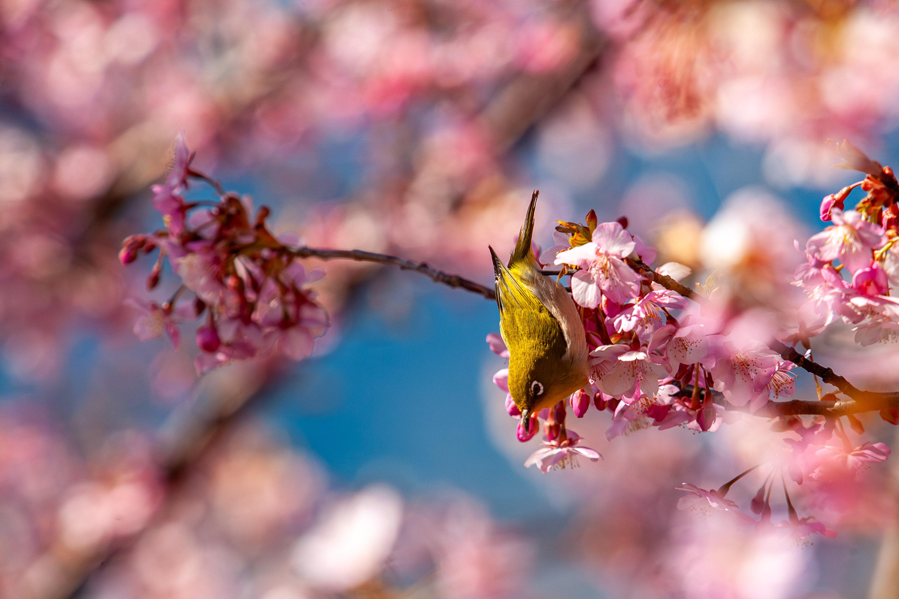 今回はアブラナも植えられ、桜にアクセントをつける方法も他の桜の名所から学びましたね。空の青、桜のピンク、アブラナの黄色、草の緑と華やかな色の組み合わせがよかったです。メジロもたくさん来ていたのですが、以前のように近寄って撮影ができなくなったので、なかなかいいショットが撮れませんでした。これだけ観光地になってしまうと、また来るには躊躇してしまいますが、木がもっと大きくなったころ来てみたいですね。