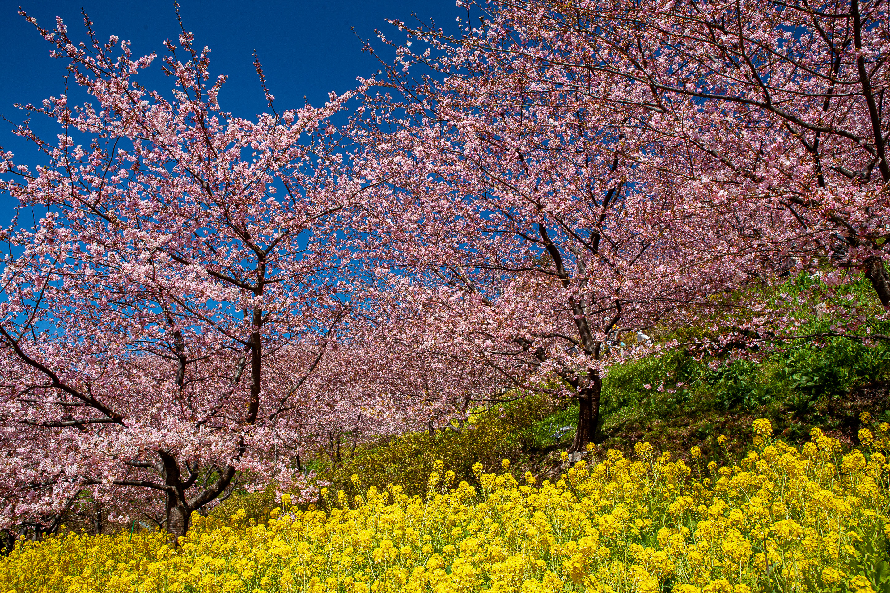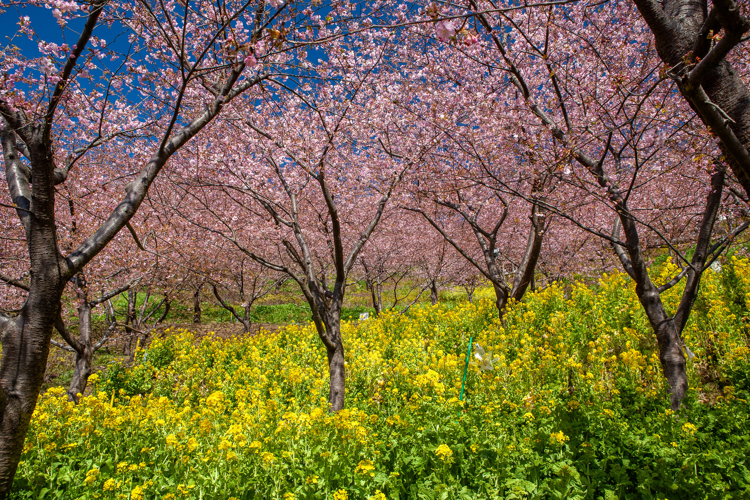 | 先月訪れた神奈川県松田町の「松田山ハーブガーデン」の河津桜を再び見に行ってきました。今日あたりがよく晴れて満開状態を見られる絶好の日だと思いました。そう思ったのは私だけではなく、大勢の人たちでした。  河津桜が見られるハーブガーデンには駐車場があるのですが、私が着いた9時半ではすでにいっぱいで、臨時の駐車場が10分ほど離れた酒匂川の河川敷につくられていました。車はここに置いて、ここからは、少し離れたところにハーブガデンとのシャトルバス発着場がこれまた臨時にできており、すし詰め状態のバスに乗って行きました。
