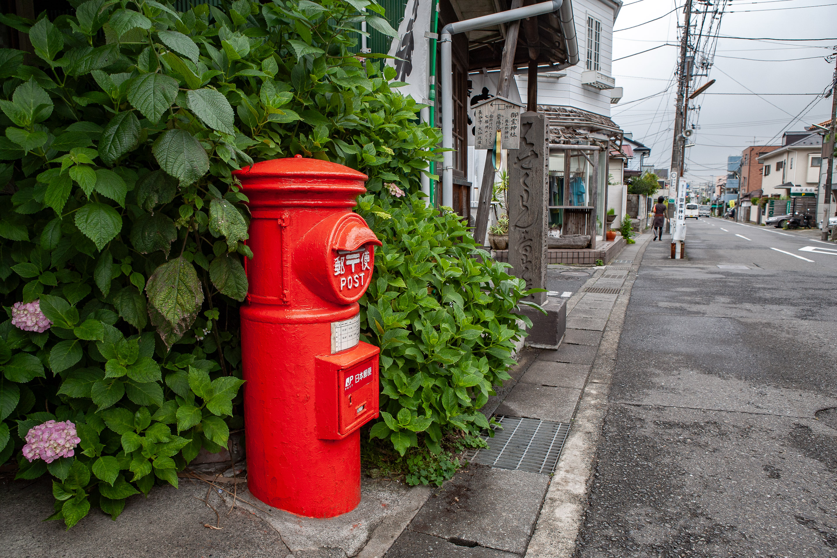 「力餅家」の脇には古いポスト まだ紫陽花の花が少ない |