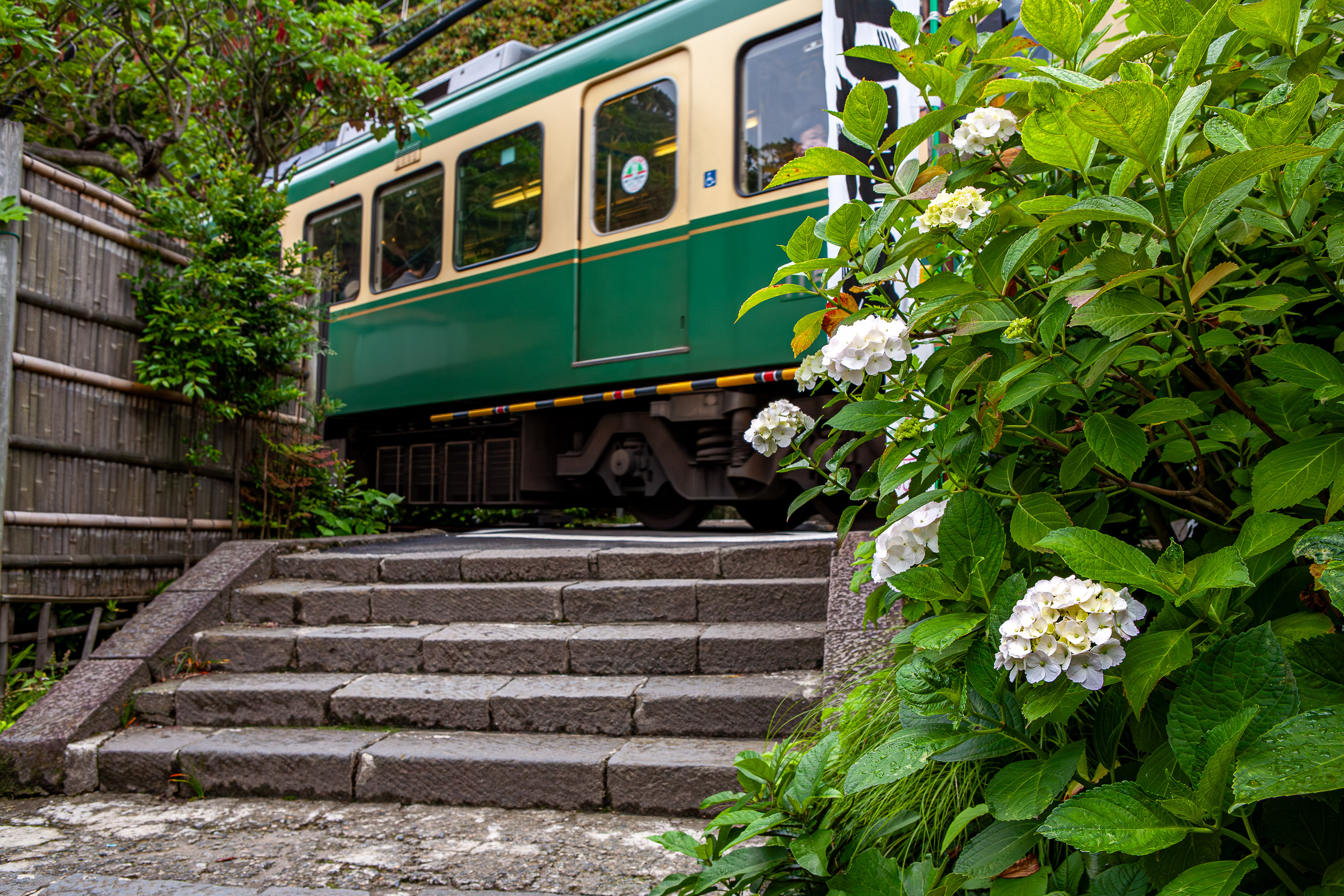 御霊神社境内のすぐ横を江ノ電が走ってます |