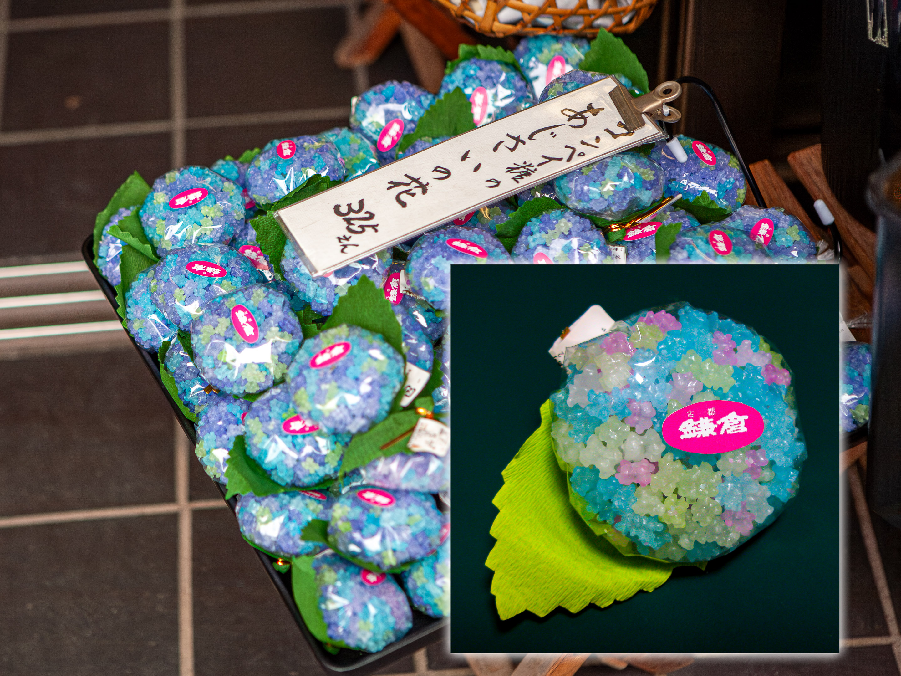 今日の鎌倉の紫陽花は、六分咲き?といったところでしょうか。帰り際、長谷寺参道のみやげもの店で、紫陽花の形と彩りの金平糖を見つけ、2種類ばかり買い、おかみさんに「長谷寺の紫陽花はどうですか?」と聞くと、「いえ、まだいくらも咲いていないようです。もう少し先がいいかもしれませんね。6月いっぱいは見られますよ。」とのことで、長谷寺に参るのはやめて帰途につきました。ちょっと消化不良気味でしたが、楽しみはまたの機会にとっておきましょう(^-^)。(EOS