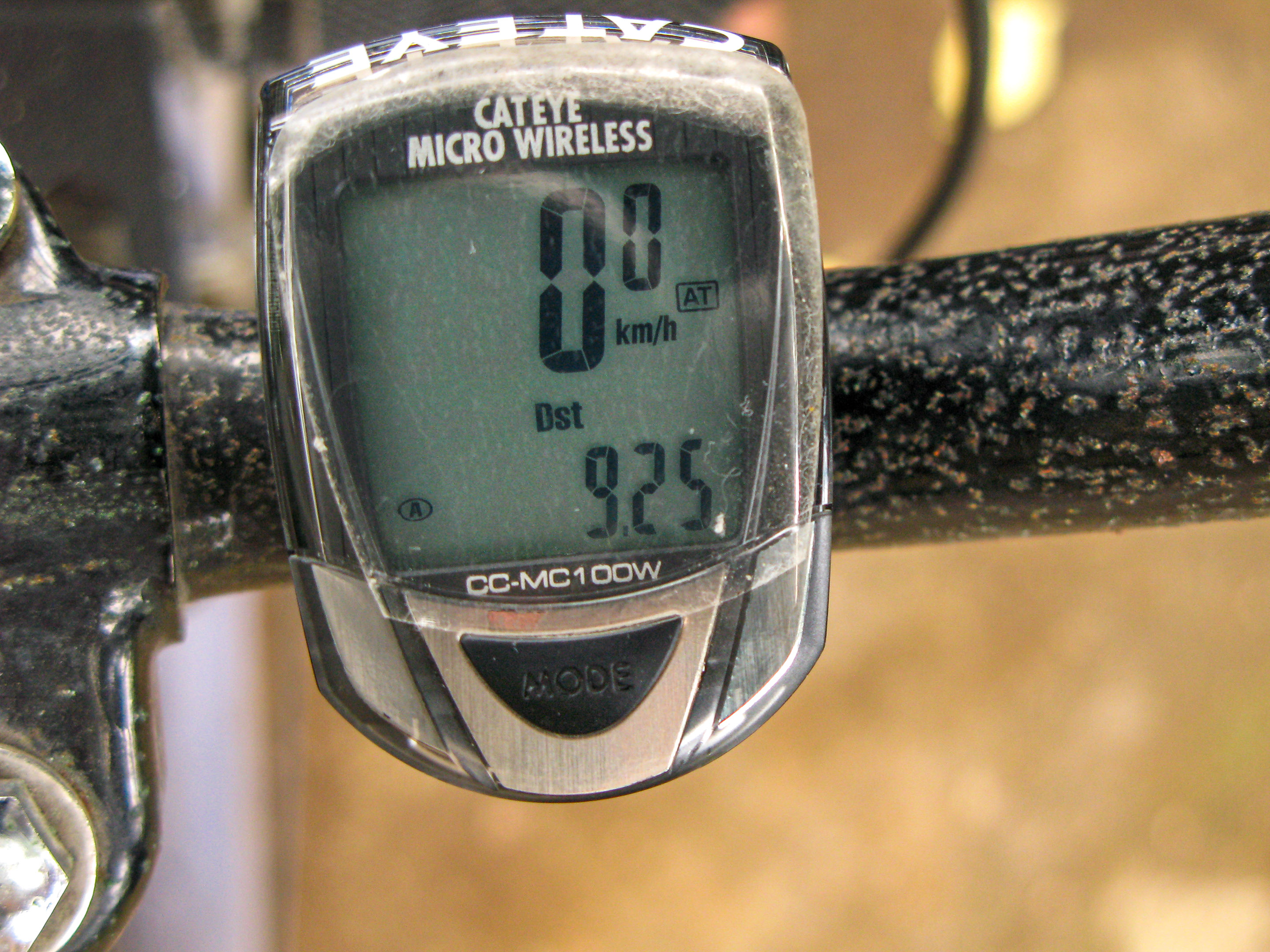 上の大きい数字は走っているときの時速 下はスタート時から現在までの距離数 今は、9.25kmの地点 他に時刻、走行時間数、最高時速、 平均時速、総走行距離が表示できます。 |