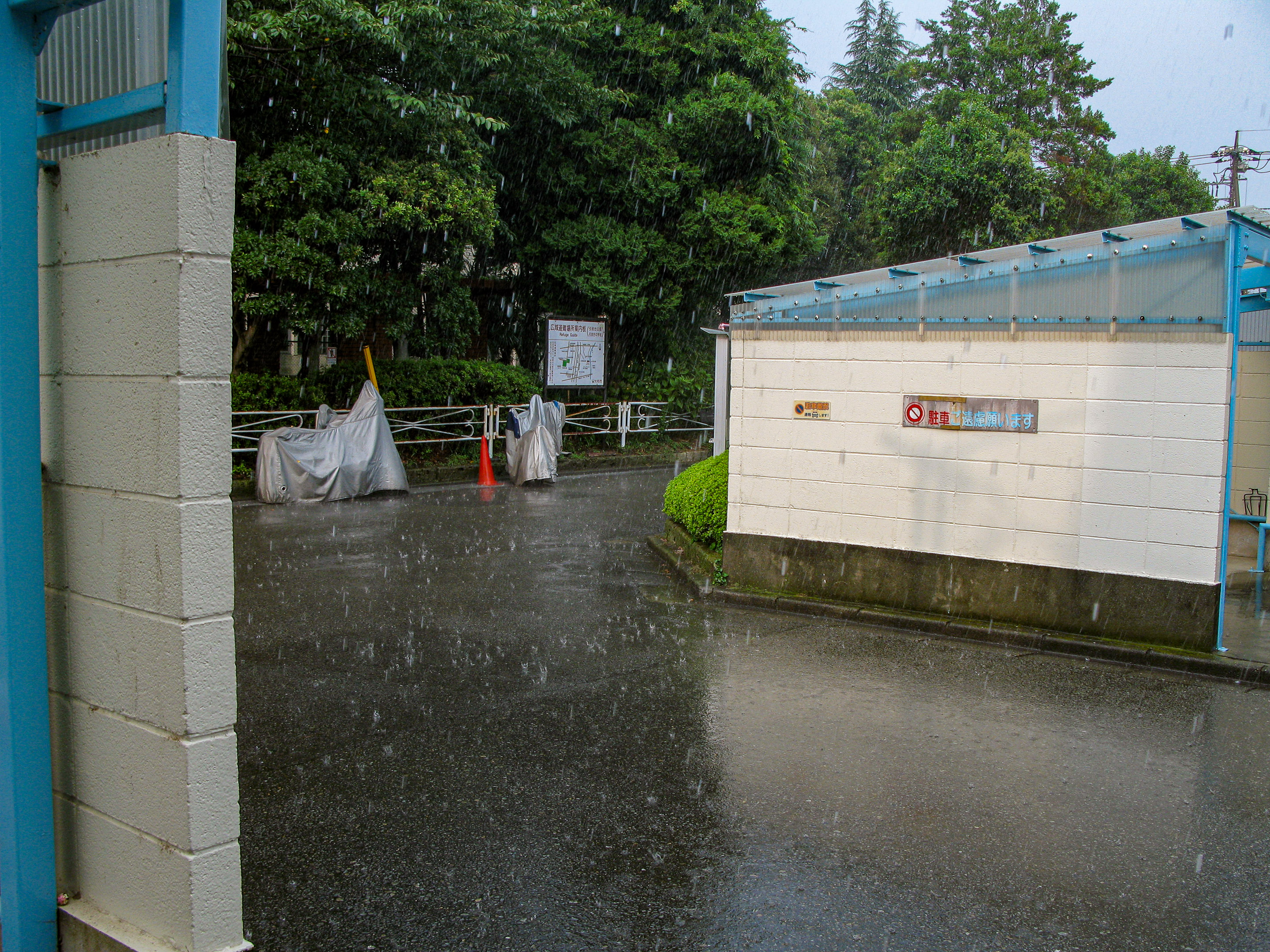 想定外の雨が降り出しました 昨今の天気はどうなるかわかりません とりあえず、公園の木が繁っているとこに避難しました 雨脚はさらに強さを増します ここでは持たない |