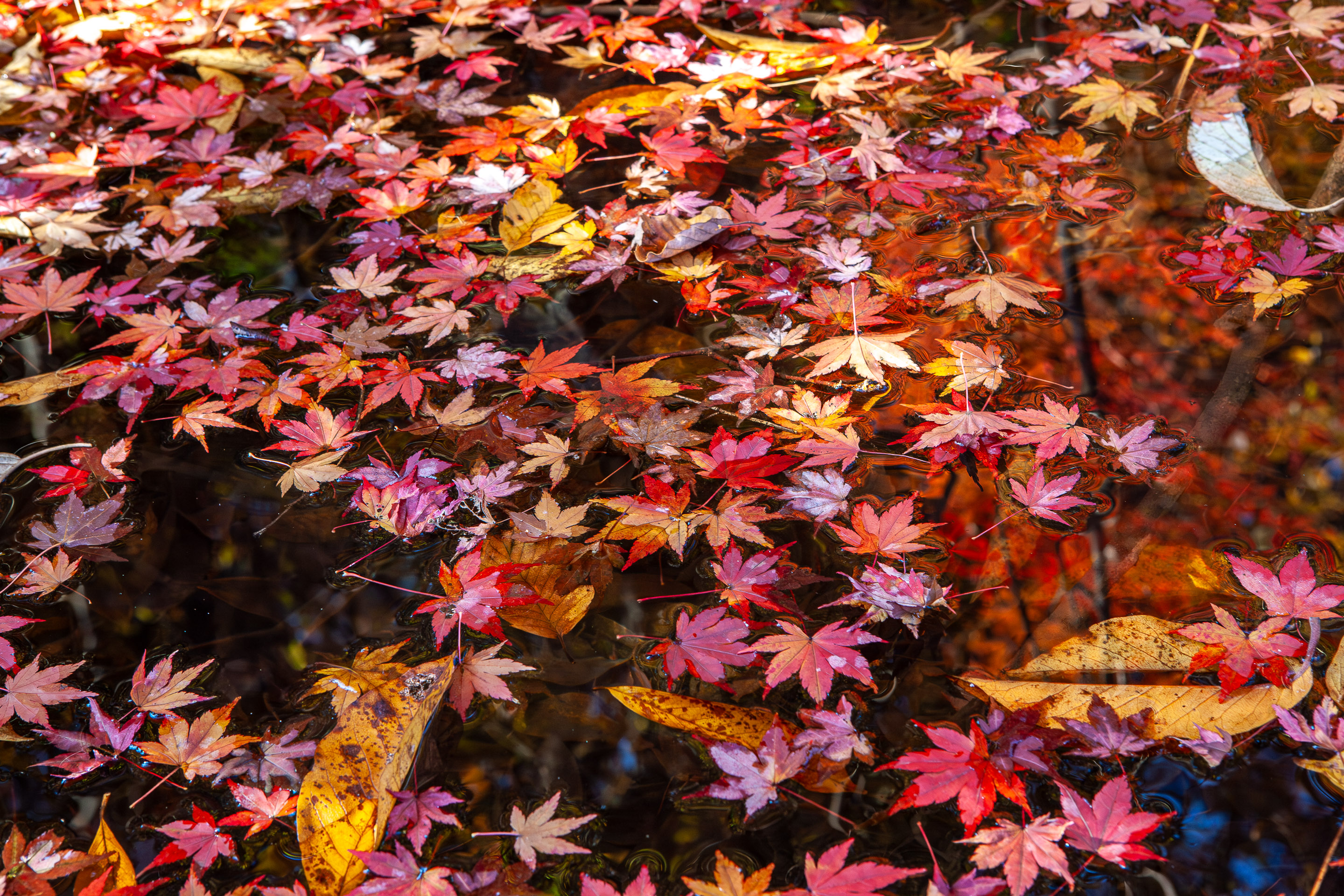 今日は、東京都町田市の薬師池公園です。まだ、モミジが枝についている木もありますが、最盛期は過ぎた感じですね。これからは落葉したモミジを撮っていくタイミングでしょうか。落葉したモミジは、水分を含んだ状態でないと、葉が縮んでしまい、美しくありません。雨の降った翌日や日陰、そして水の中、ということになりますね。今日はそんなモミジを求めてみました。(EOS
