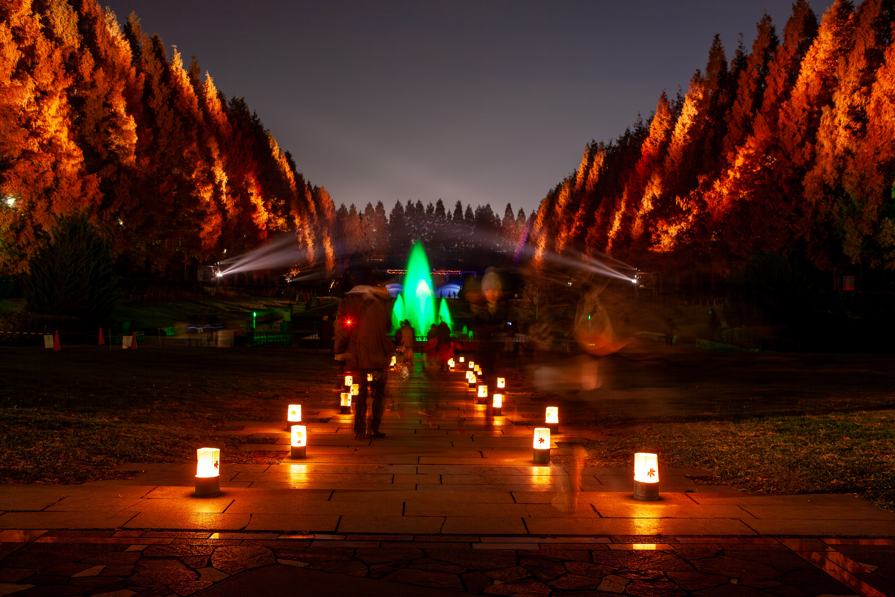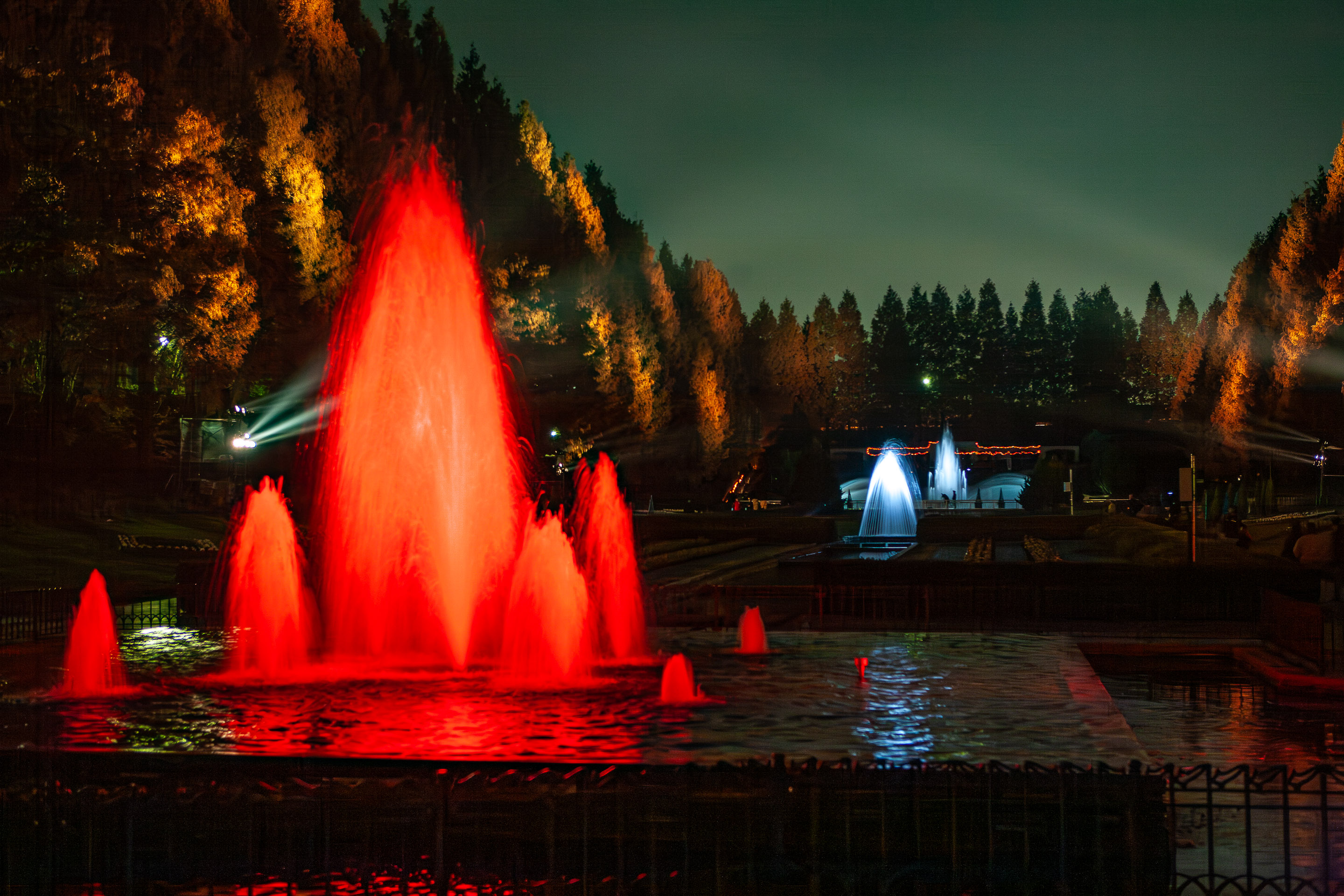 緑色の炎のように見えるのは、噴水に色を変えてライトを当てているのですね