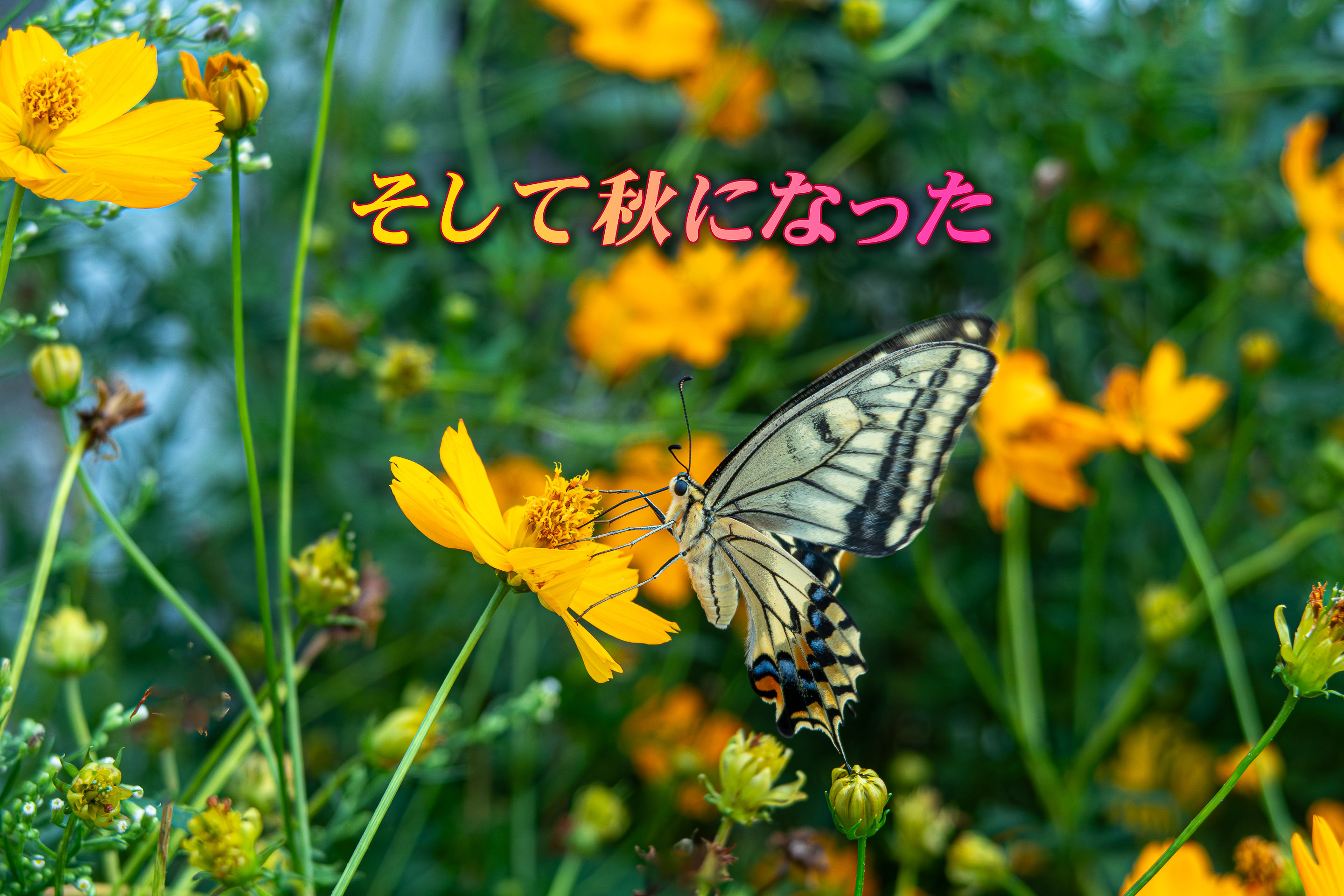 キバナコスモスにキアゲハが蜜を吸いに来ている