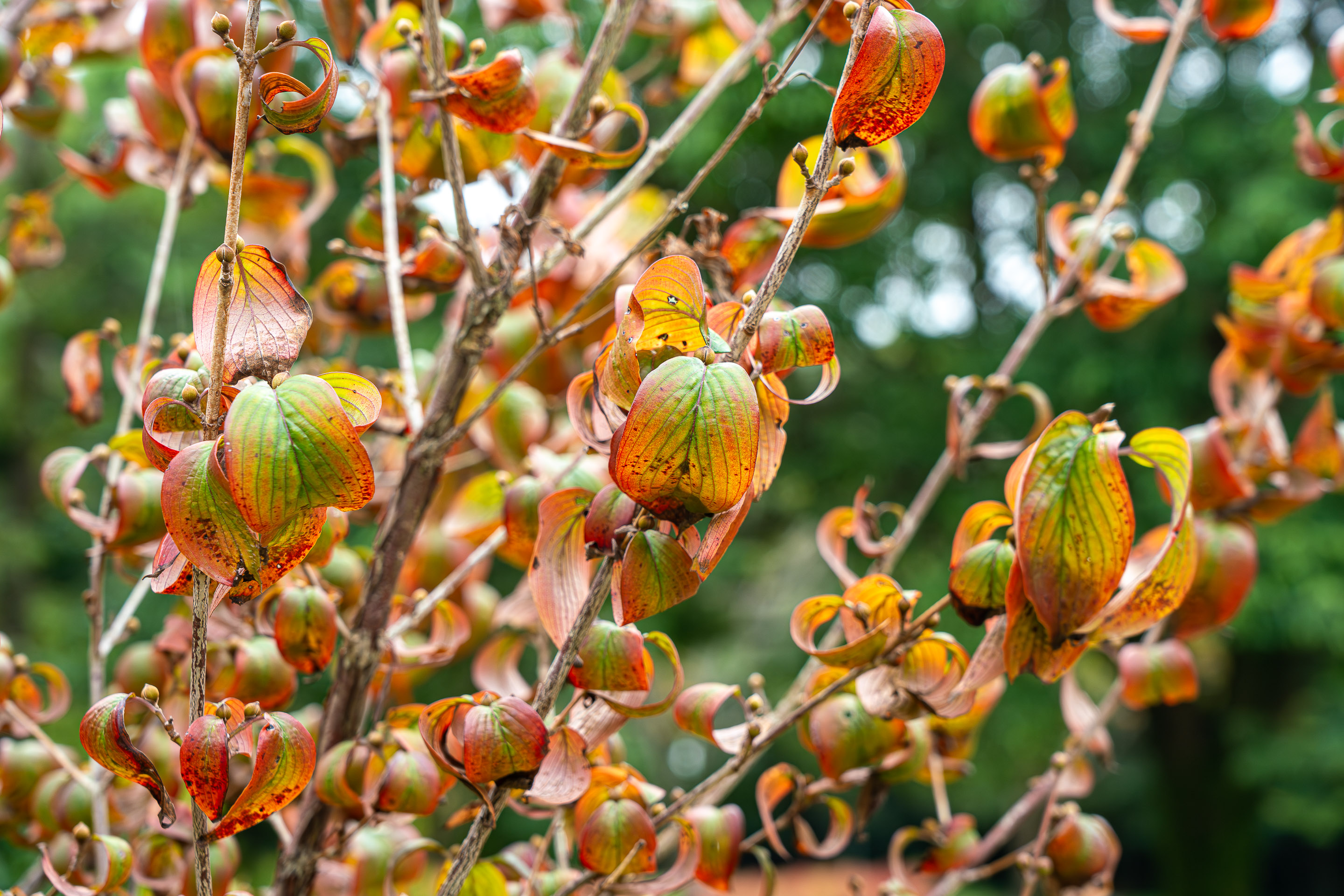 春には黄色の花を咲かせるサンシュユが紅葉し始めていた