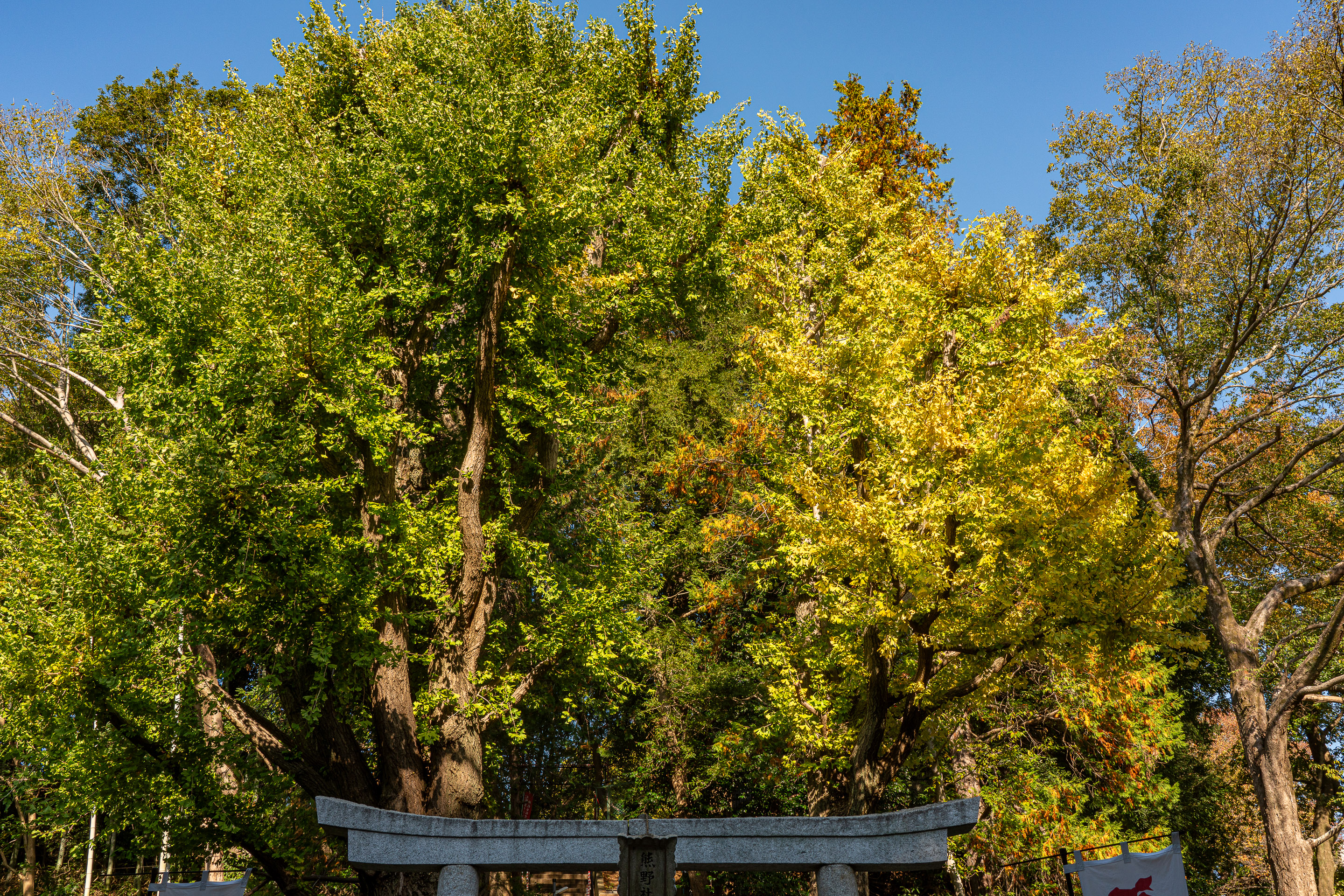 剪定された神社のイチョウの木は日の当たる東西で黄葉の進行が違う