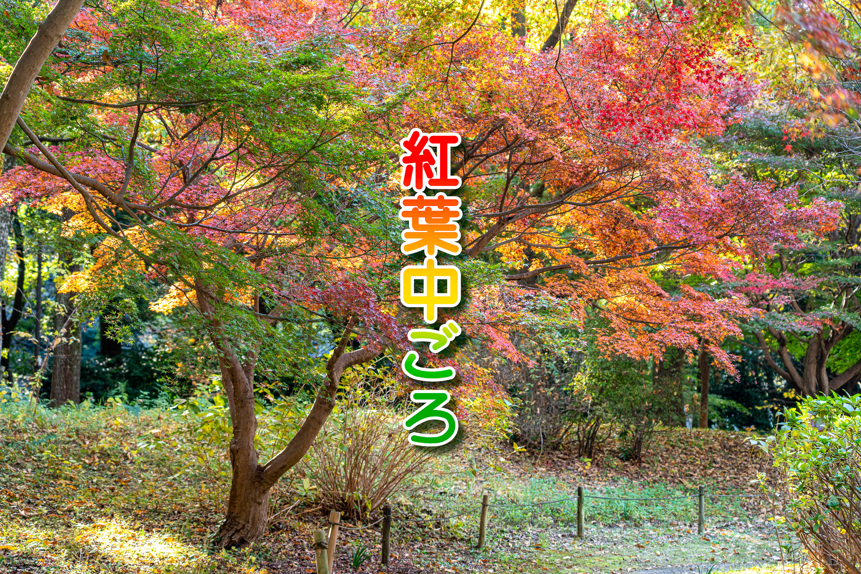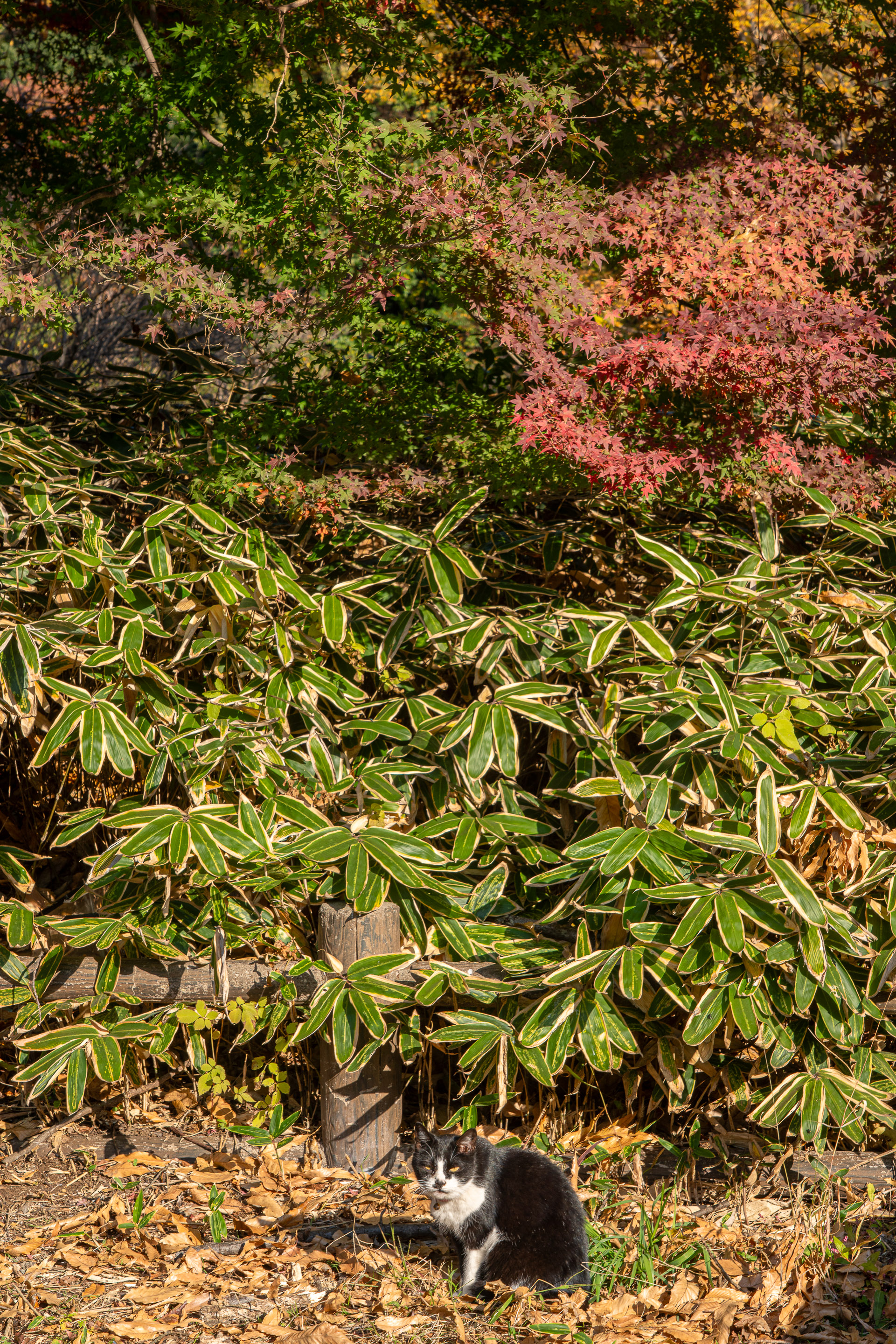 紅葉するモミジと笹の葉をバックに「あったかいにゃぁ」