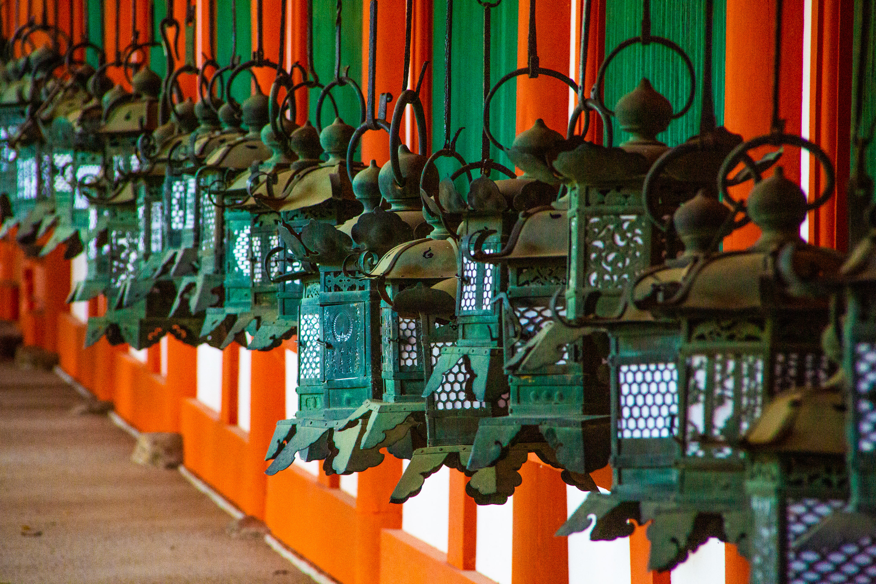 春日大社のこの釣燈籠も有名だ。石燈籠も含め、約3000基あって、8月の中元万燈籠には一斉に灯が入れられる。この優美なスタイルが春日大社独特のようである。側面部分の文字や模様の透かし飾りが美しい。