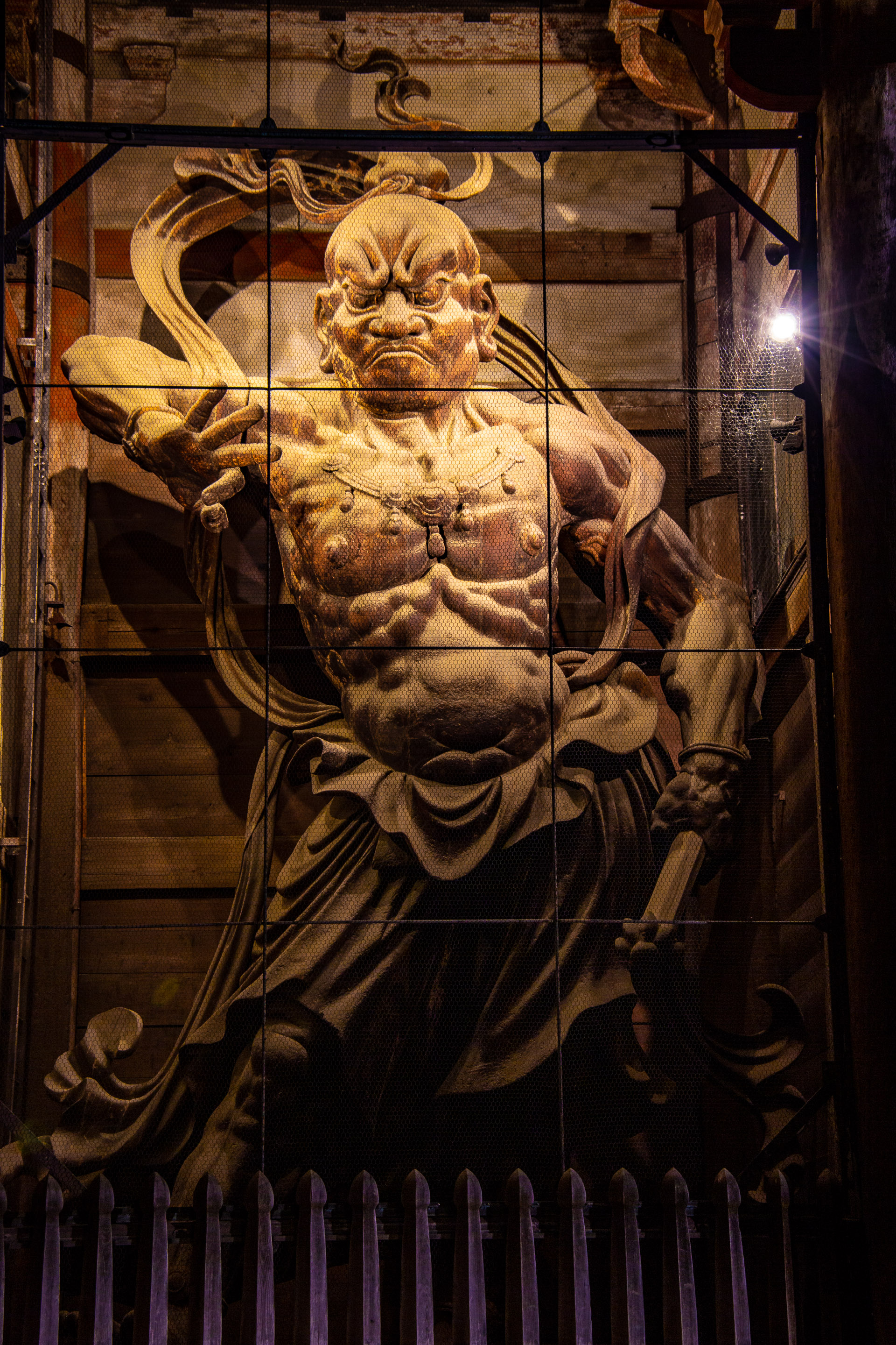 南大門の両脇にある運慶快慶作の仁王像。昼間では、手前の網が邪魔して、まともな像を撮影することは不可能だったが、この夜間照明の効果で立派な像を拝むことができた。こちらは、門に向かって右側の吽形像。